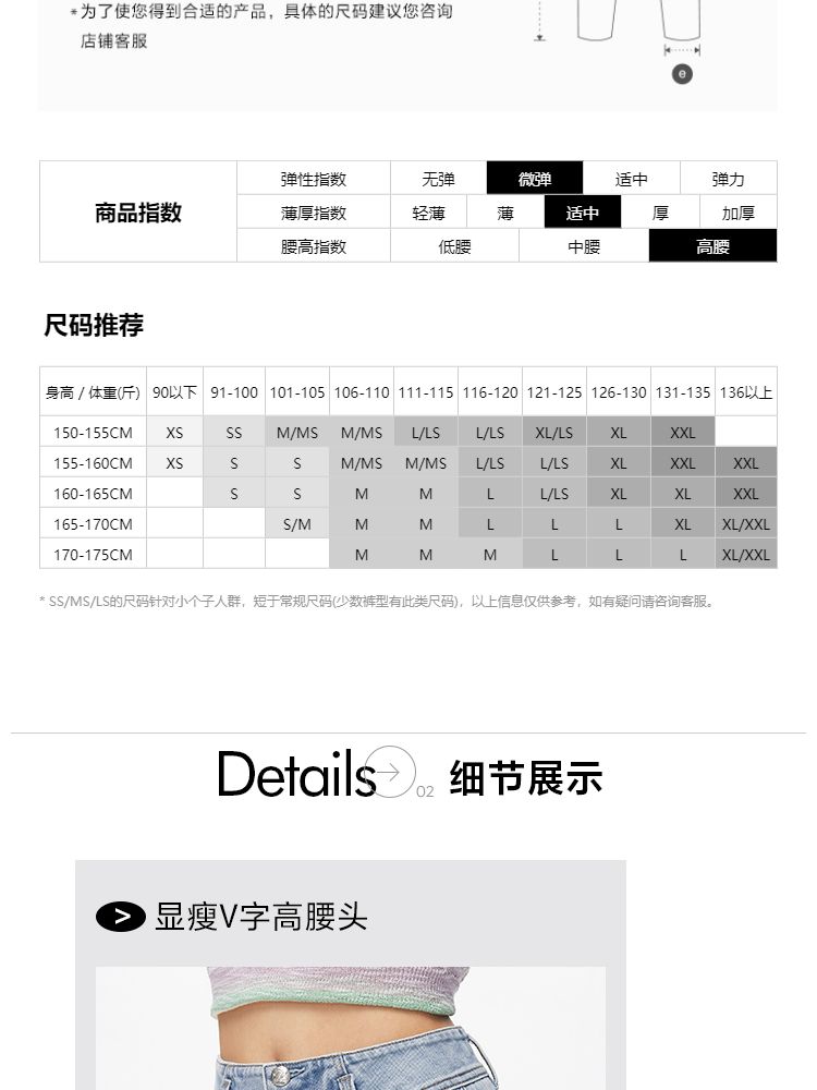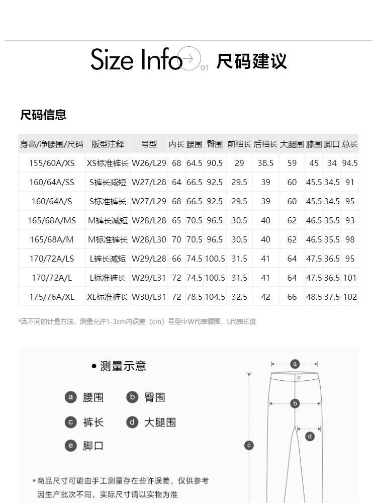 | XS(标准裤长) | 59 | 64.5 | 94.5 | 90.5 | 155/60A |