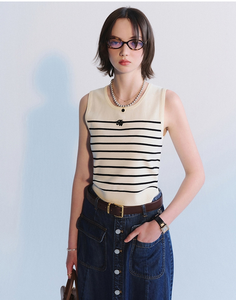 小熊针织T恤夏季针织弹力背心薄款条纹毛衣外穿内搭短款上衣女装 817409