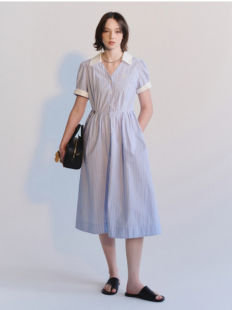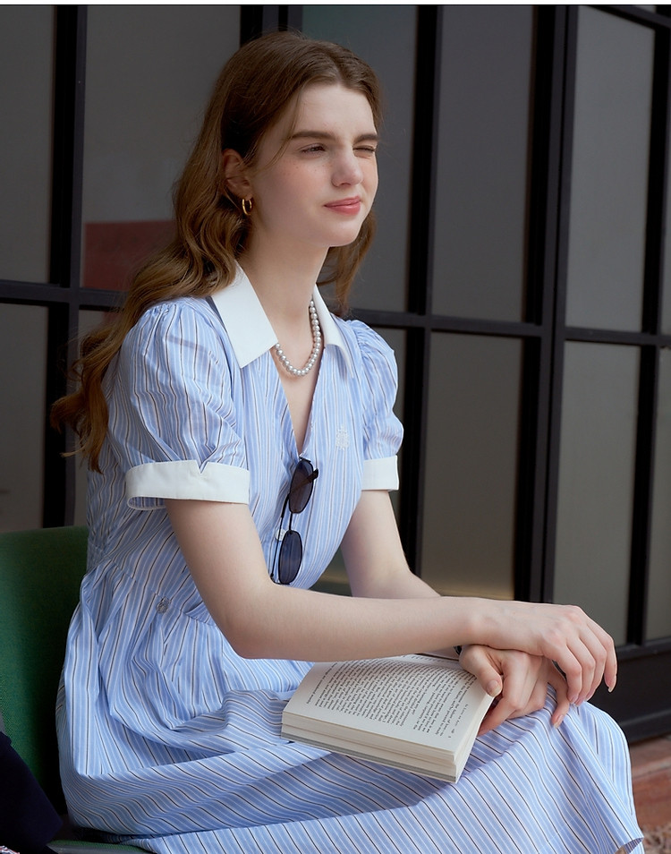 连衣裙女夏季学院风少女V领条纹短袖衬衫领长裙女 345793