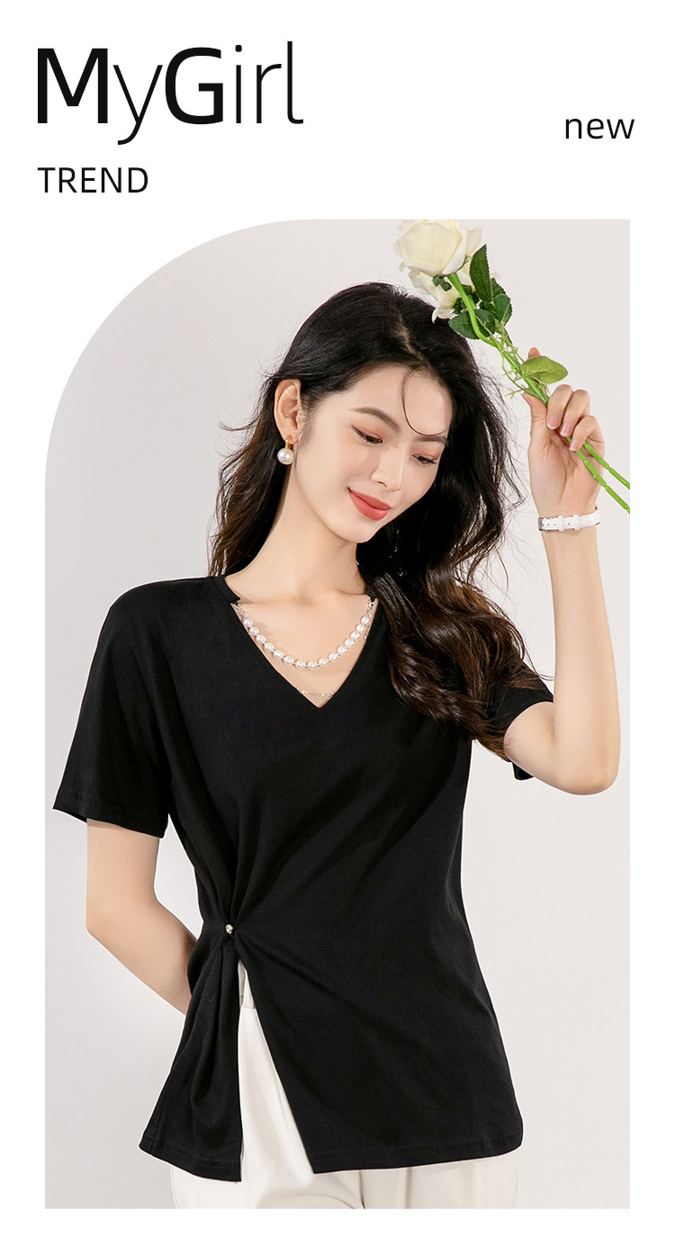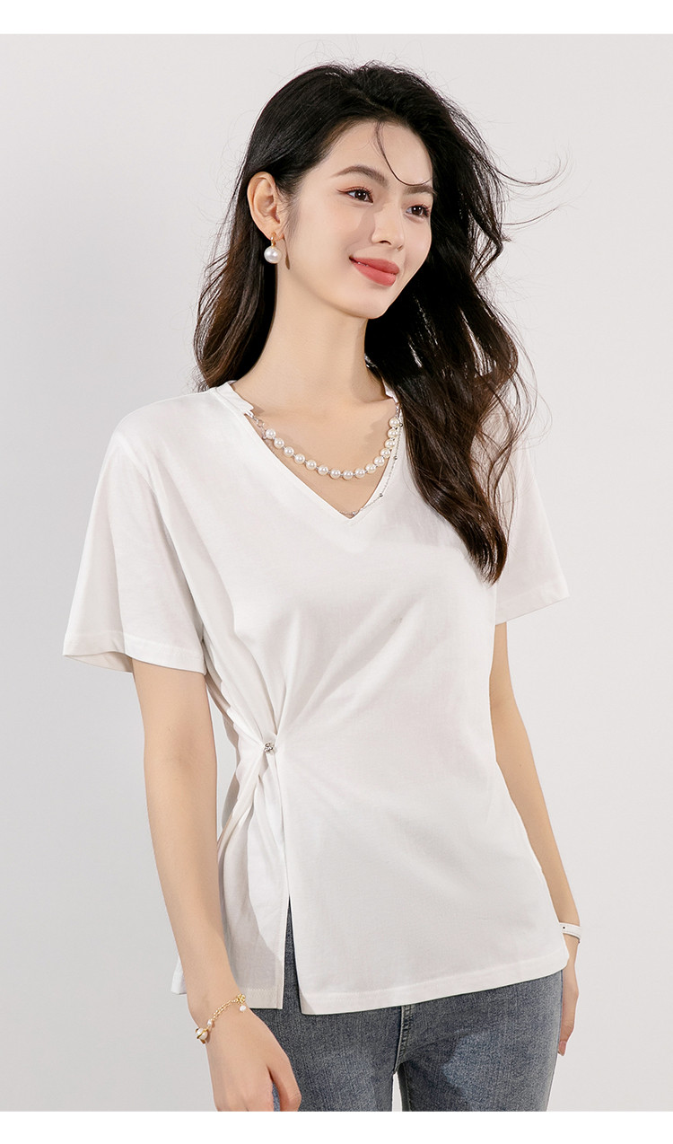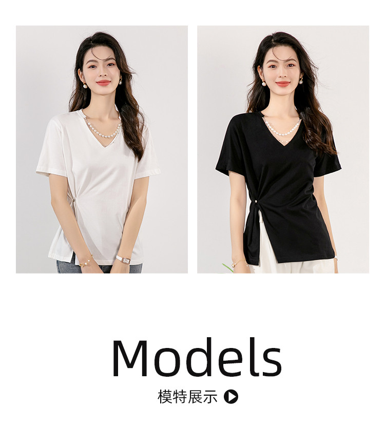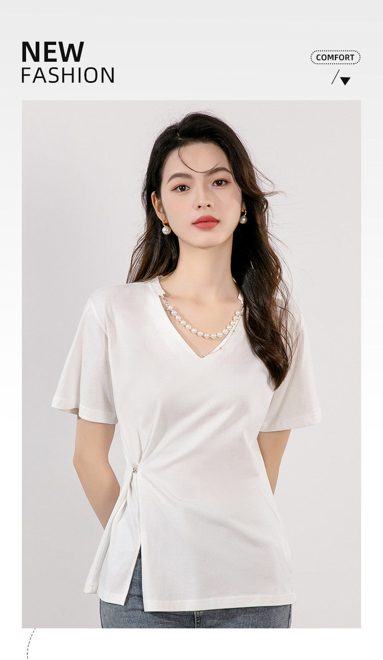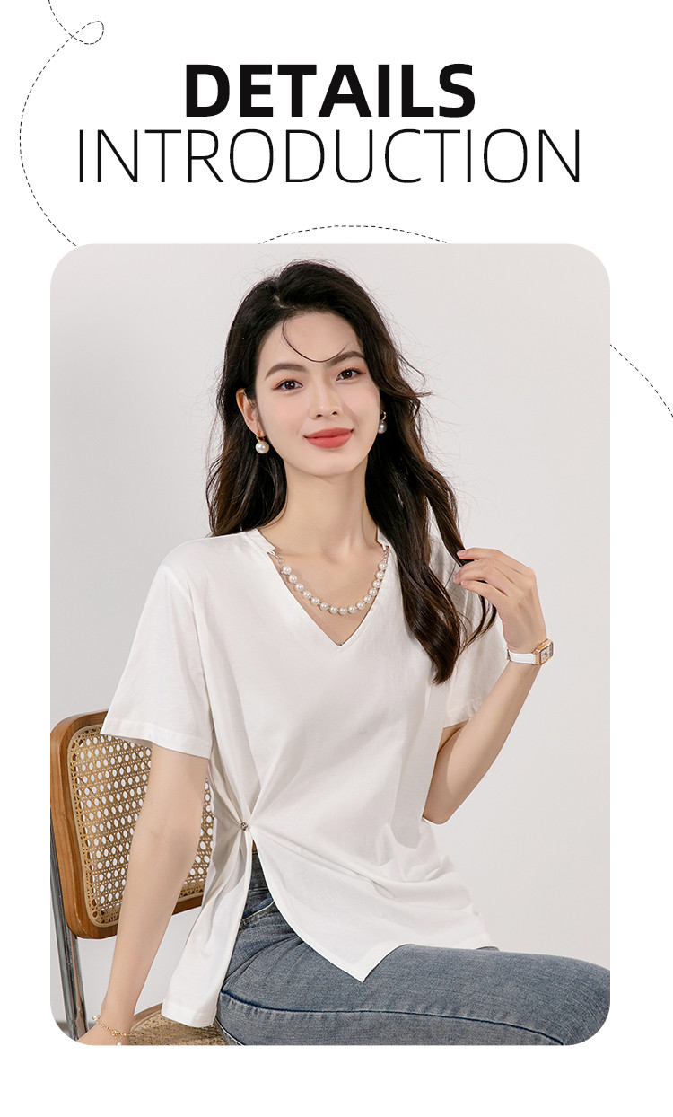 商品名称:夏季时尚扭结设计V领纯色休闲舒适短袖T恤女上衣潮 802840