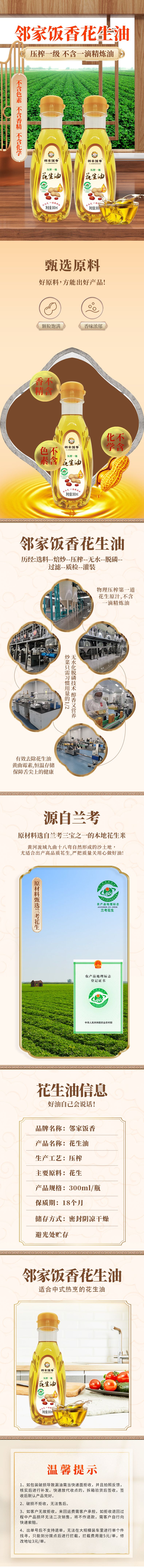 商品名称:邻家饭香 压榨一级花生油 国家地理标志农产品兰考花生压榨 300ml/瓶 LJFX27