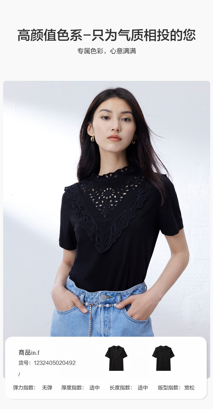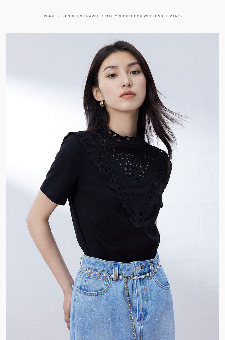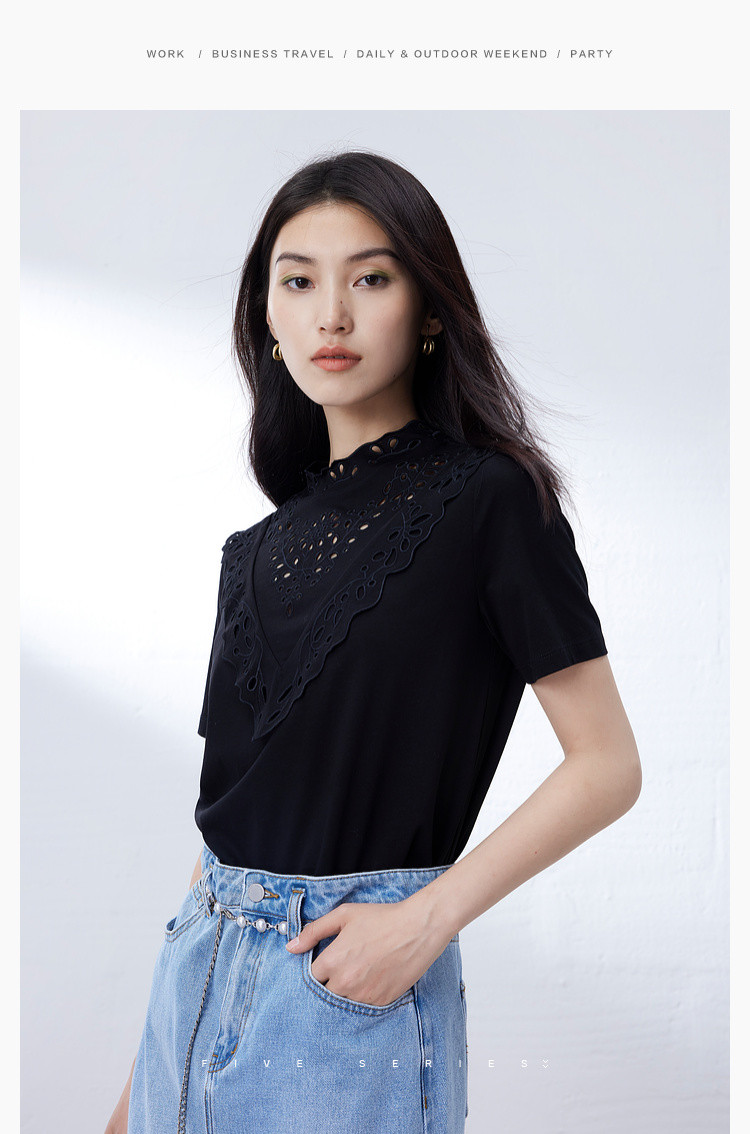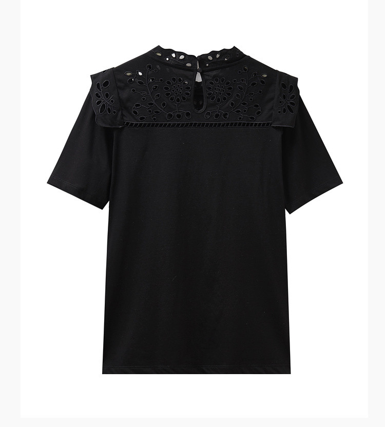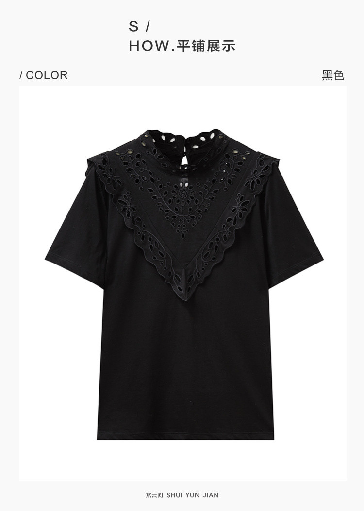 商品名称:气质蕾丝立领短袖T恤女夏季独特设计感百搭通勤镂空纯色衬衫女 432131