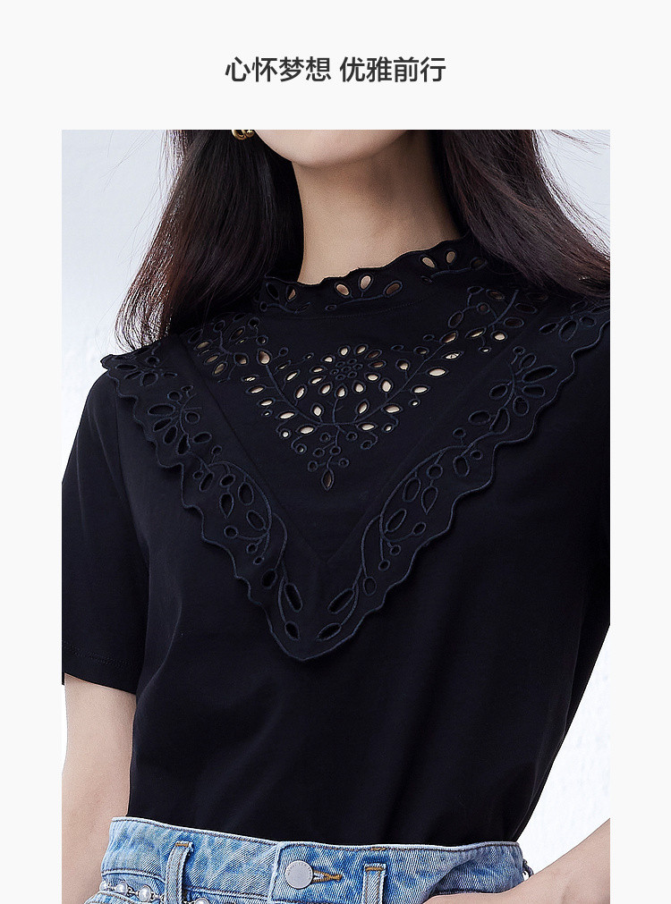 气质蕾丝立领短袖T恤女夏季独特设计感百搭通勤镂空纯色衬衫女 432131