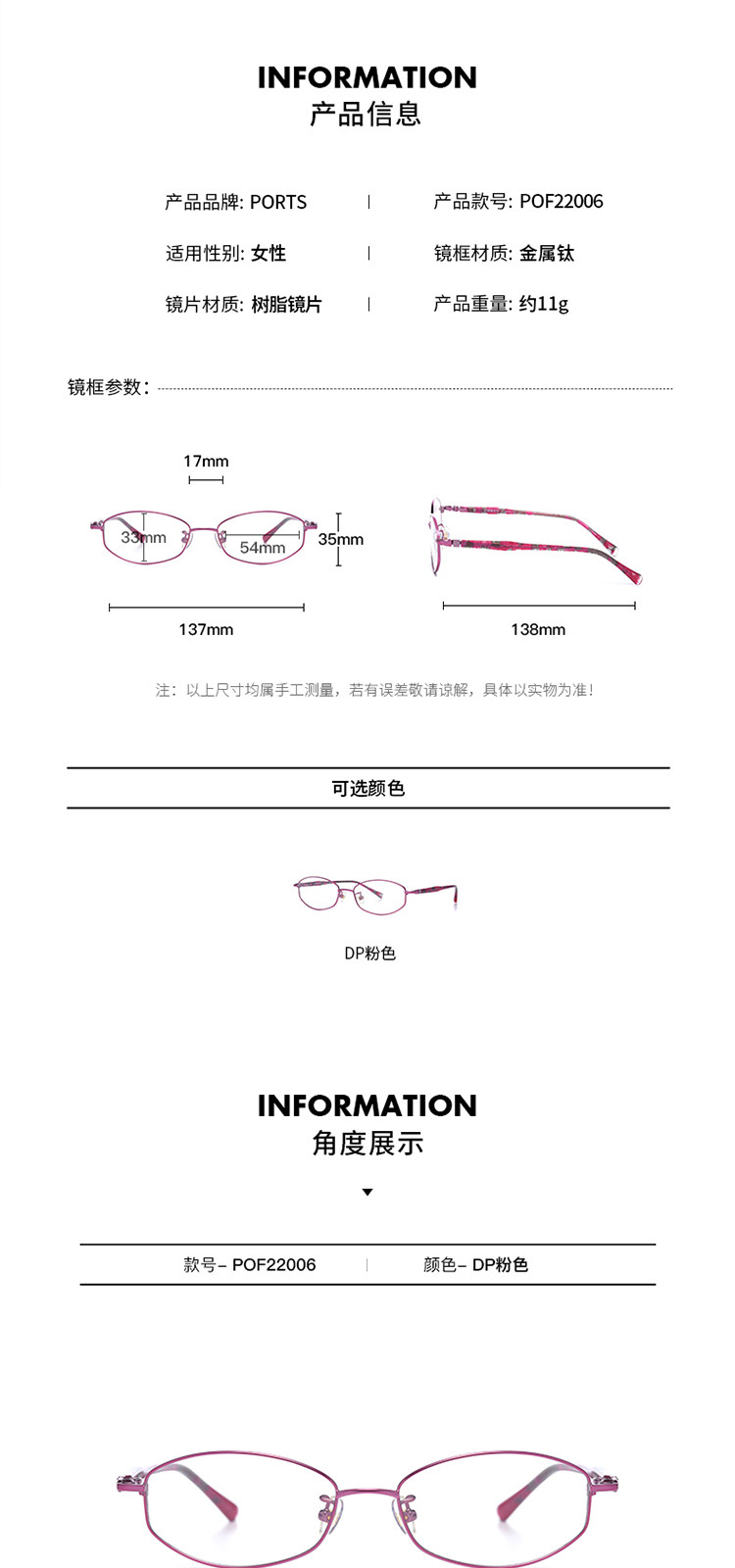 商品名称:PORTS女款经典金属钛女士眼镜全框小框光学架POF22006 894794