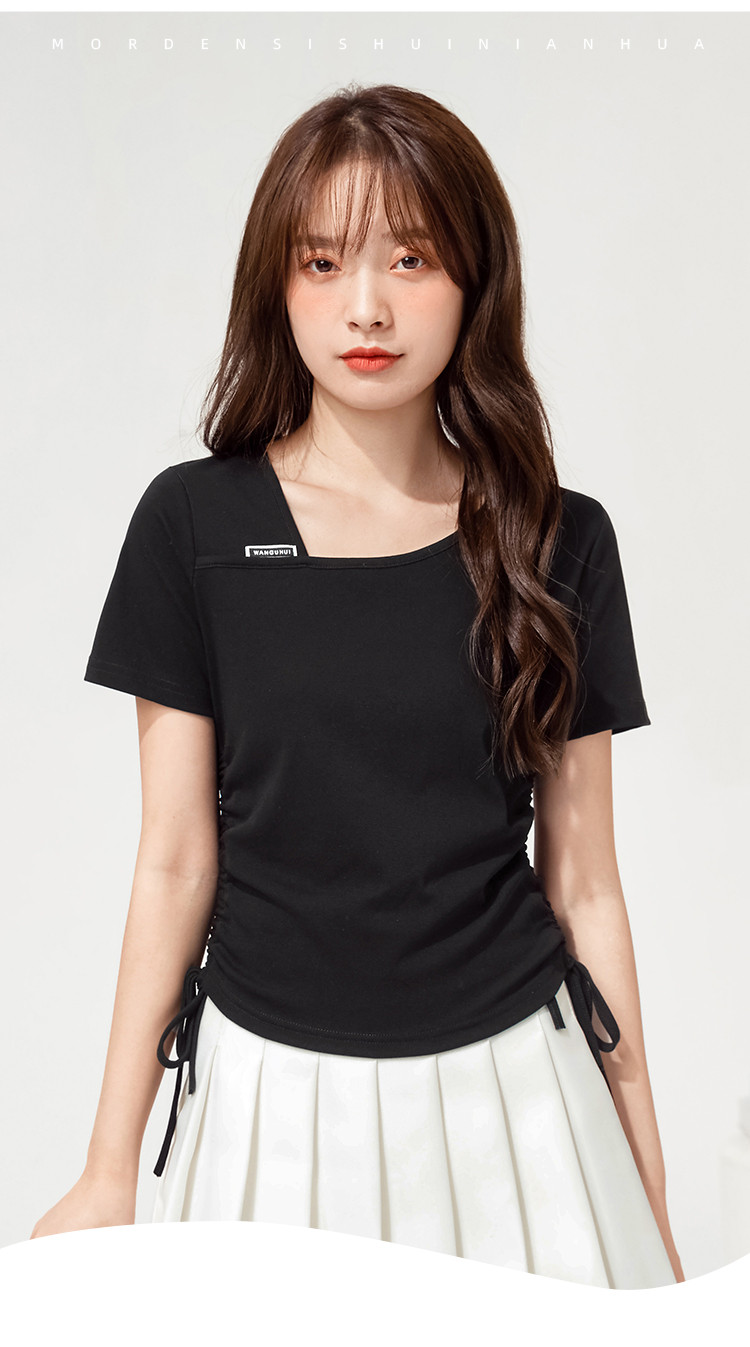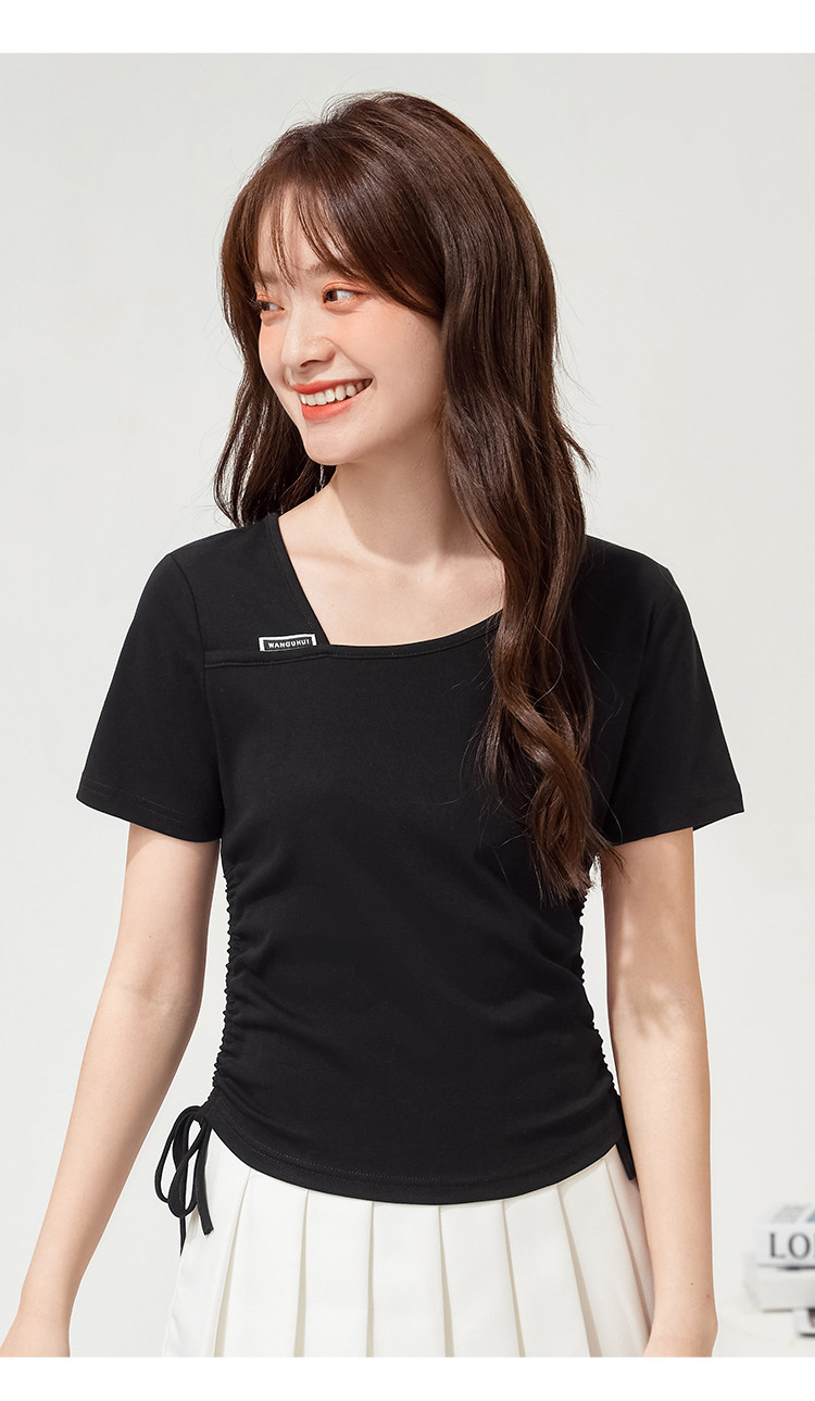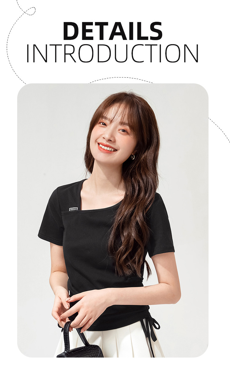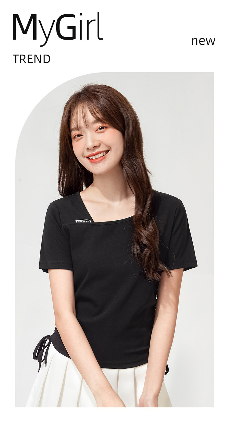 商品名称:休闲舒适不规则大领口短袖t恤女韩版修身显瘦性感抽绳上衣 678360