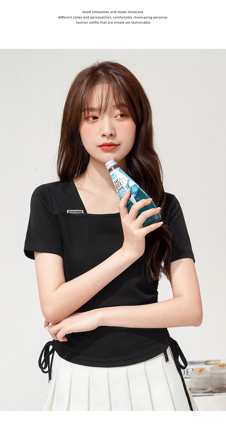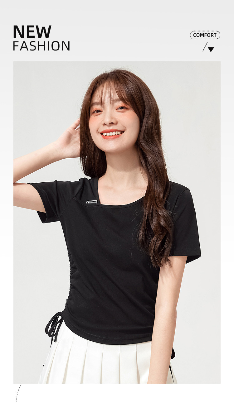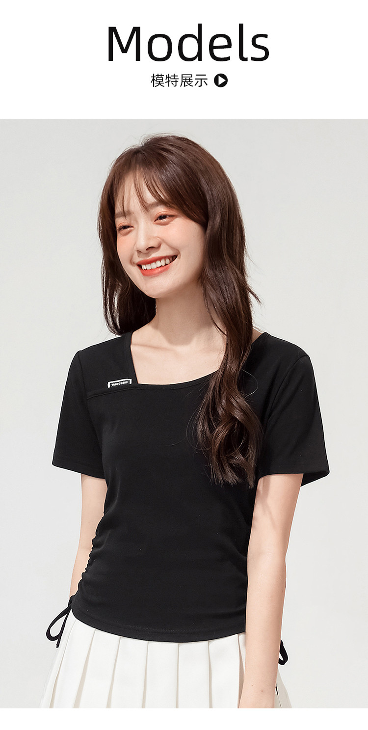 商品名称:休闲舒适不规则大领口短袖t恤女韩版修身显瘦性感抽绳上衣 678360