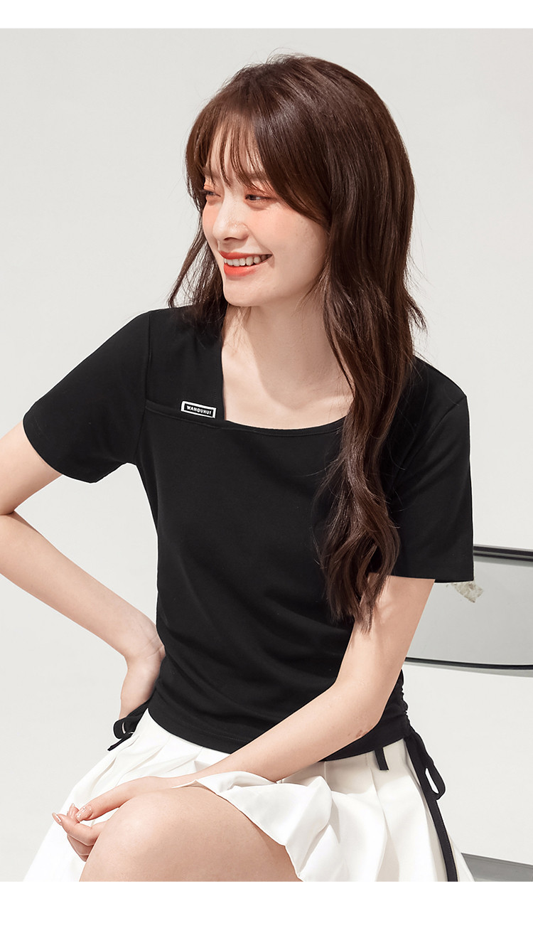 休闲舒适不规则大领口短袖t恤女韩版修身显瘦性感抽绳上衣 678360