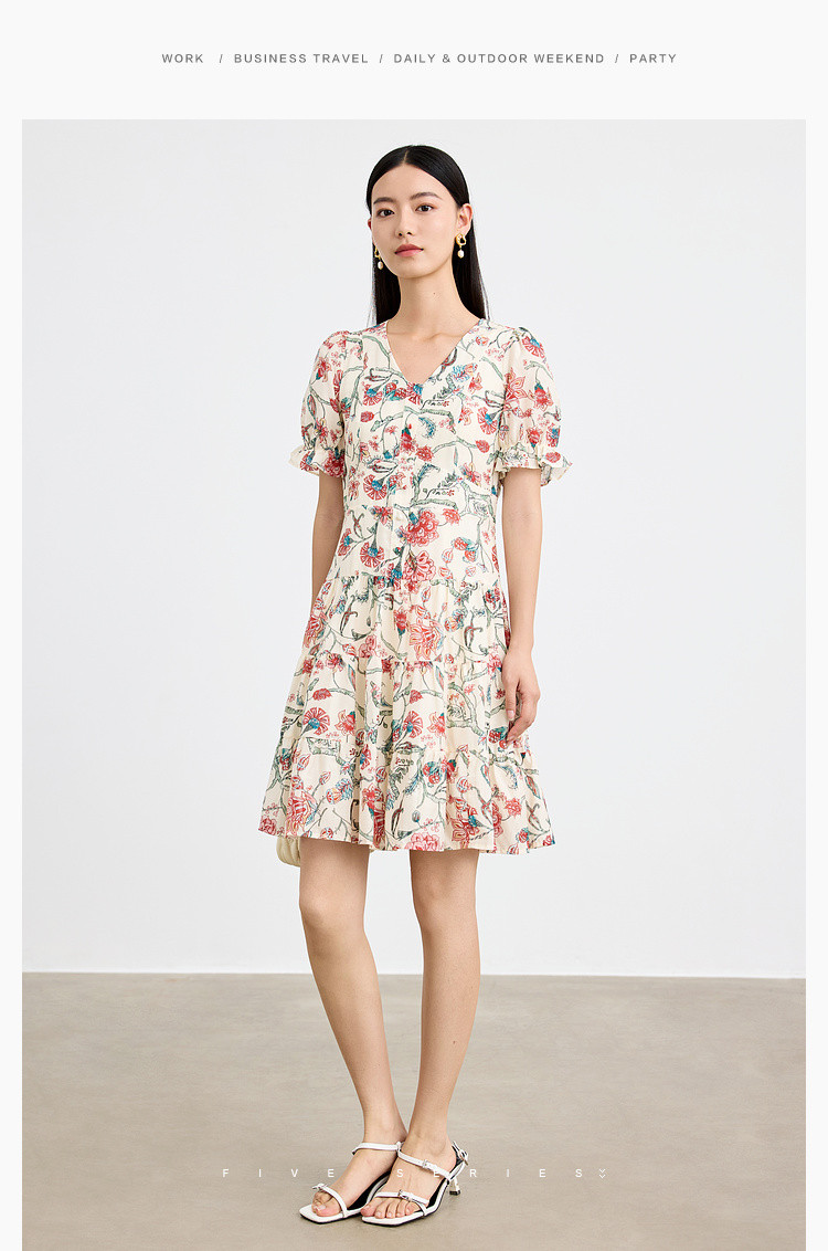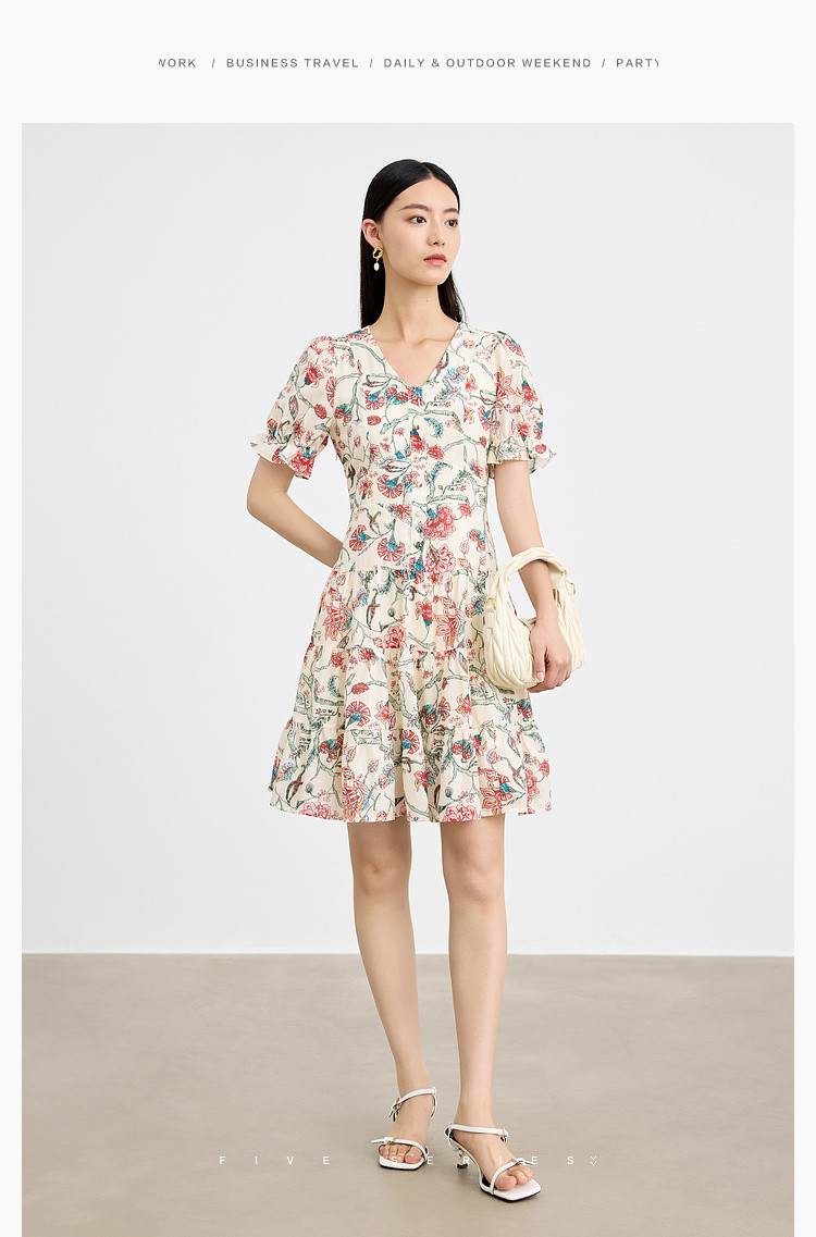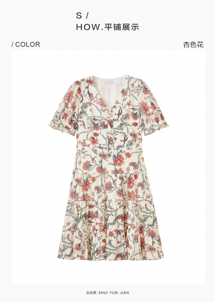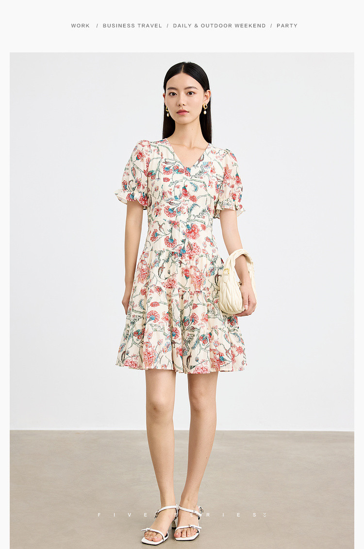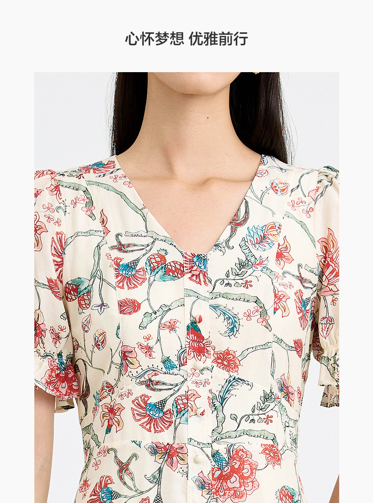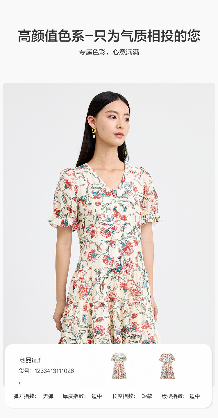 商品名称:浪漫v领印花连衣裙女夏季小众设计感田园风裙子拼接收腰A字裙女 415747