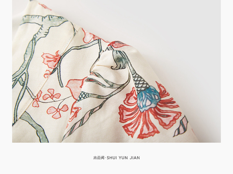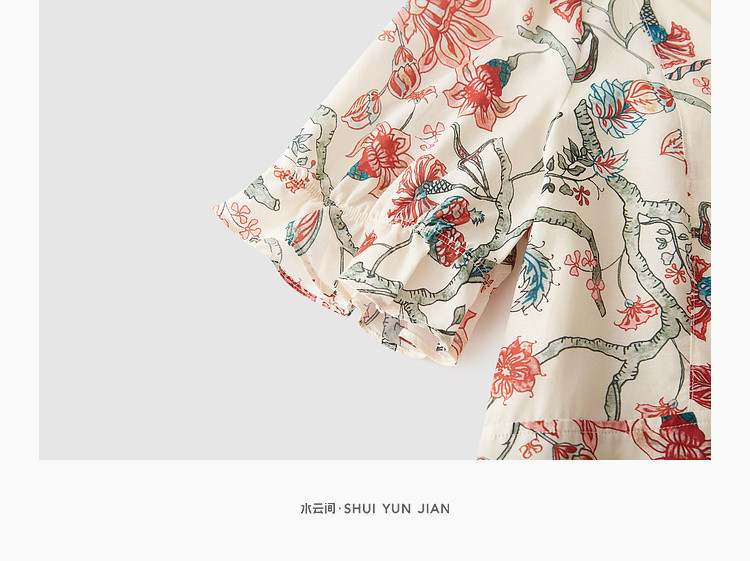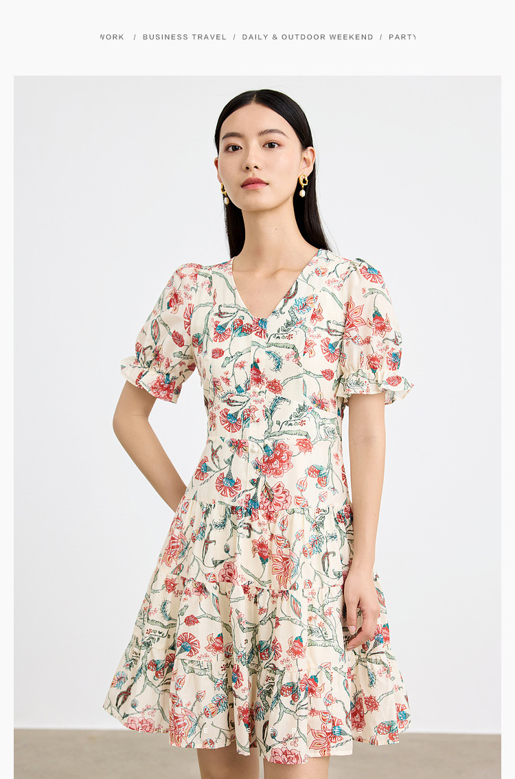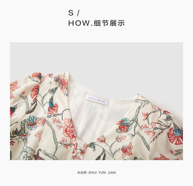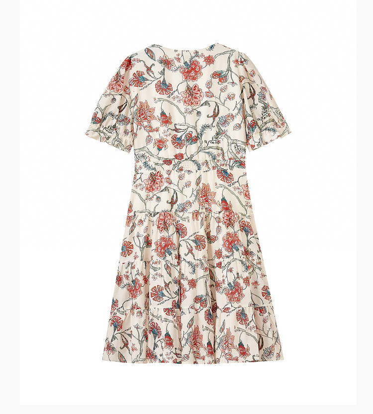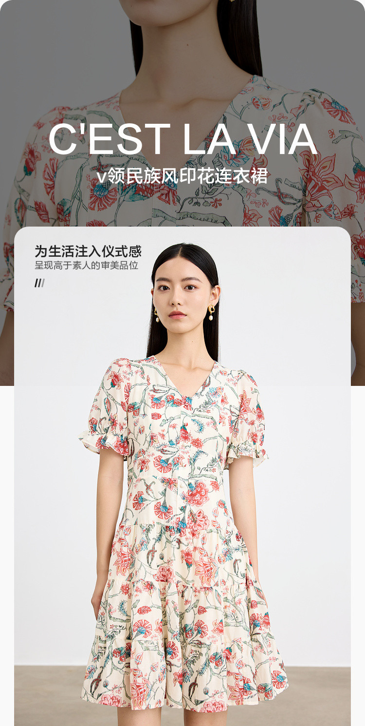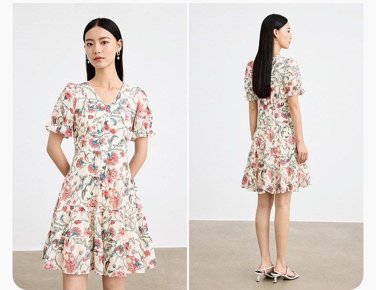 商品名称:浪漫v领印花连衣裙女夏季小众设计感田园风裙子拼接收腰A字裙女 415747