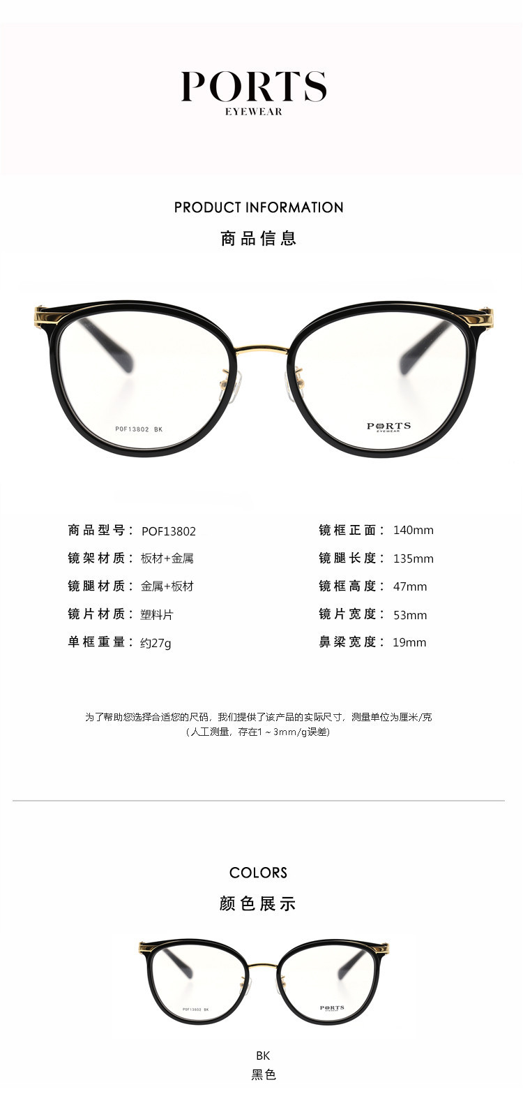 商品名称:PORTS女款经典板材优雅女士全框眼镜光学架POF13802 886602
