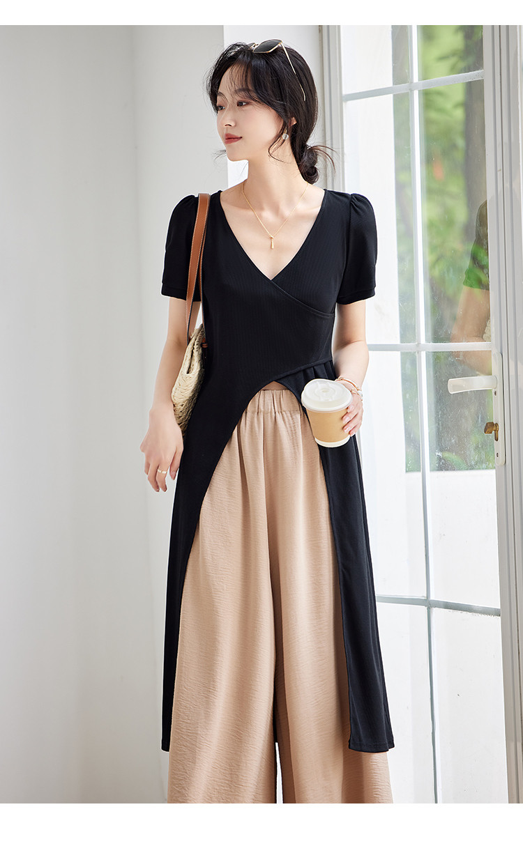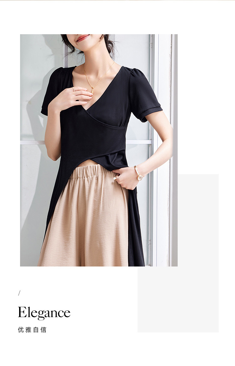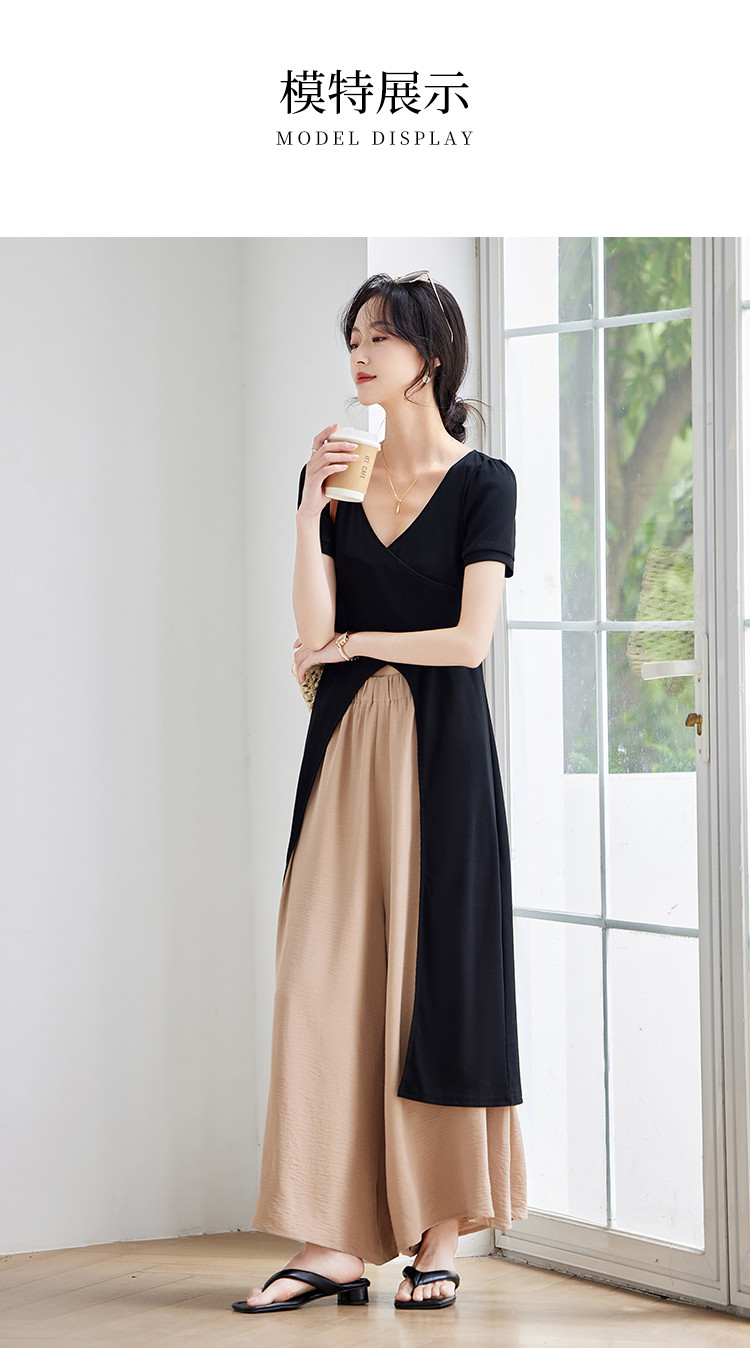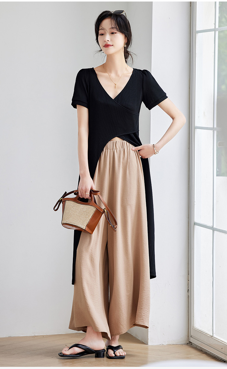 商品名称:休闲套装女2025夏季新款时尚V领轻薄短袖上衣搭阔腿裤两件套 518296