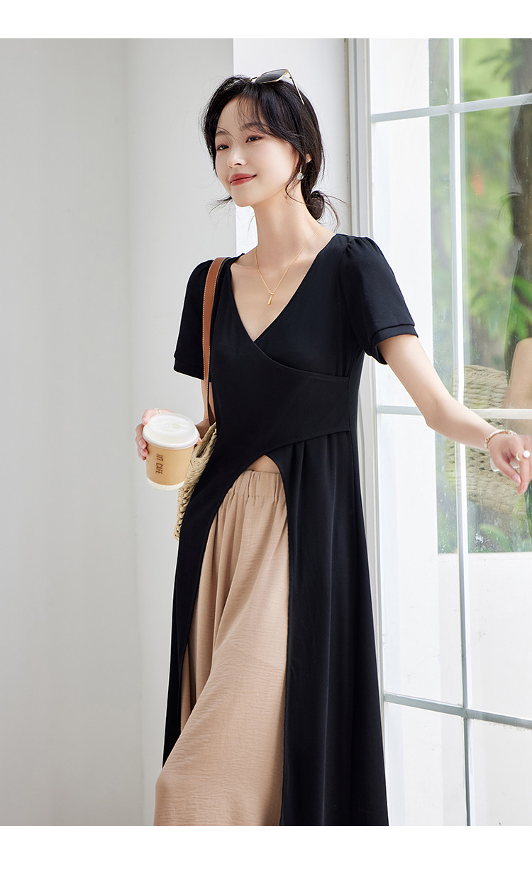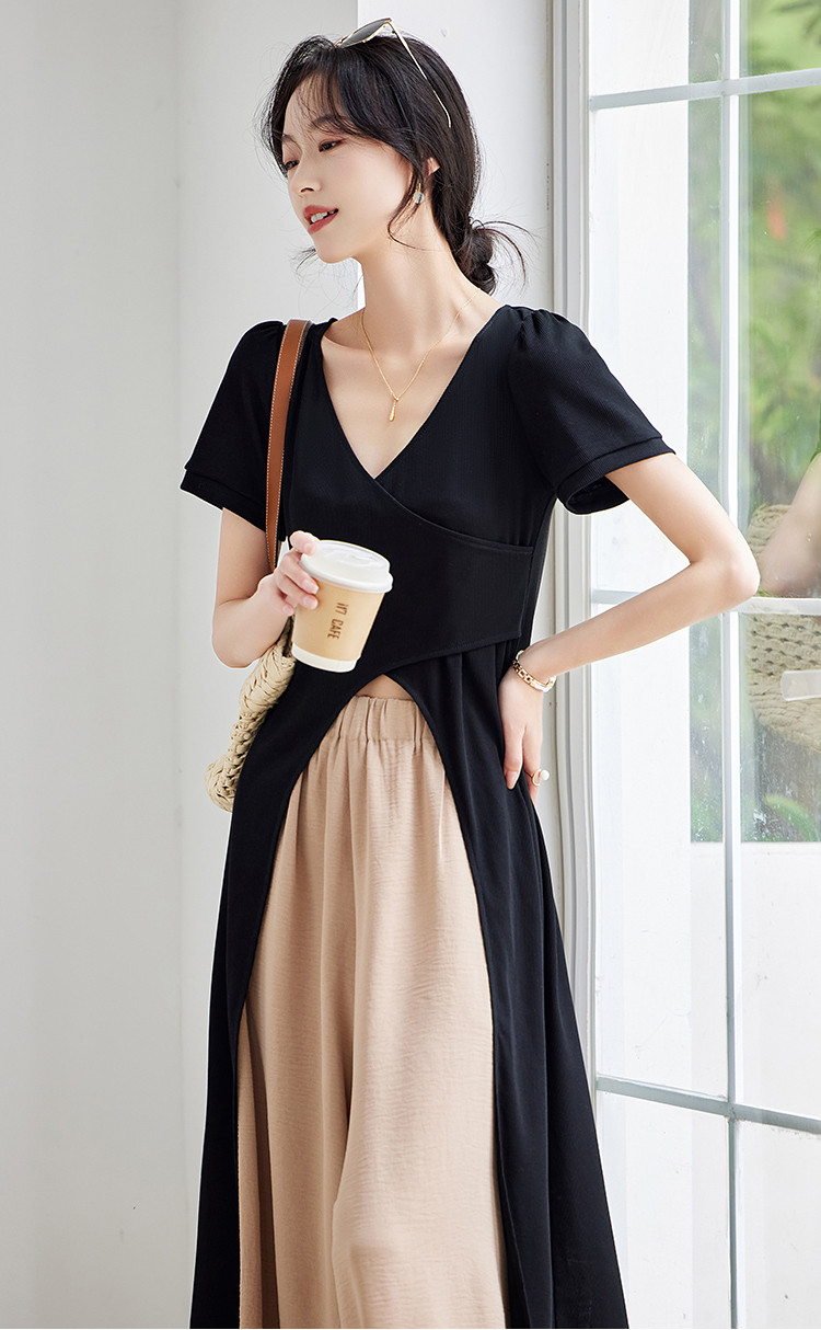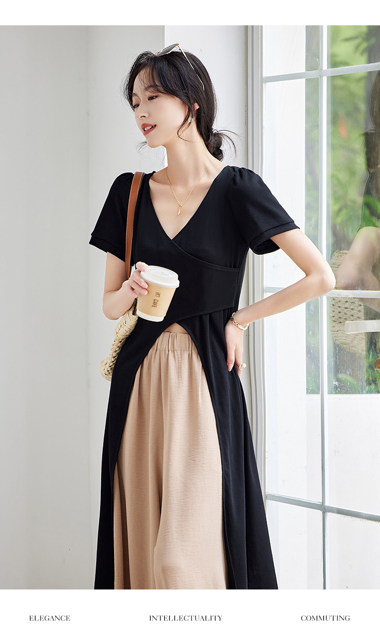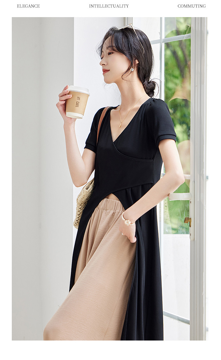商品名称:休闲套装女2025夏季新款时尚V领轻薄短袖上衣搭阔腿裤两件套 518296