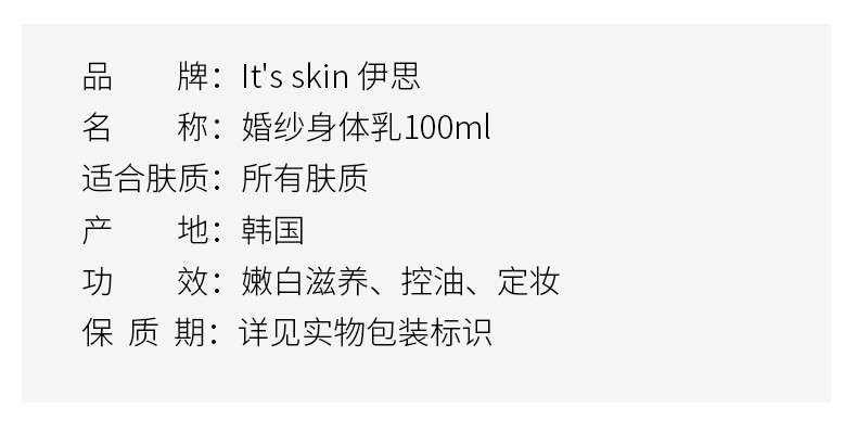 商品名称:It'S Skin/伊思 婚纱身体乳 100ML