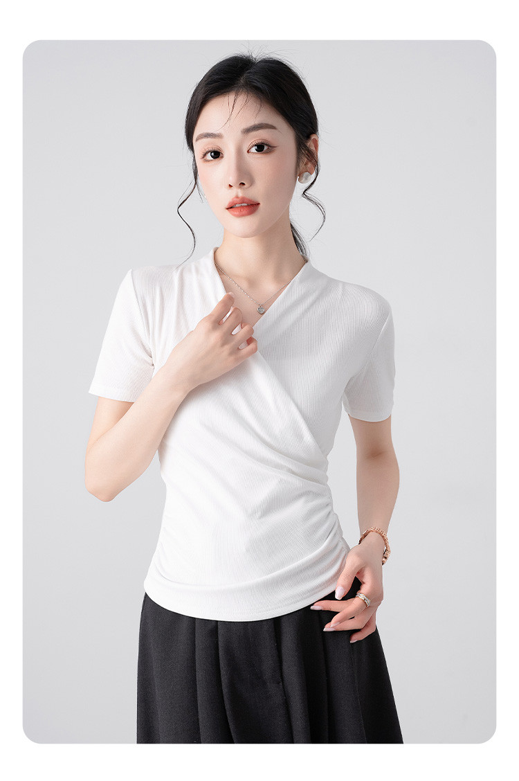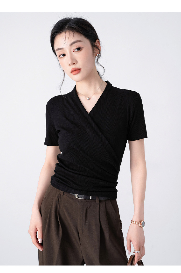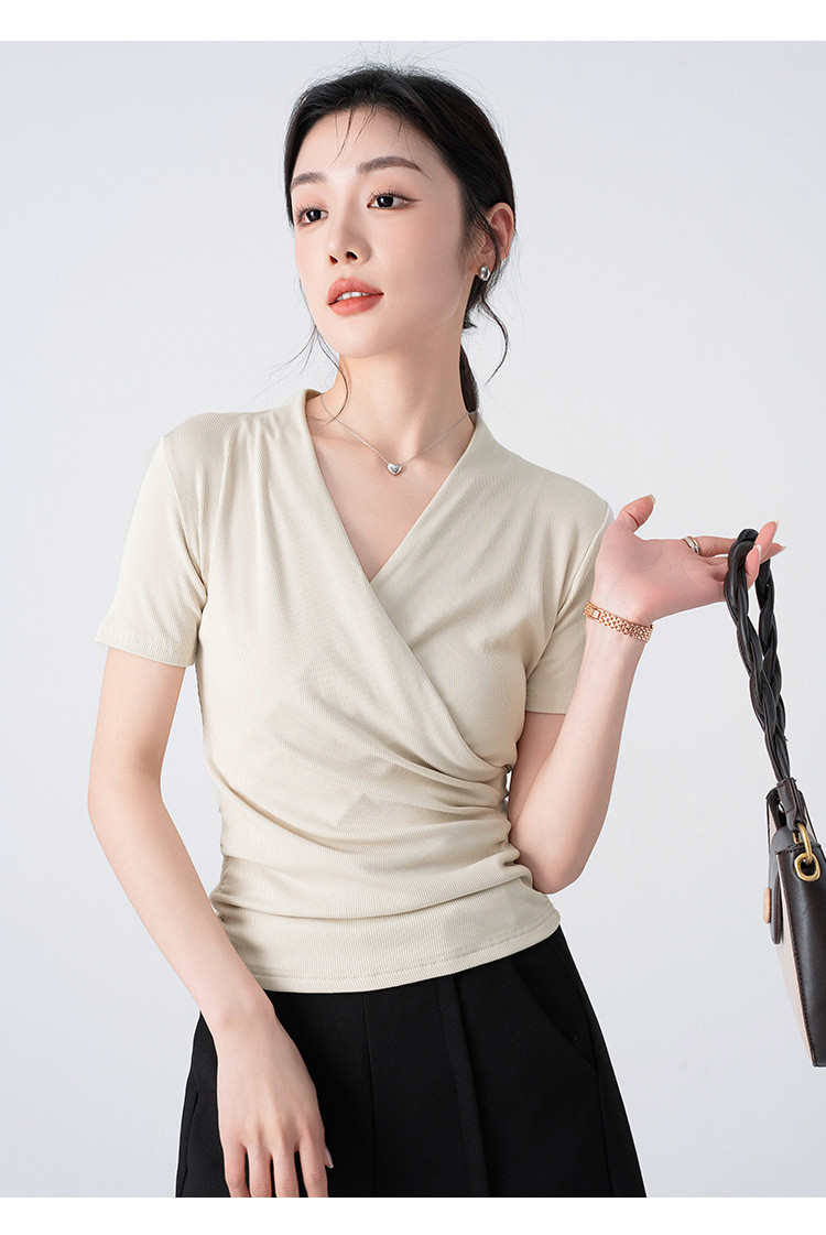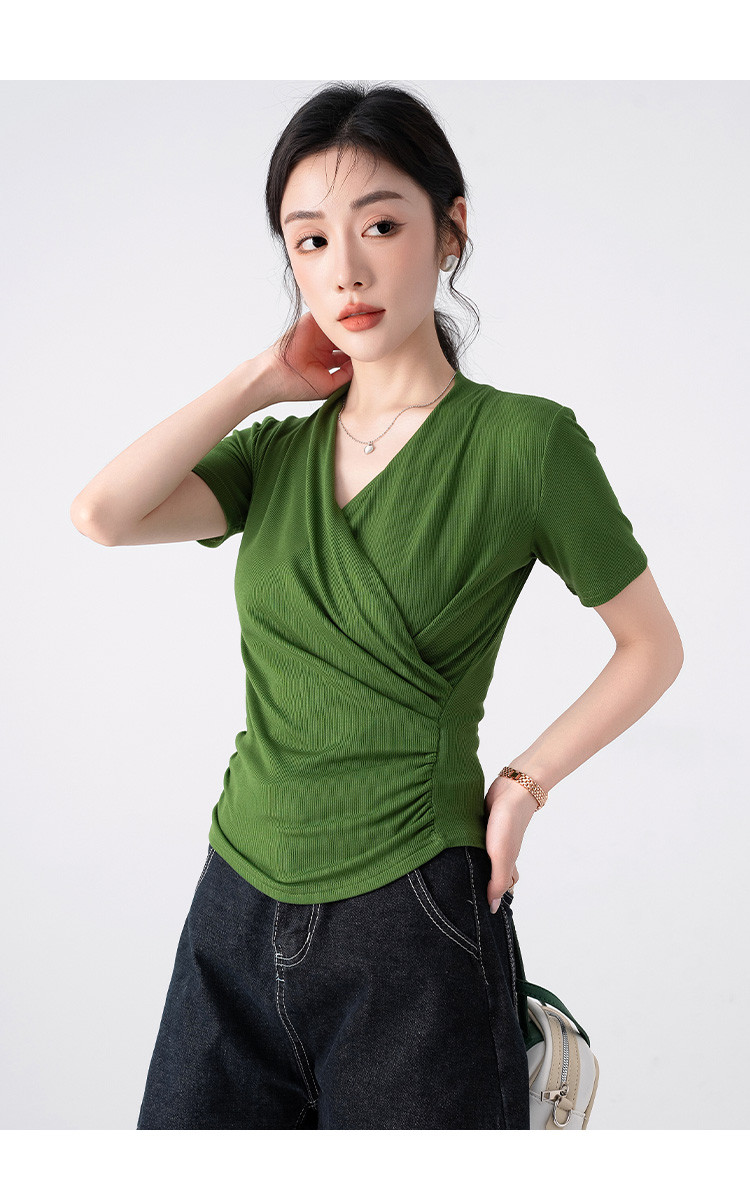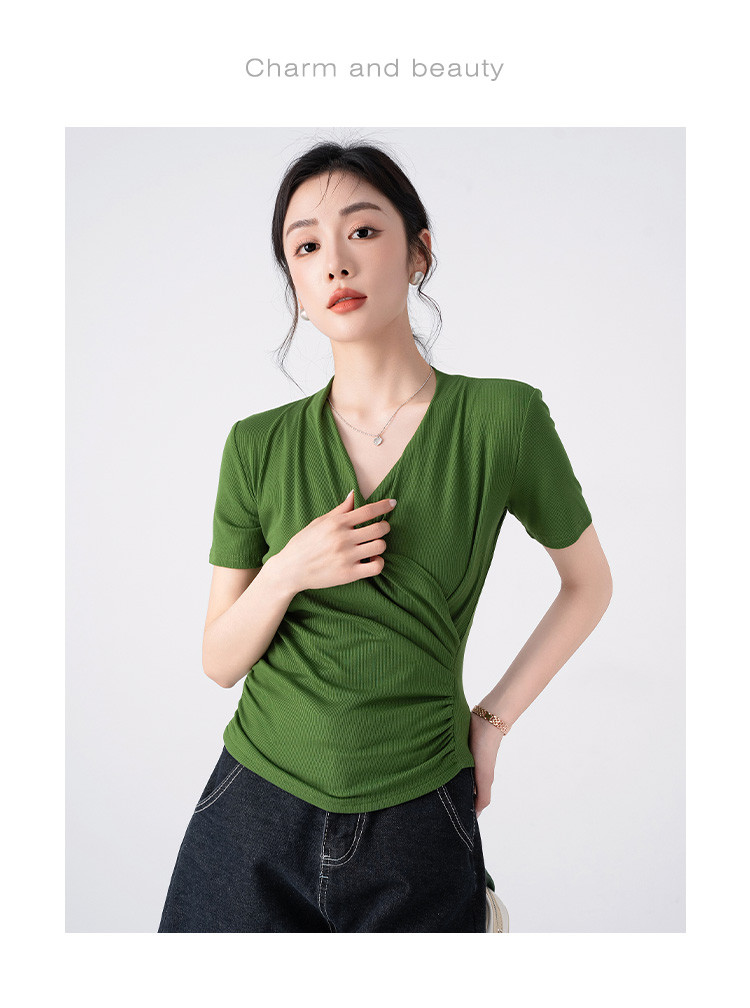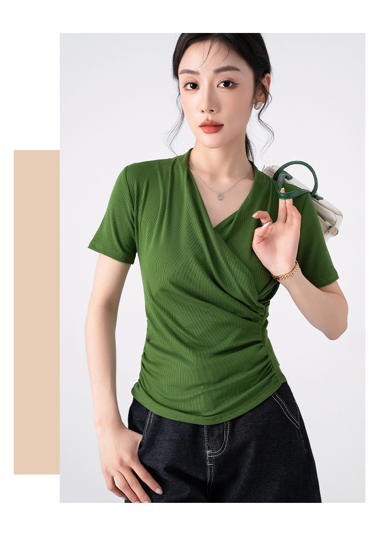 纯色V领交叉短袖T恤女夏季设计感褶皱收腰修身显瘦上衣 116056