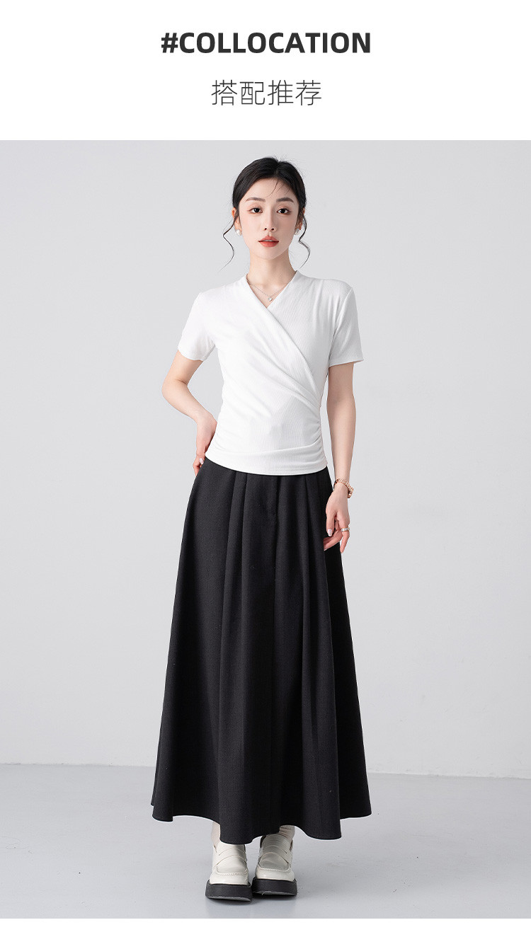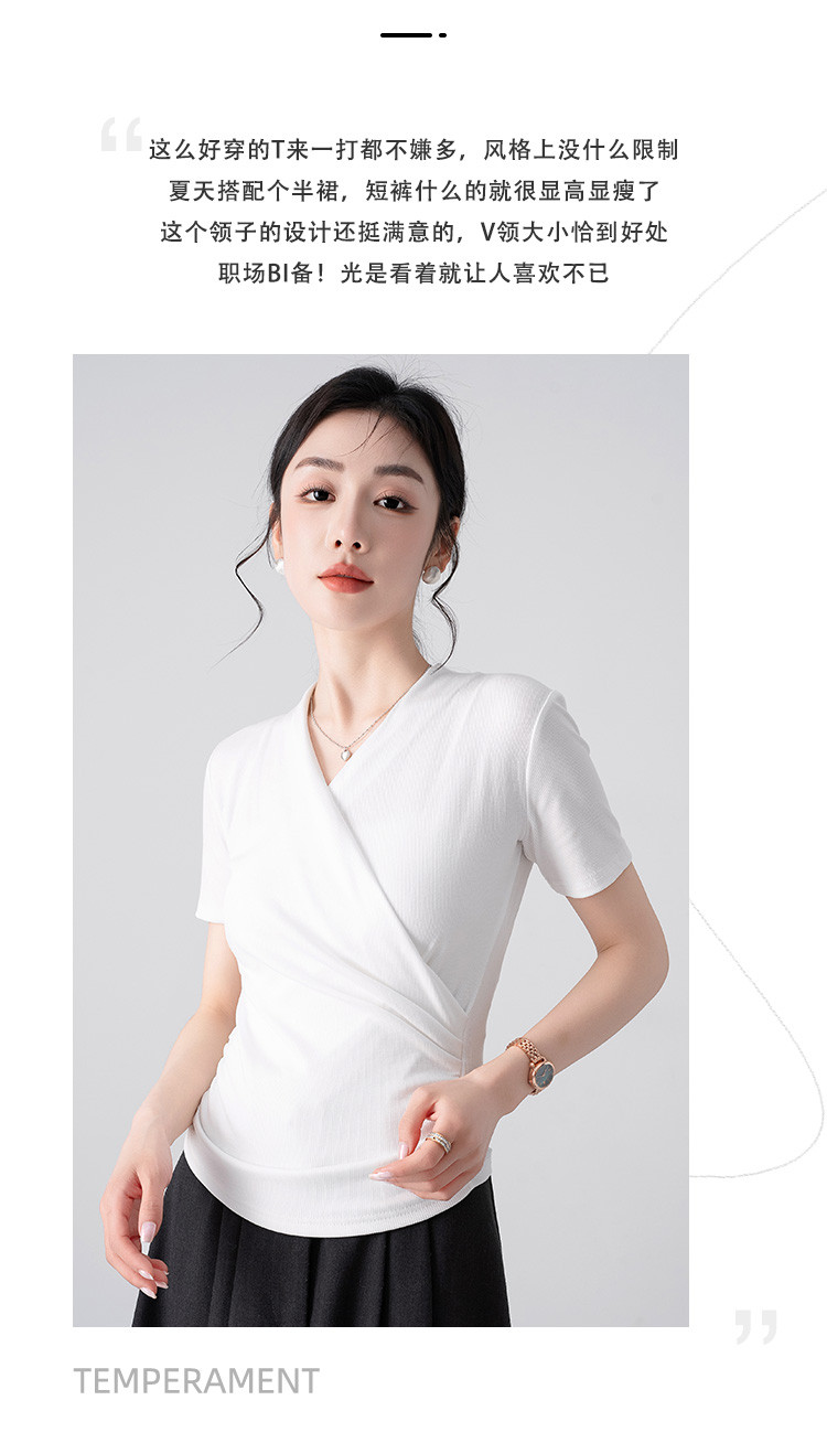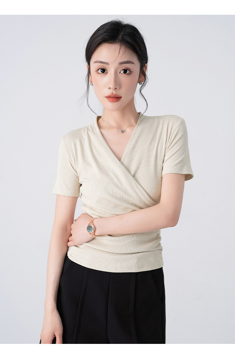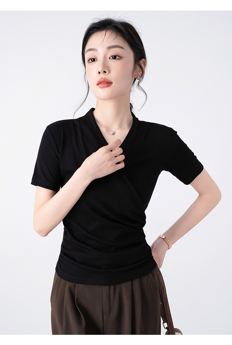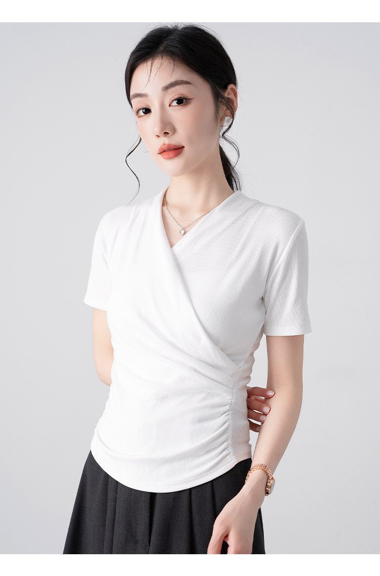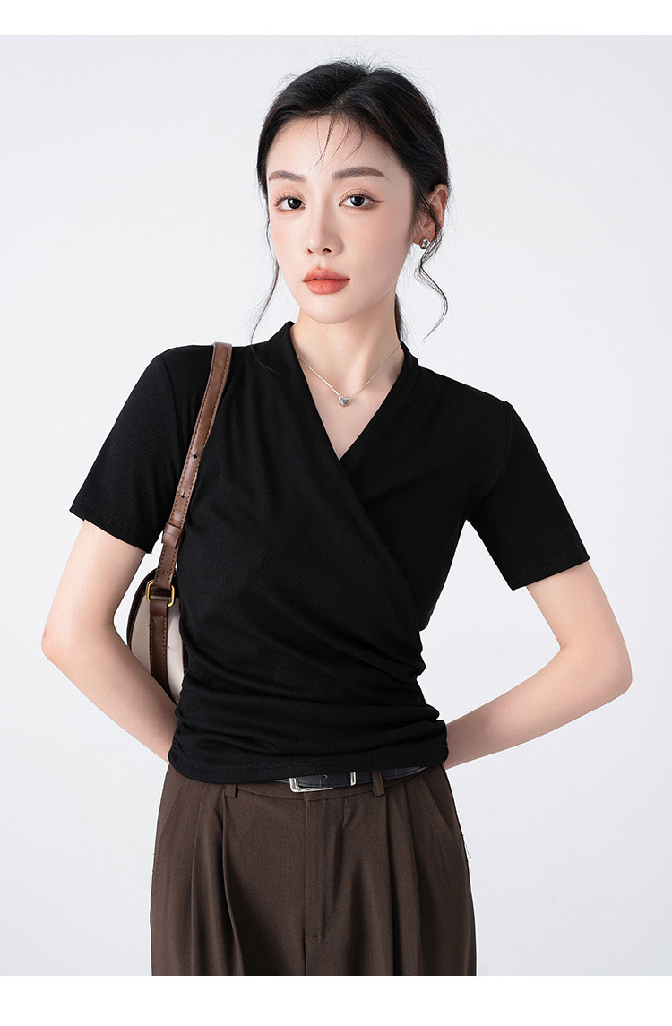 纯色V领交叉短袖T恤女夏季设计感褶皱收腰修身显瘦上衣 116056