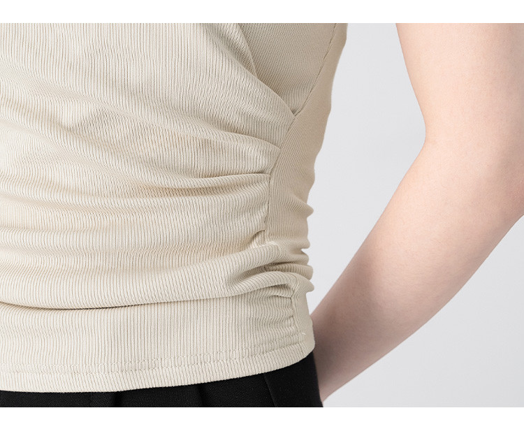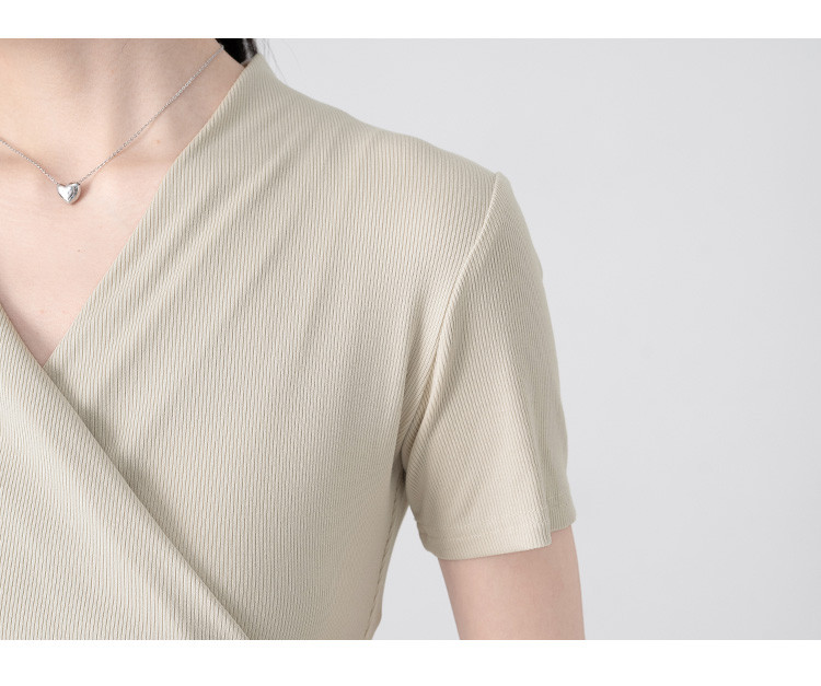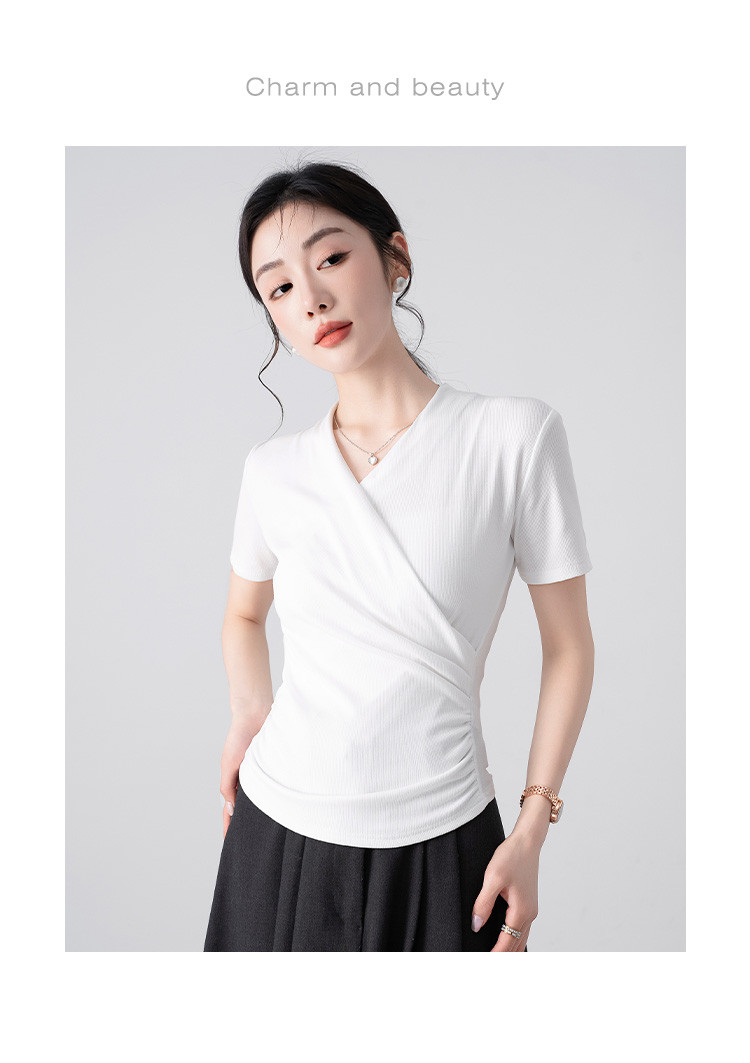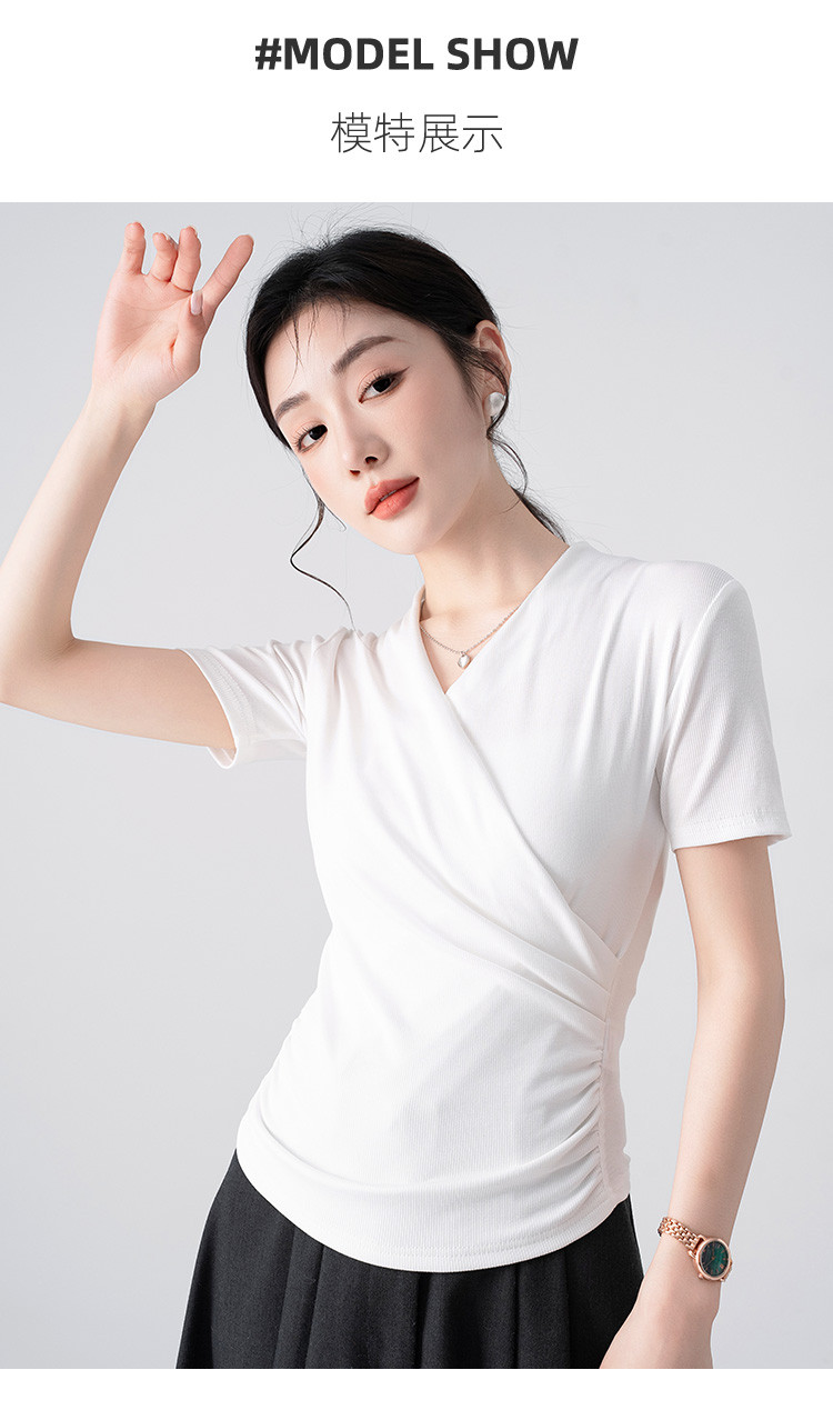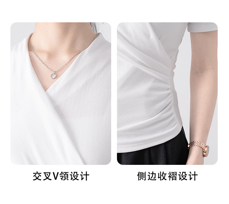 商品名称:纯色V领交叉短袖T恤女夏季设计感褶皱收腰修身显瘦上衣 116056