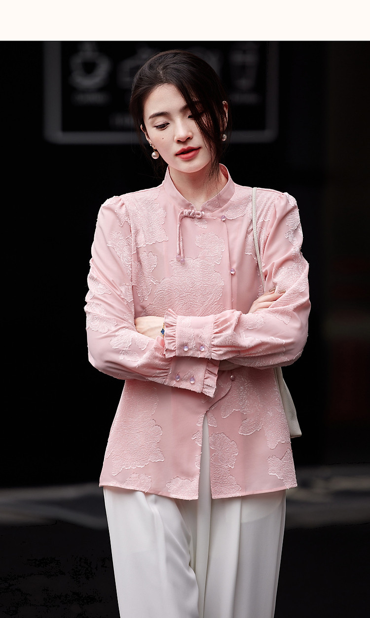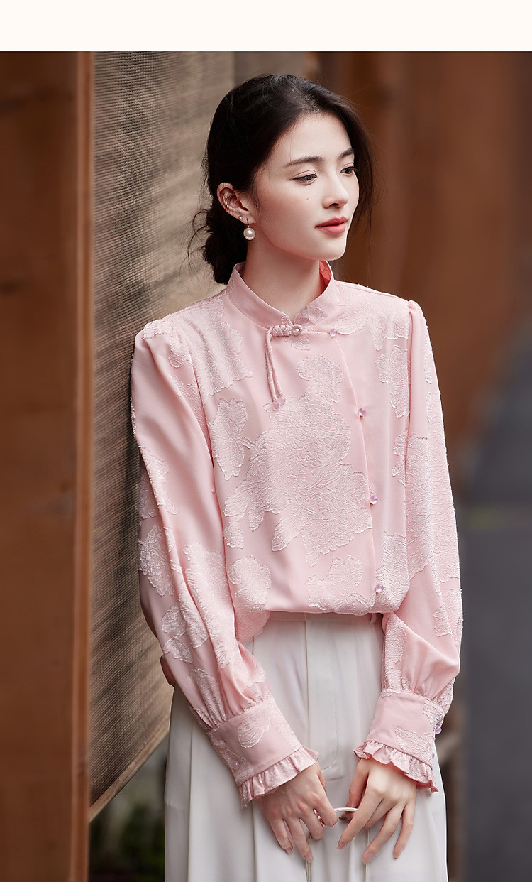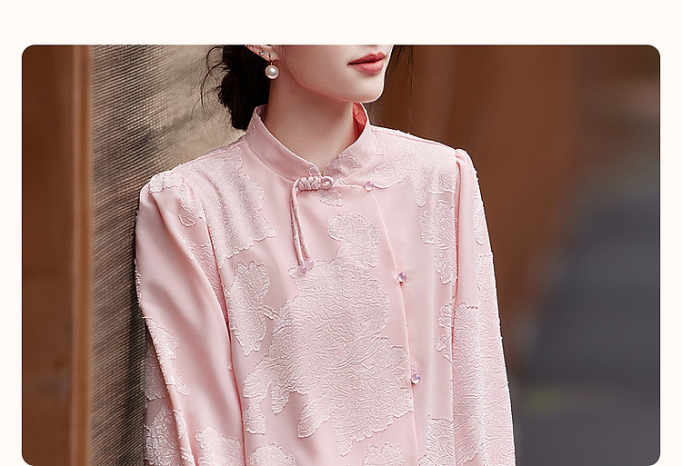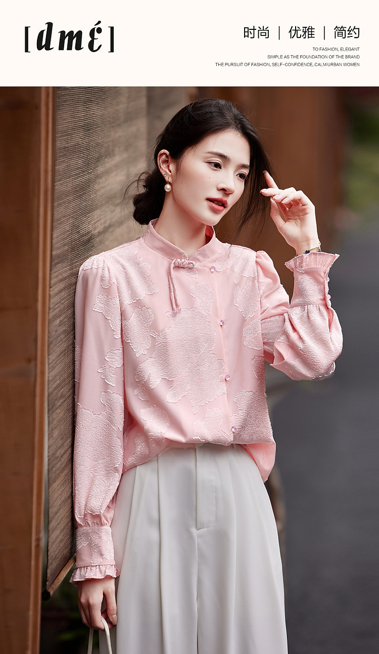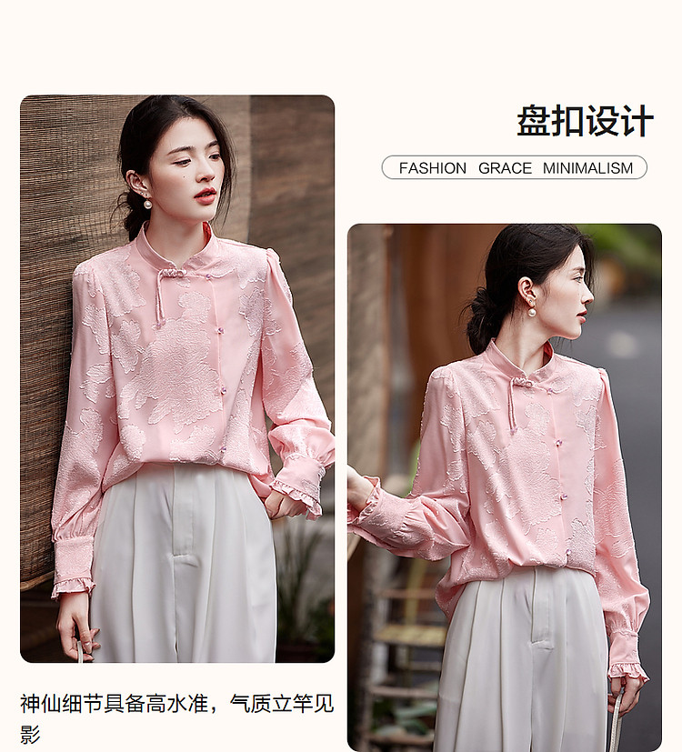 商品名称:【梦湖之境】秋国风新中式立领盘扣不规则门襟植物印花衬衫女上衣 160449