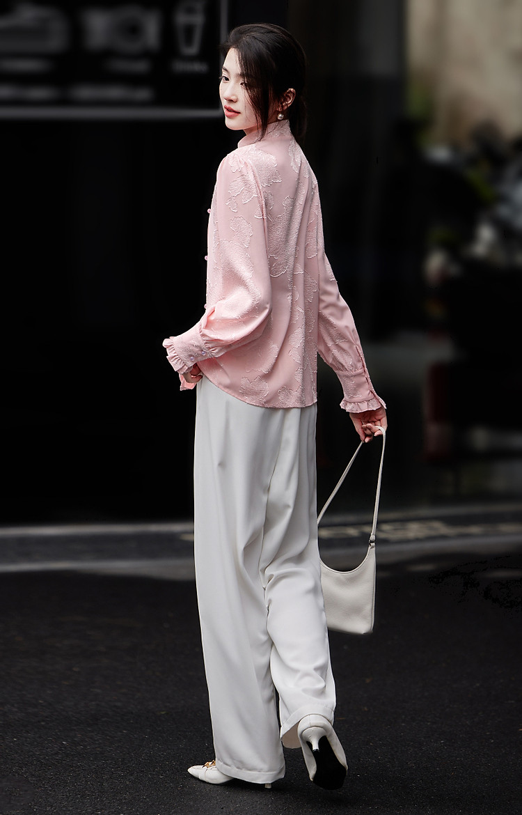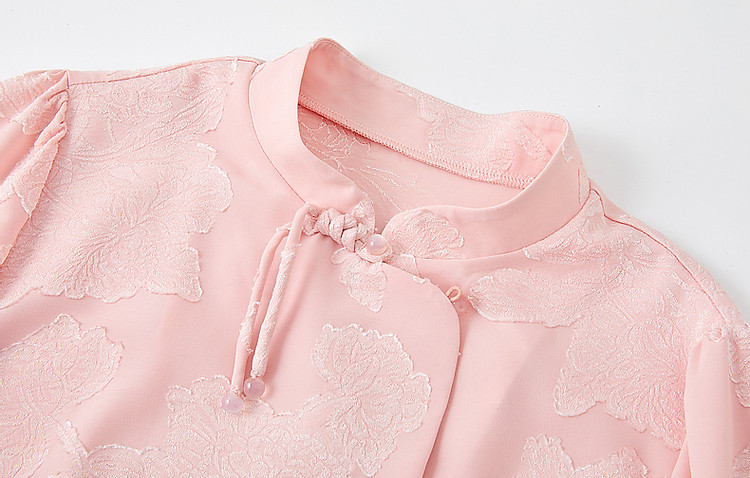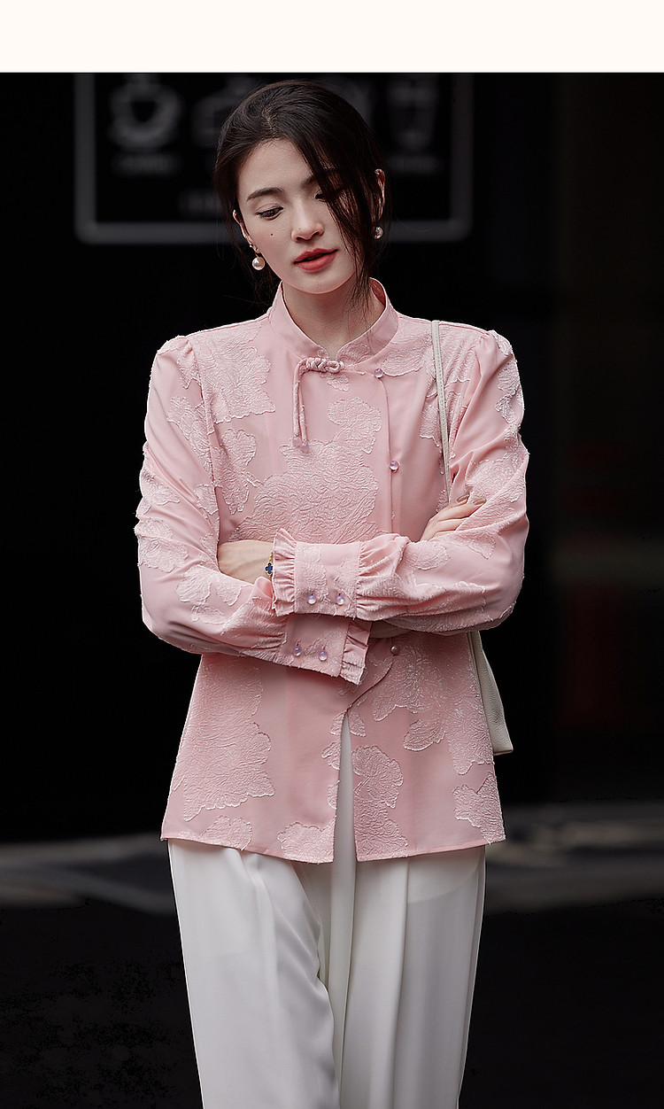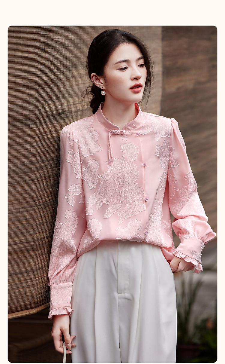 商品名称:【梦湖之境】秋国风新中式立领盘扣不规则门襟植物印花衬衫女上衣 160449