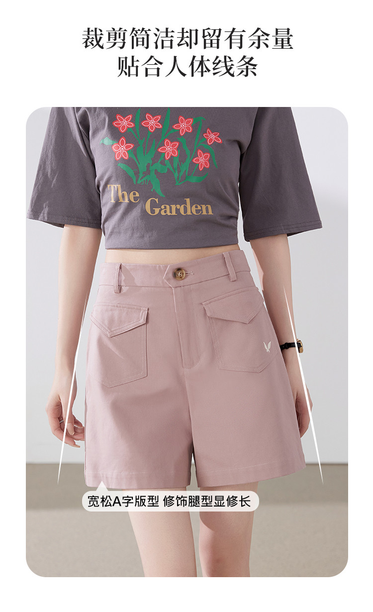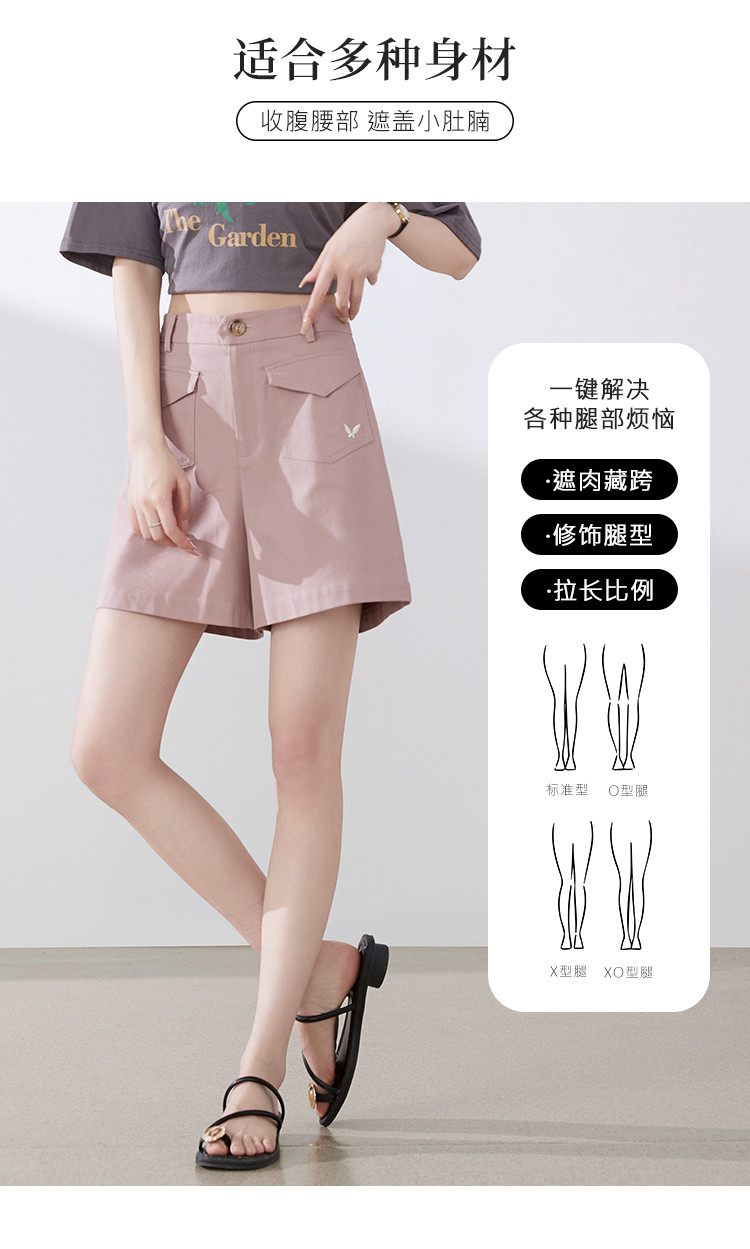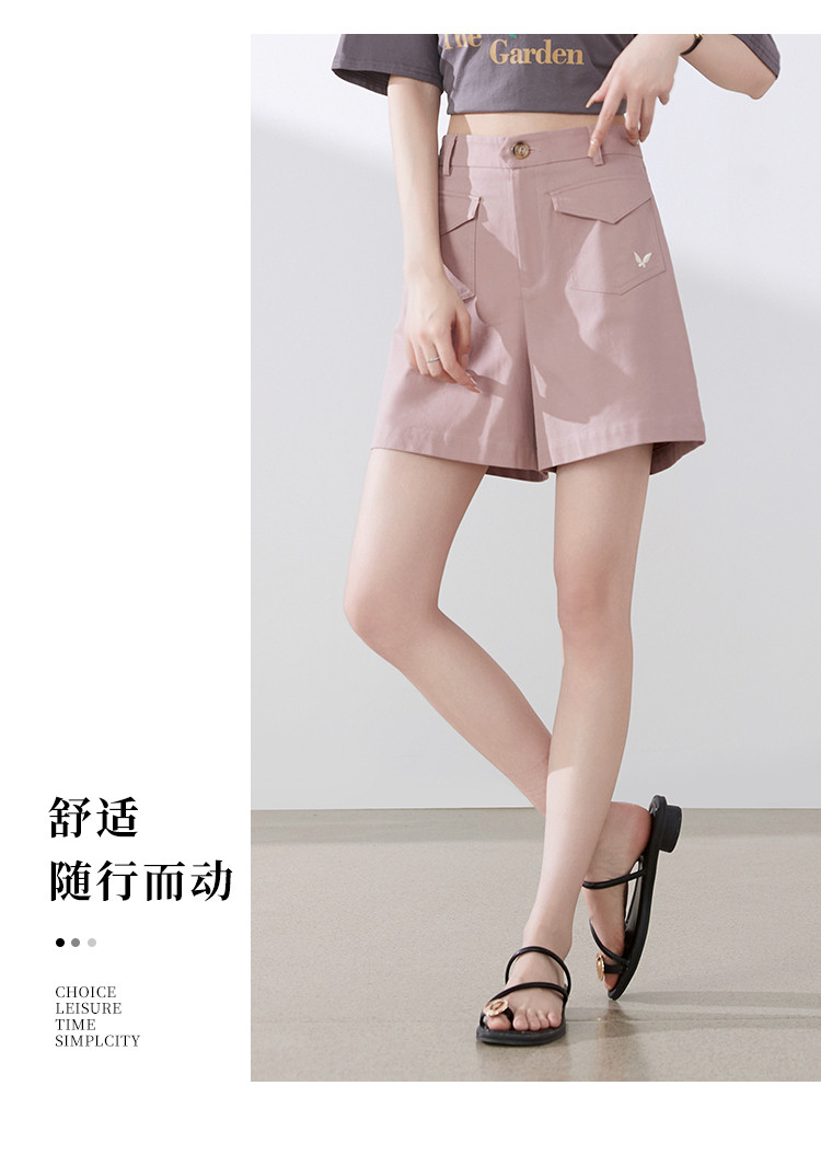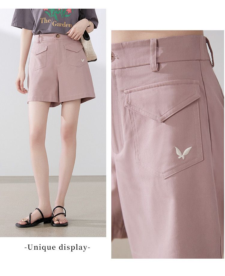 【精致蝴蝶刺绣】A字高腰显瘦阔腿短裤翻盖口袋设计女款休闲短裤 048385