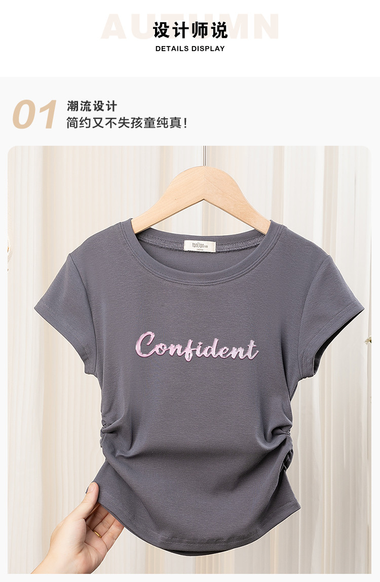 商品名称:【收褶显瘦】春秋款运动休闲儿童圆领上衣女童文字印花短袖T恤 210767