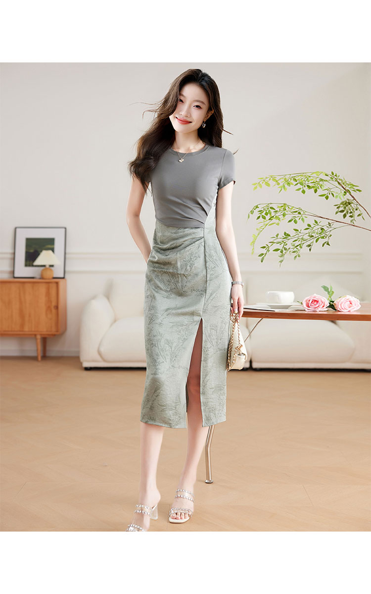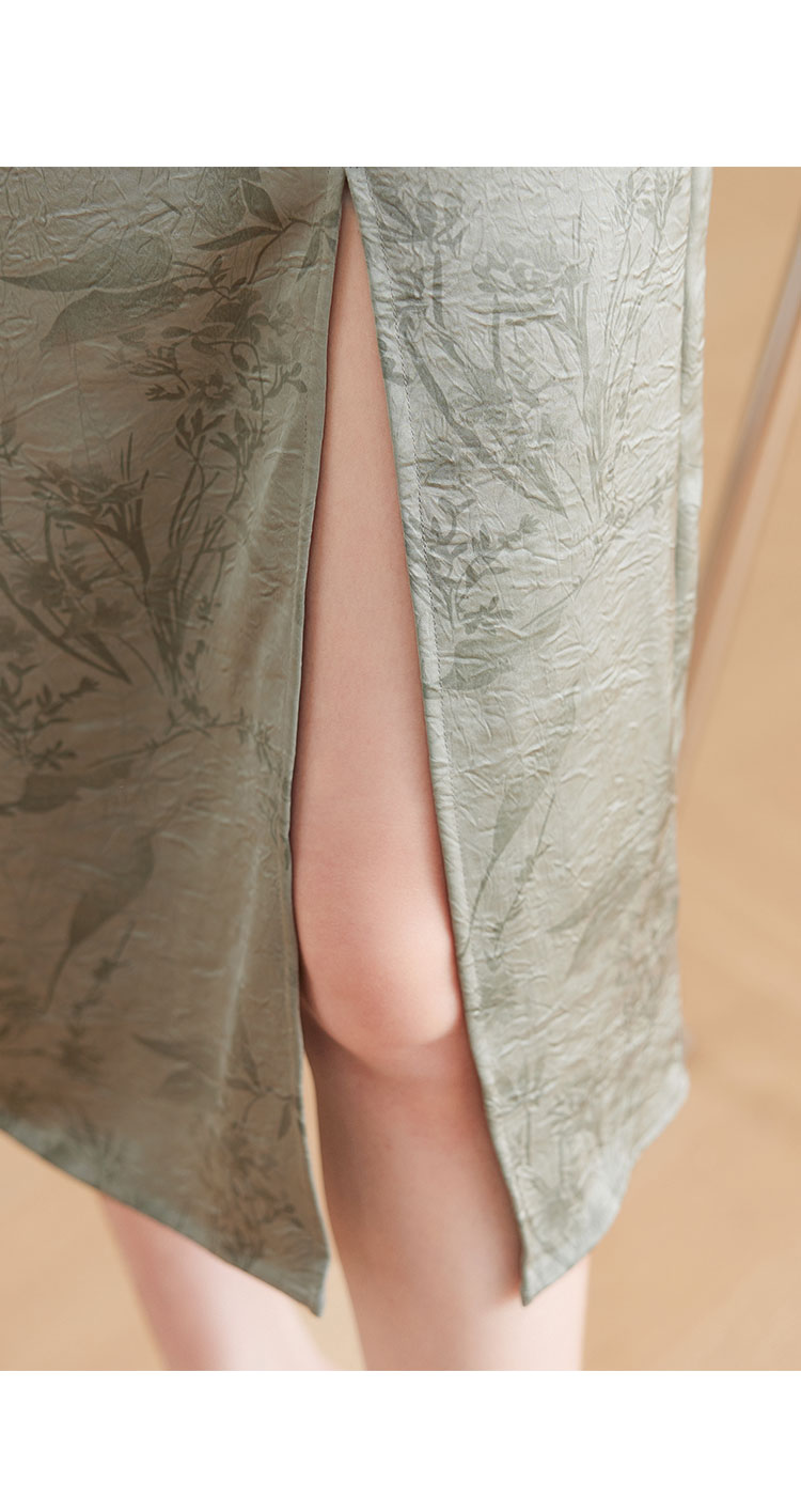 【中式新美学】缎面拼接开叉连衣裙女短袖夏季国风提花气质a字裙 556063