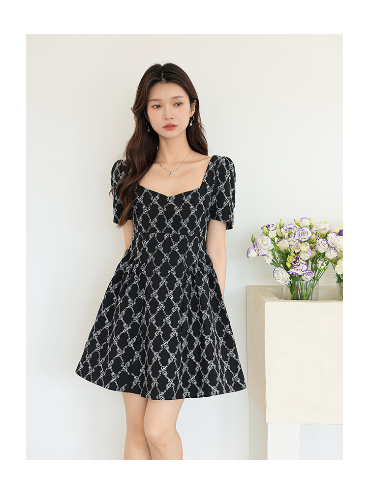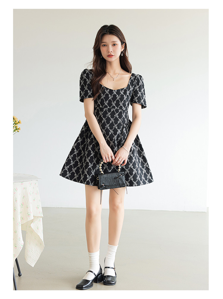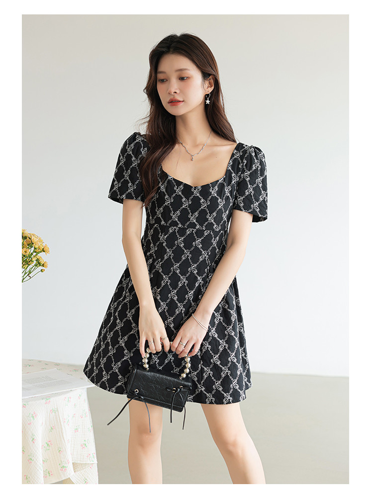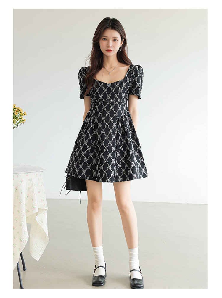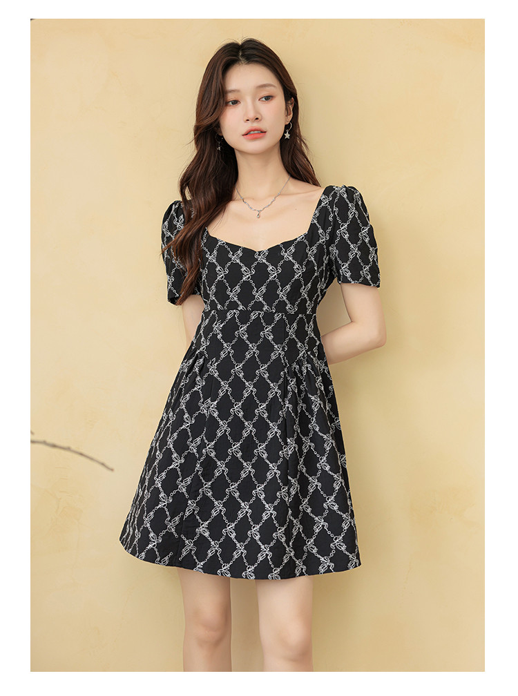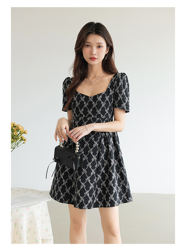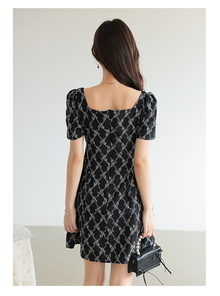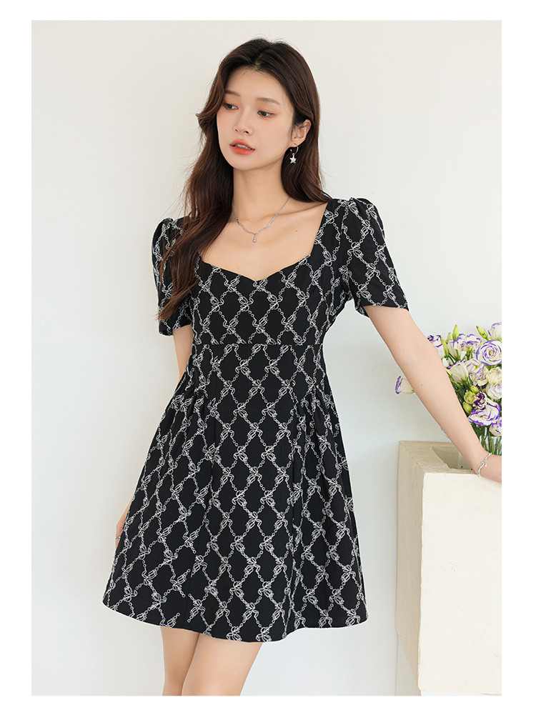 法式复古方领短袖连衣裙女气质温柔收腰气质短裙女 904067