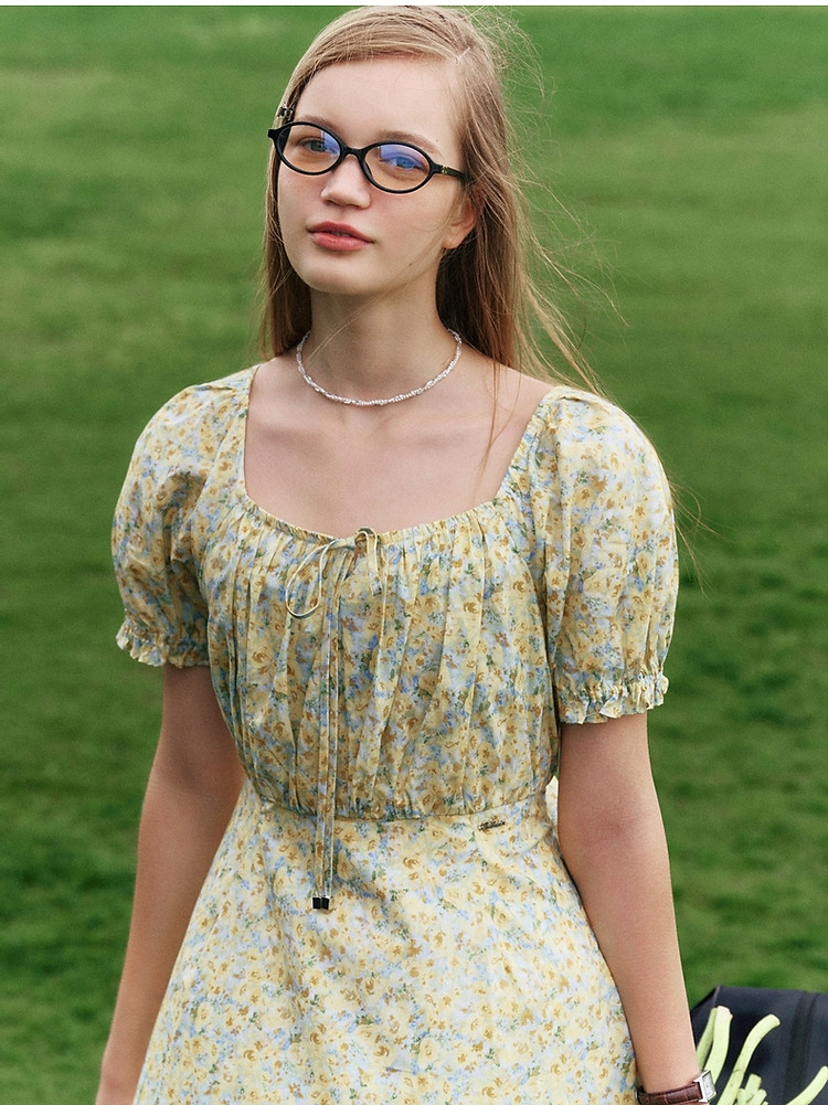 小熊夏季款方领碎花连衣裙印花裙气质高腰女装 398721