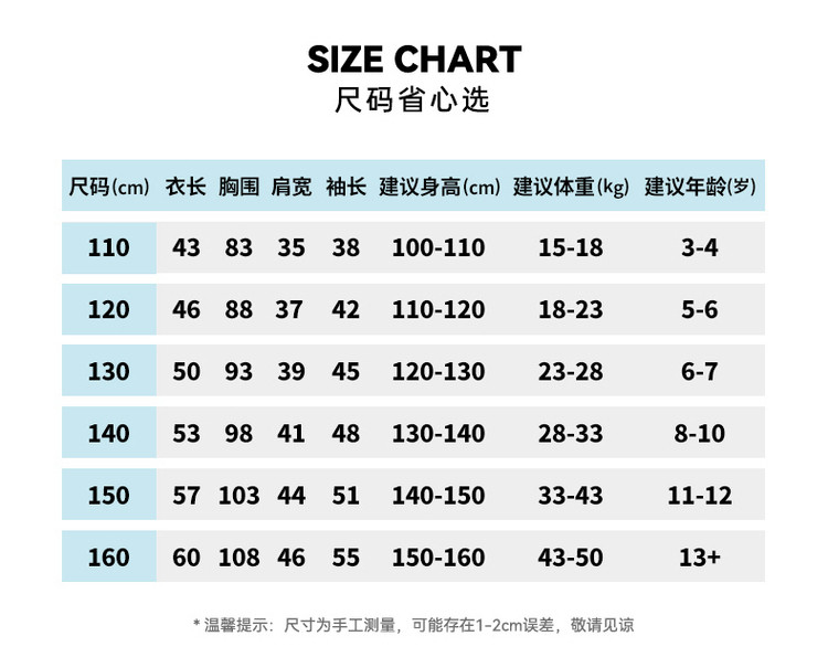 | 尺码 | 衣长(cm) | 肩宽(cm) | 身高(cm) | 袖长(cm) | 适合年龄 | 胸围(cm) | 号型 |