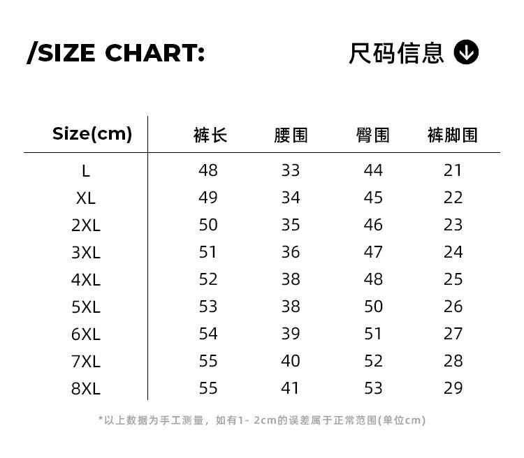 | 尺码 | 后浪(cm) | 裤脚围(cm) | 腰围(cm) | 裤长(cm) | 前浪(cm) | 臀围(cm) | 号型 |