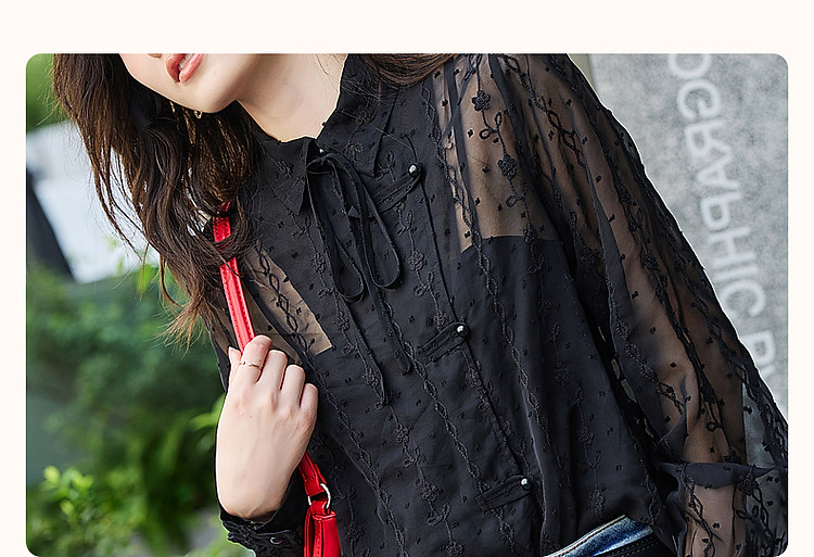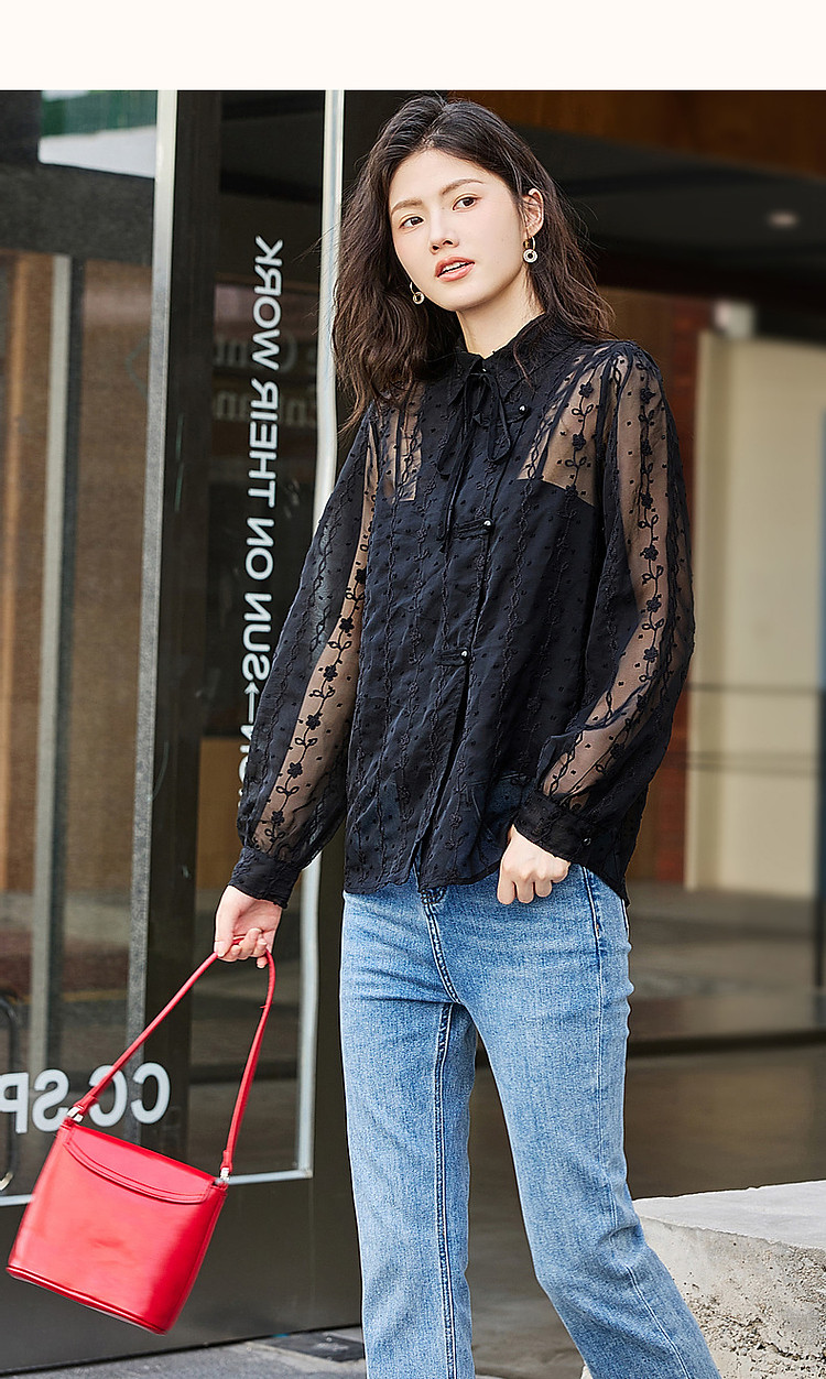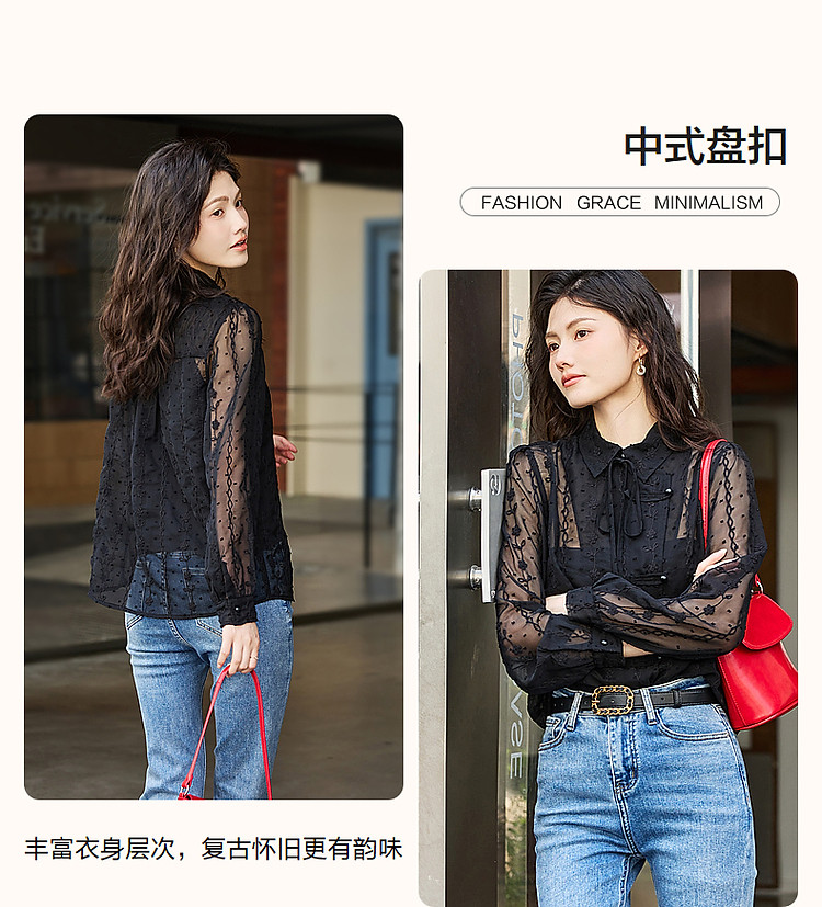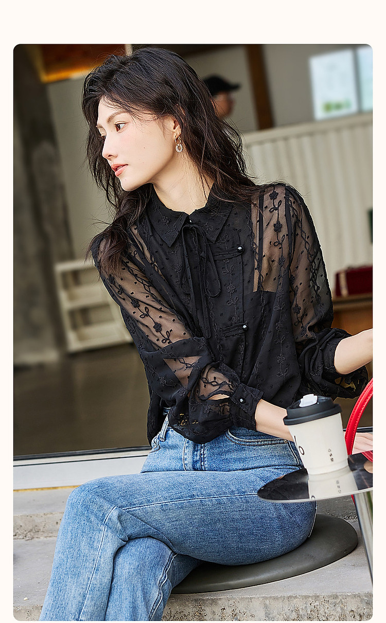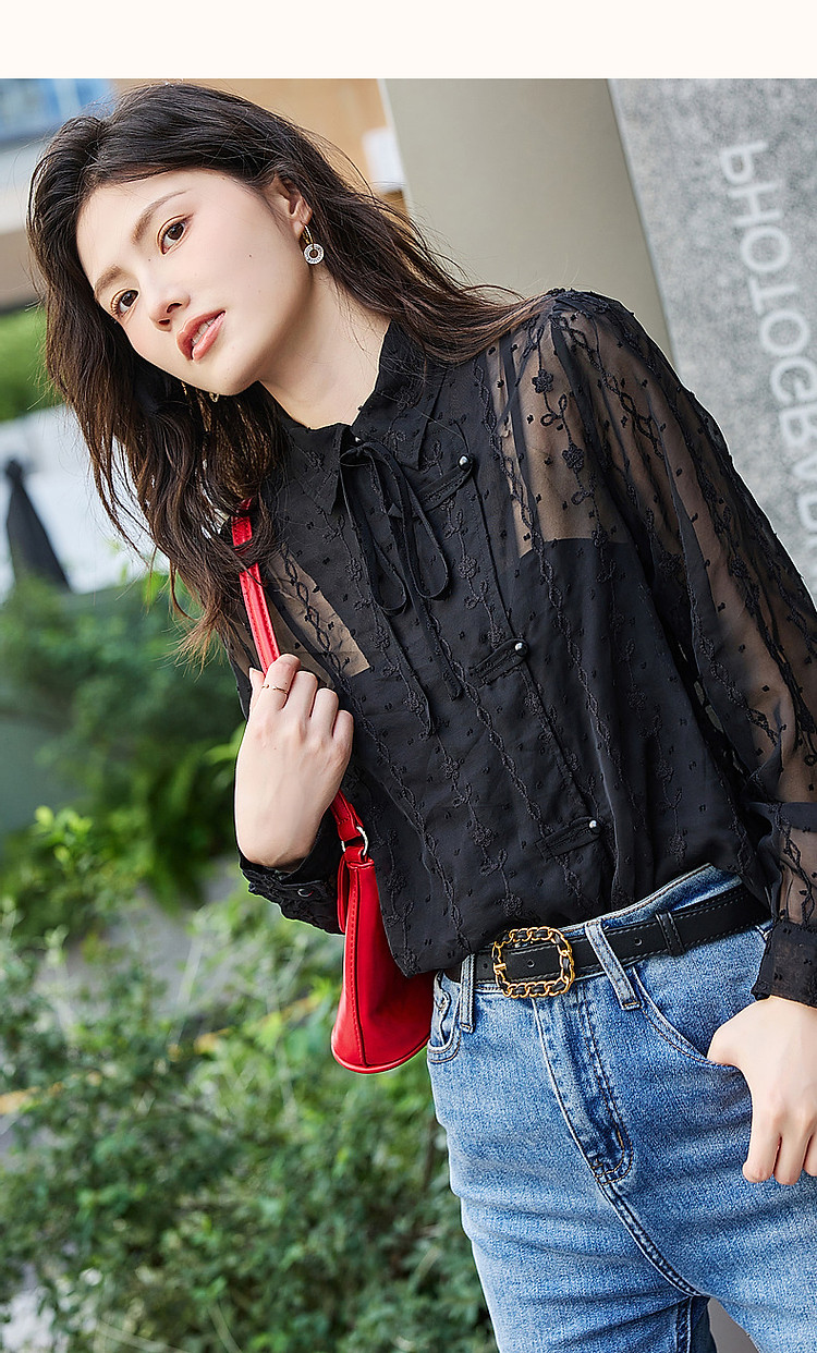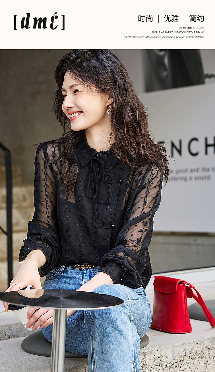 商品名称:【温柔预告片】春秋法式剪花雪纺衬衫优雅系带舒适藏肉衬衣女装 667905