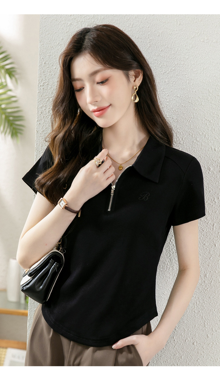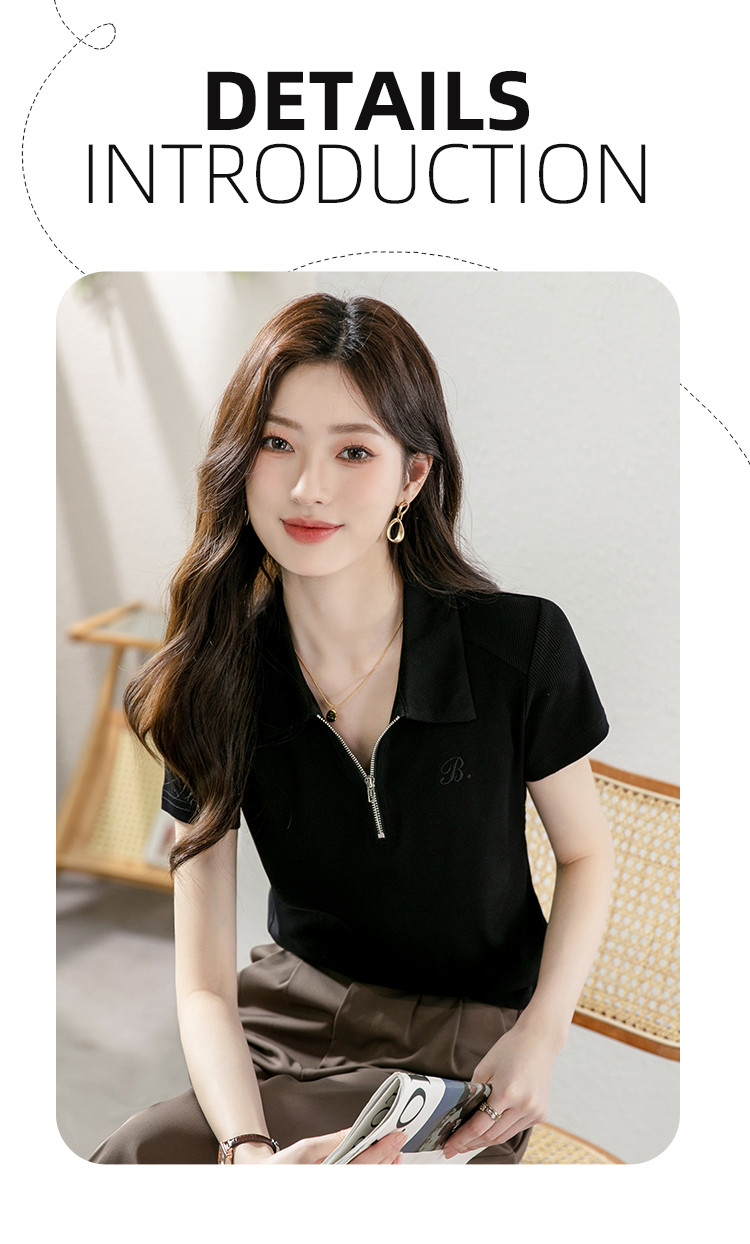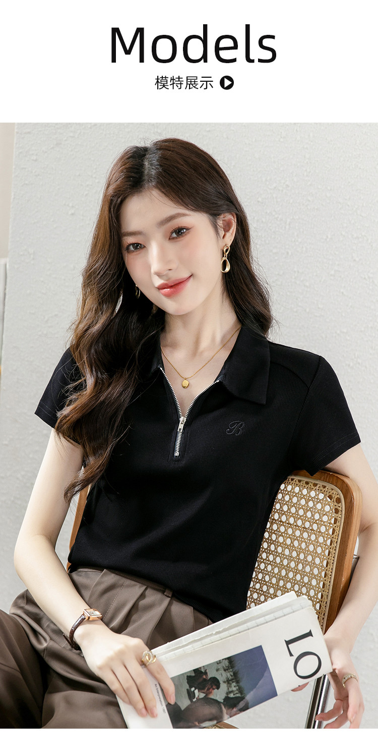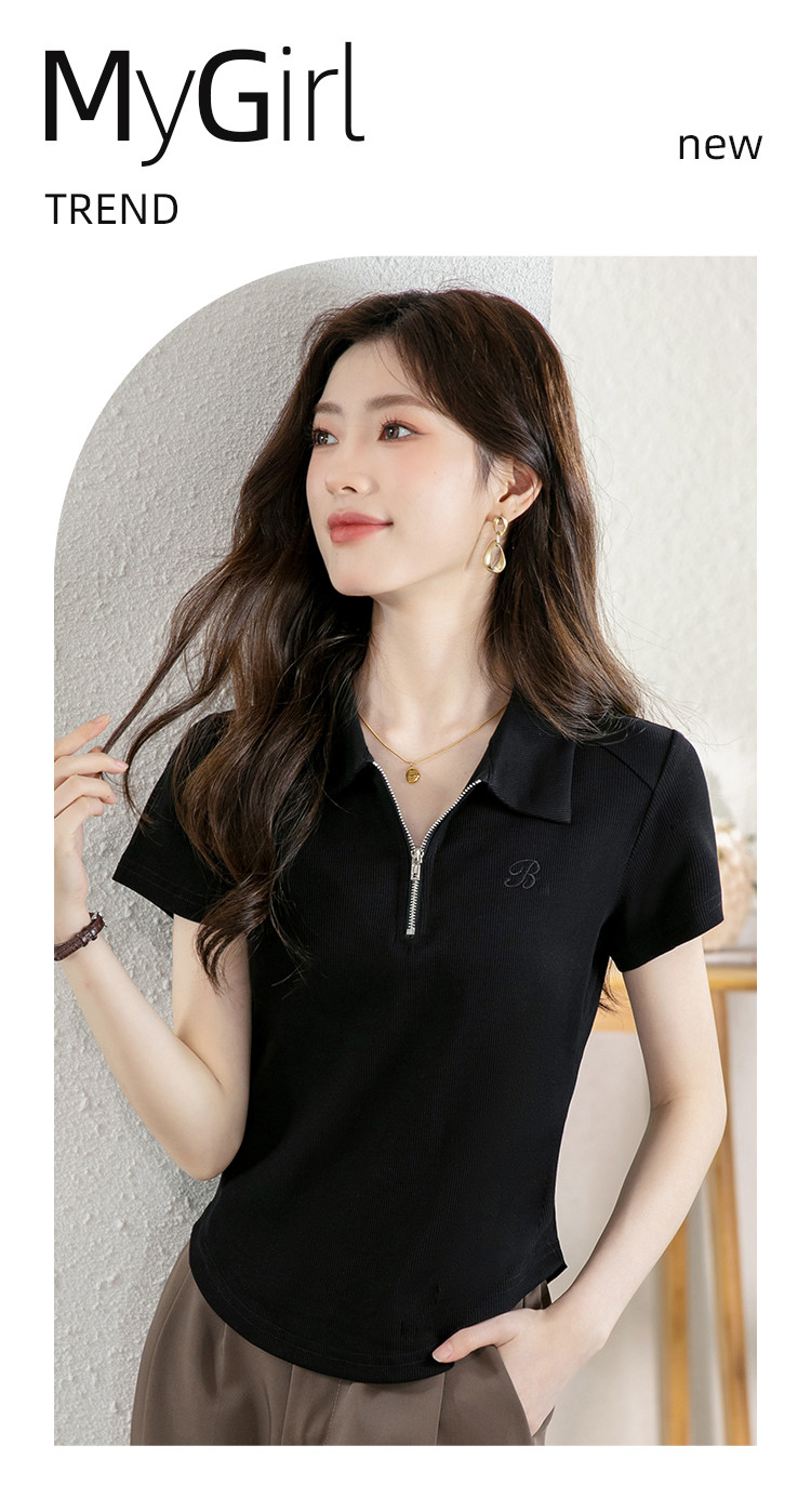 商品名称:夏季休闲舒适时尚纯色翻领半拉链设计短袖T恤女上衣潮 829464