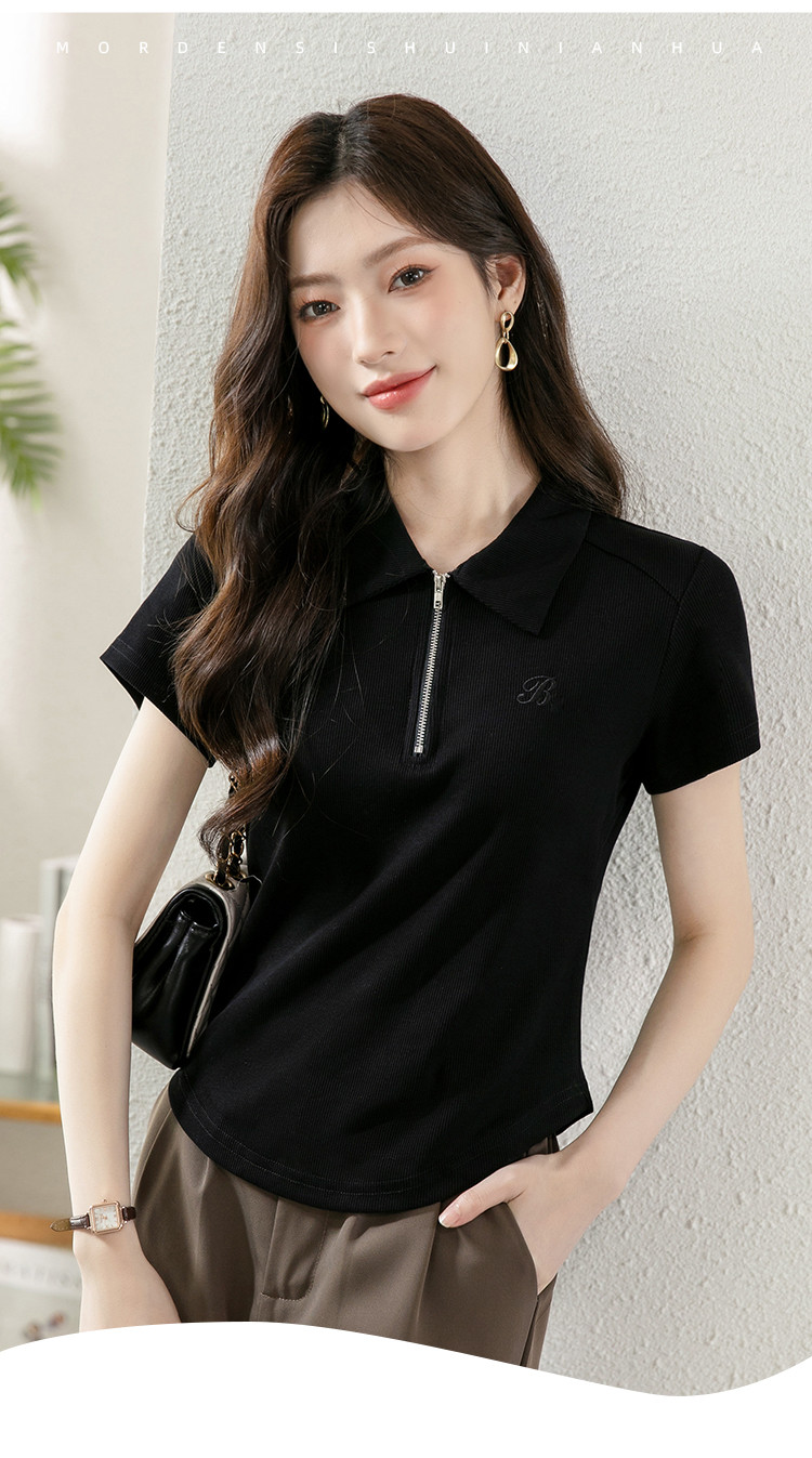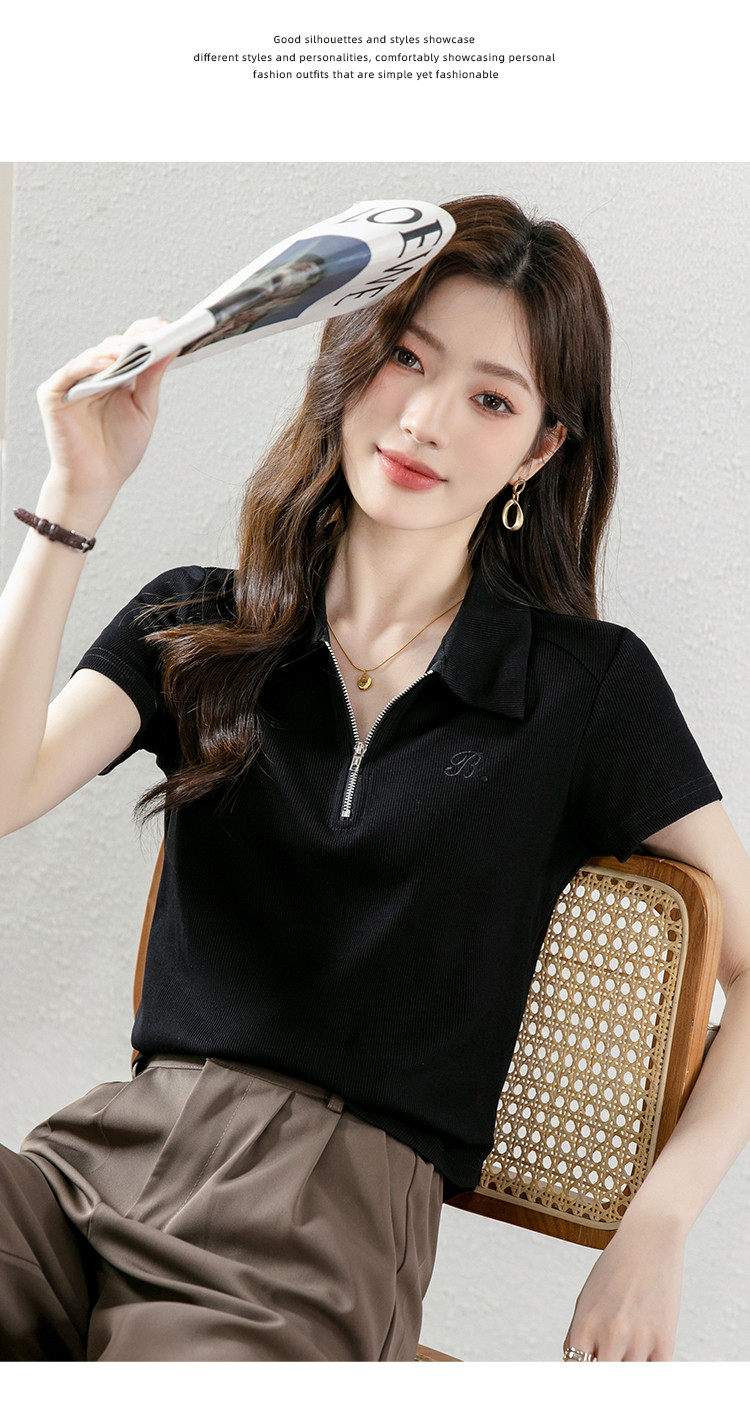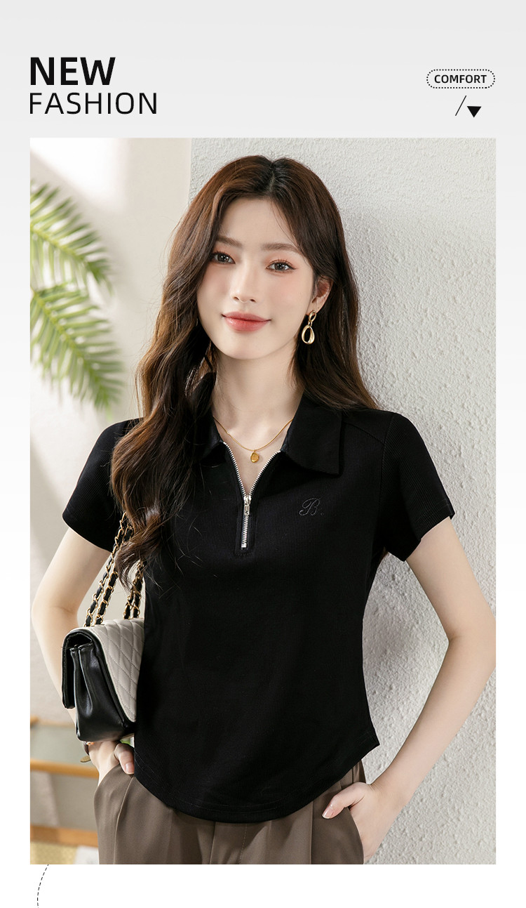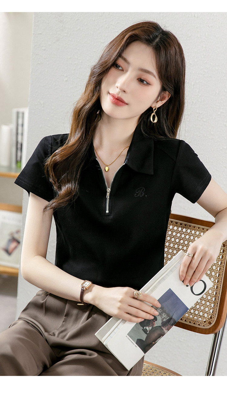 商品名称:夏季休闲舒适时尚纯色翻领半拉链设计短袖T恤女上衣潮 829464
