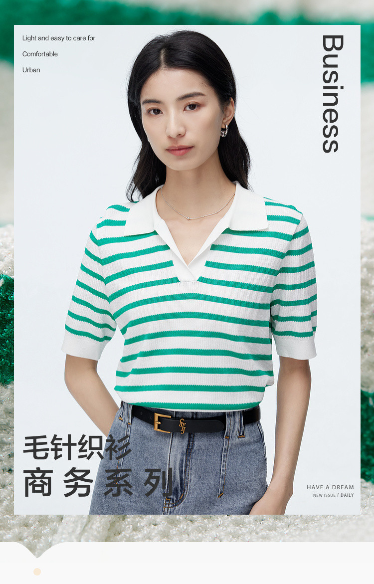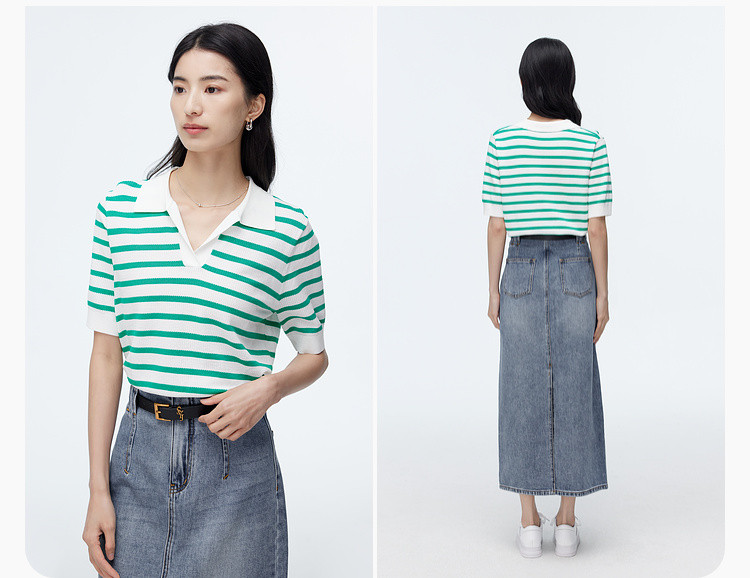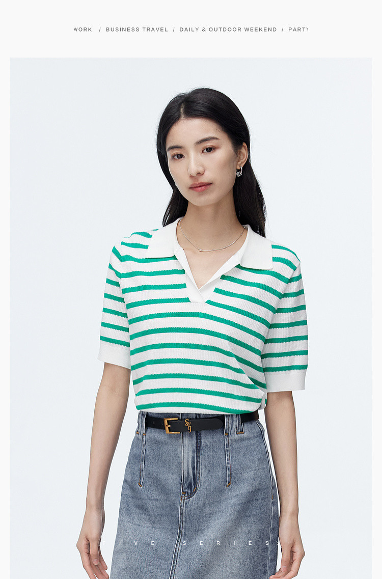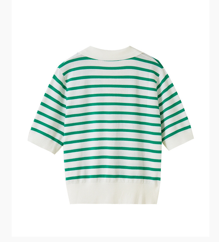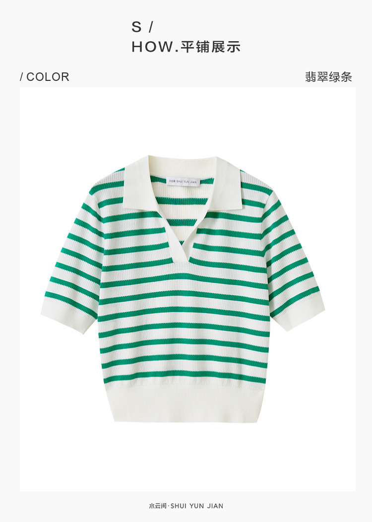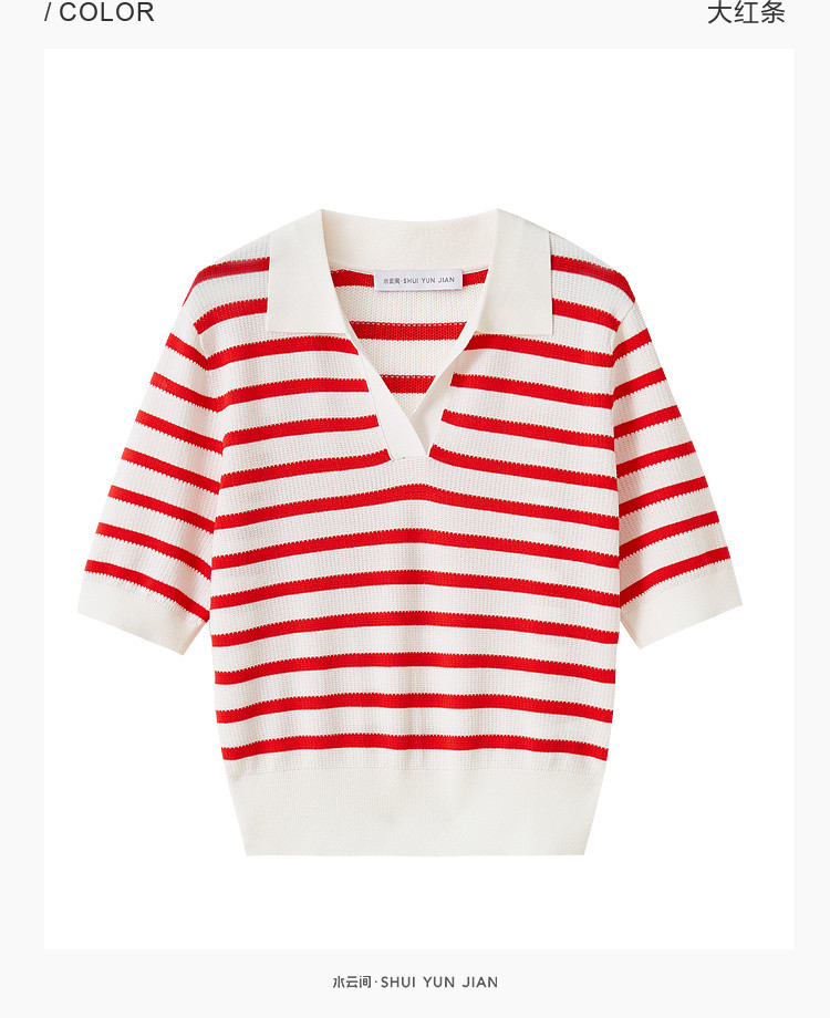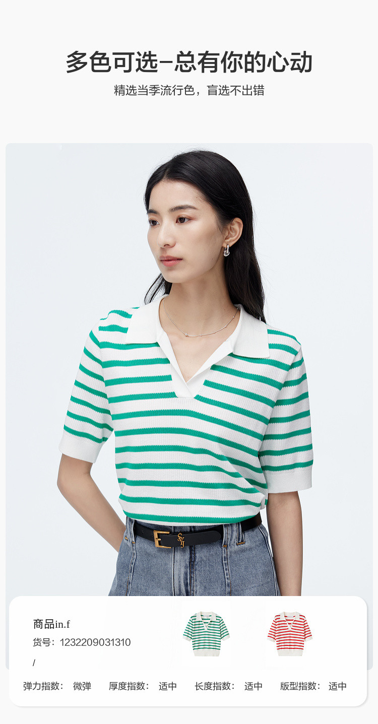 商品名称:撞色条纹短袖针织衫女夏季休闲时尚百搭上衣显瘦翻领针织T恤女 383235