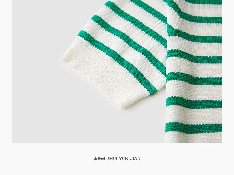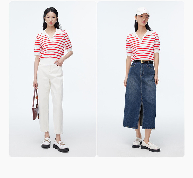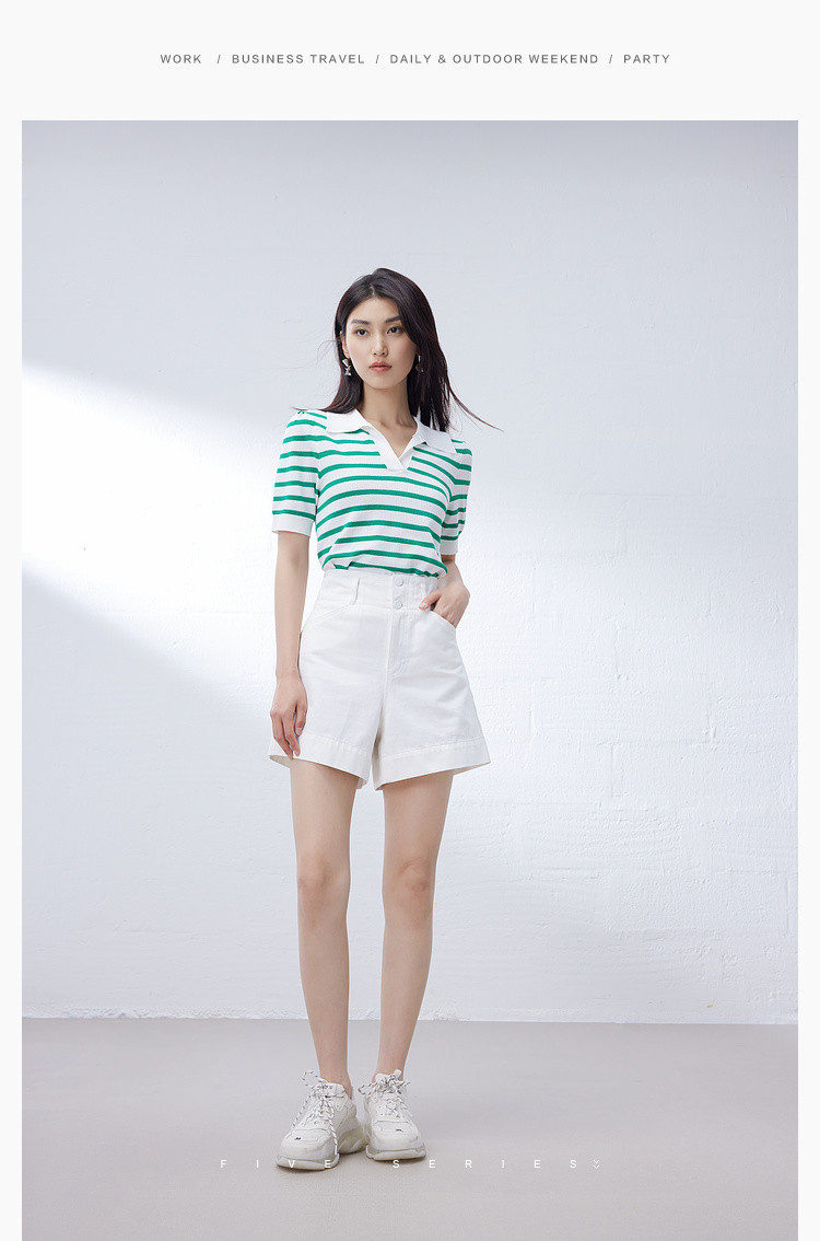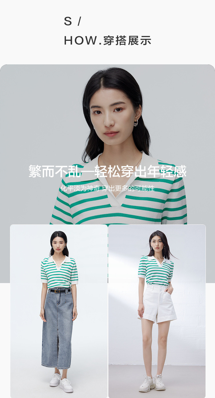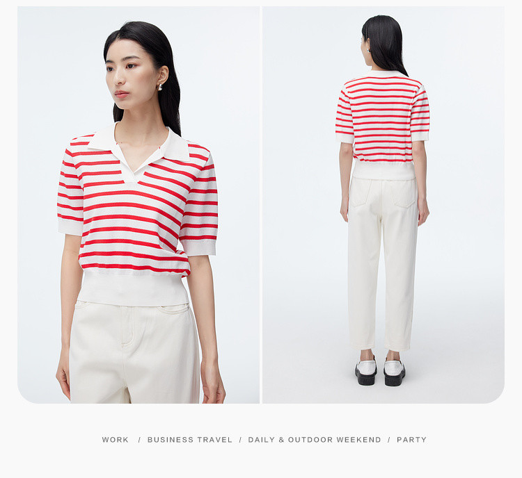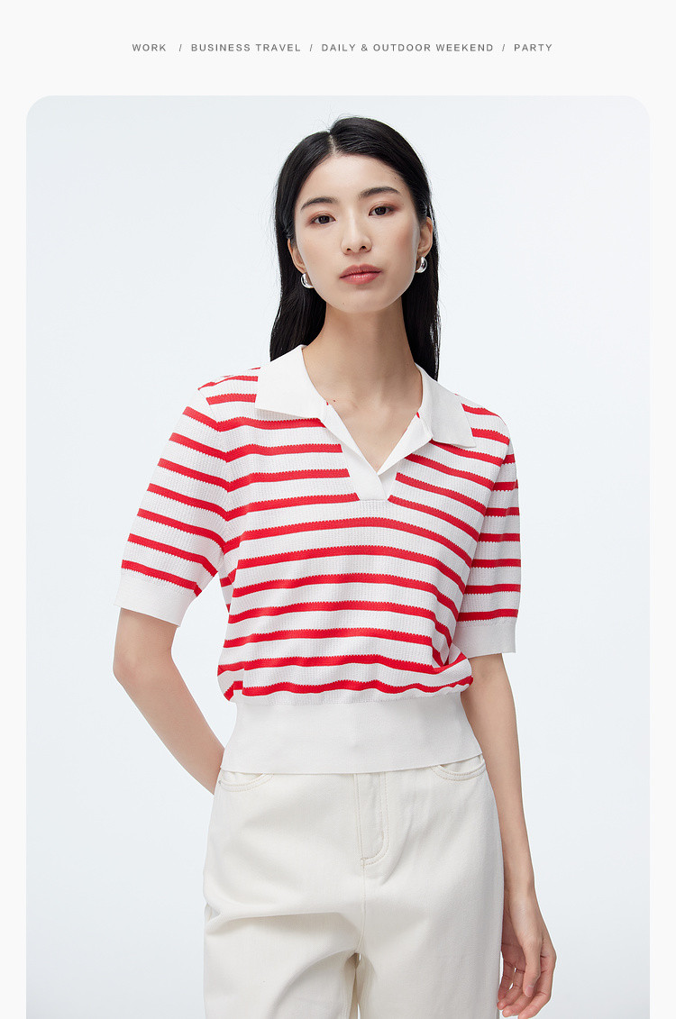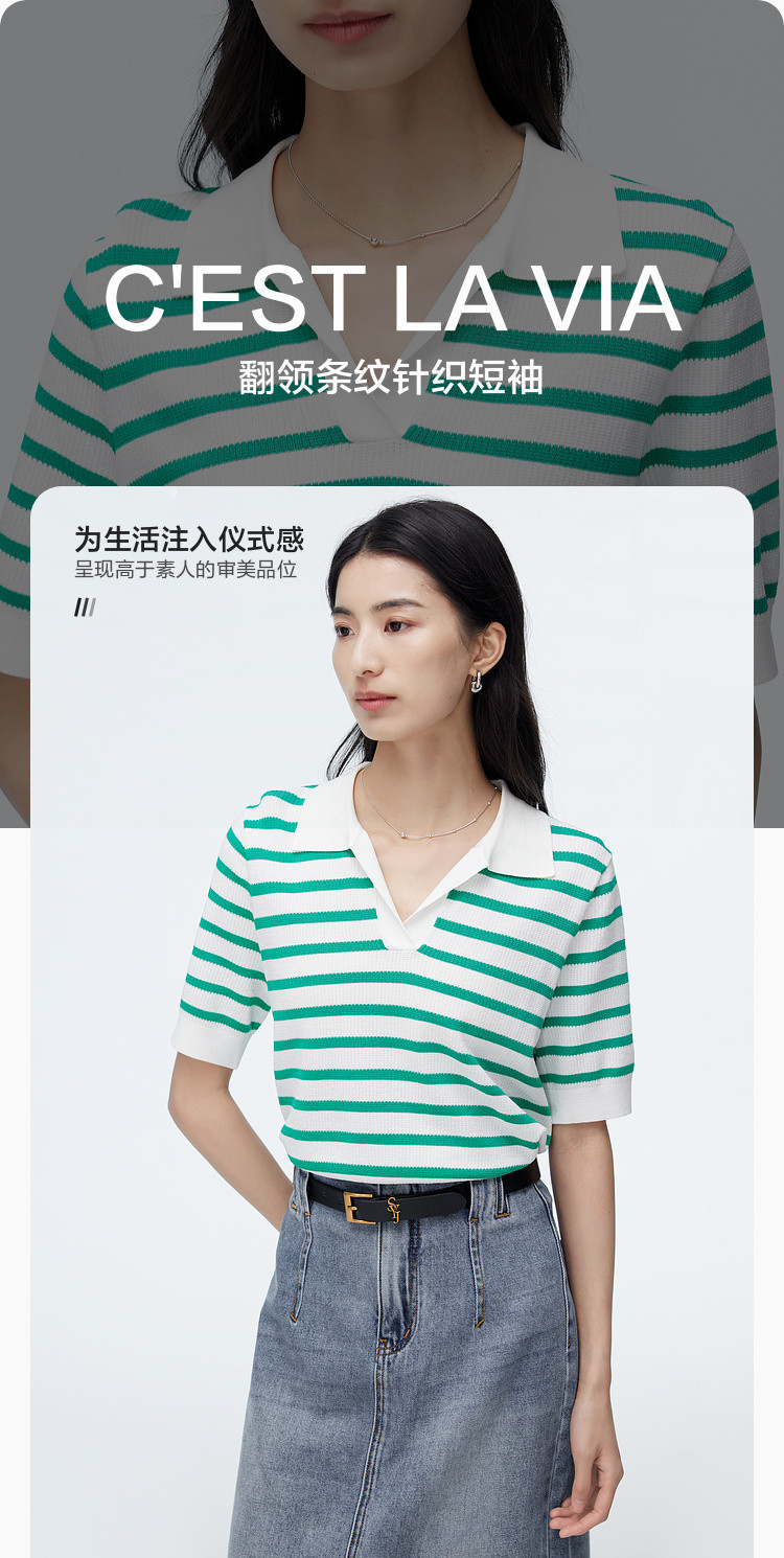 商品名称:撞色条纹短袖针织衫女夏季休闲时尚百搭上衣显瘦翻领针织T恤女 383235