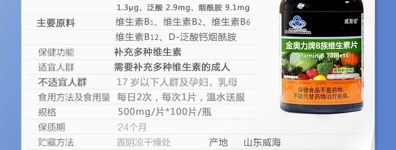 商品名称:威斯健 金奥力牌B族维生素片 100片