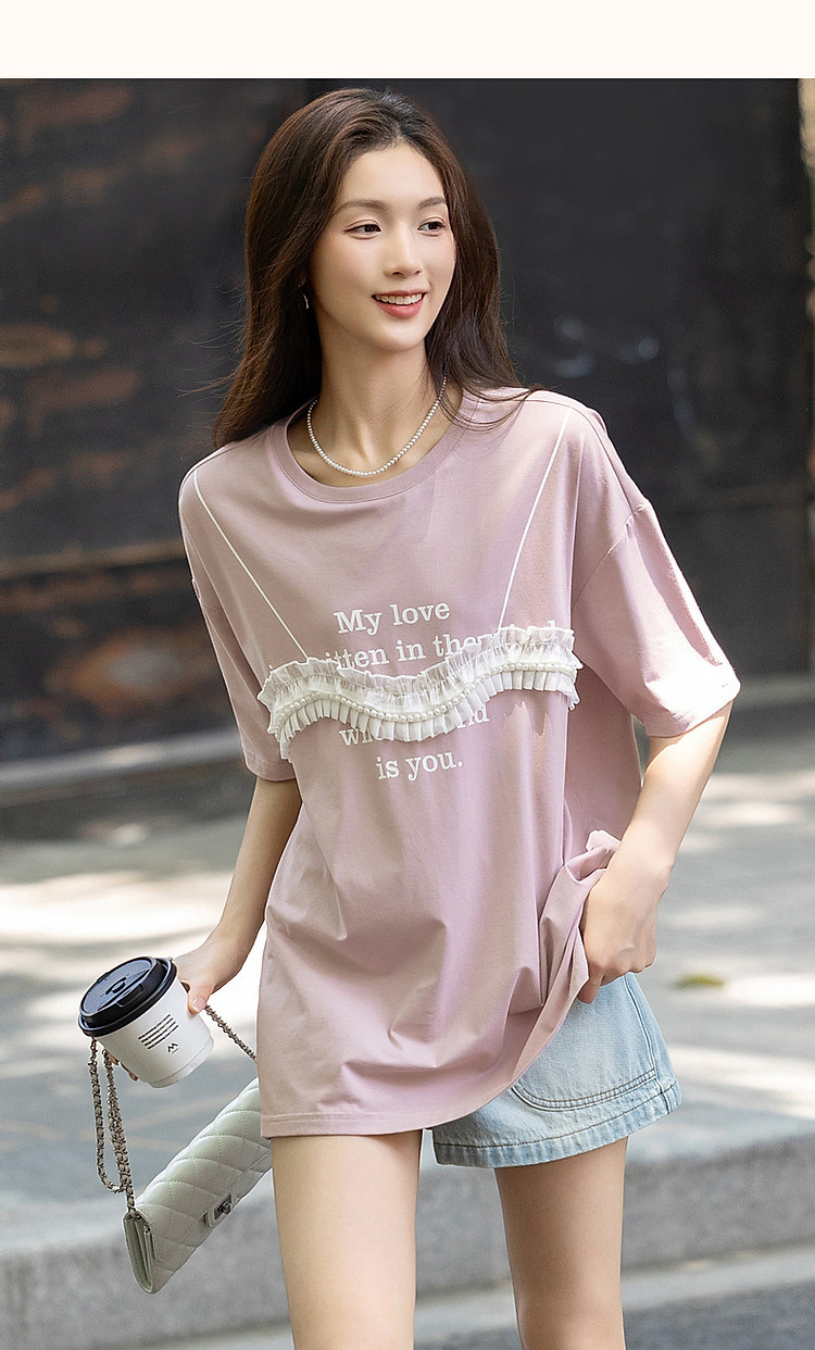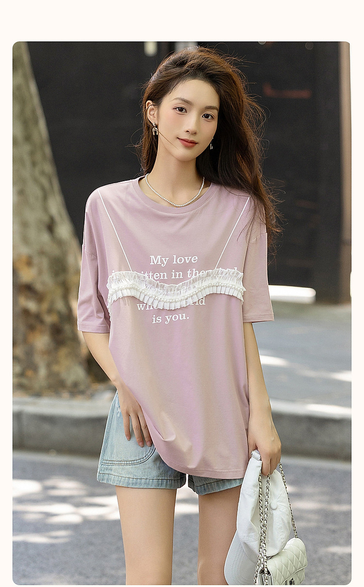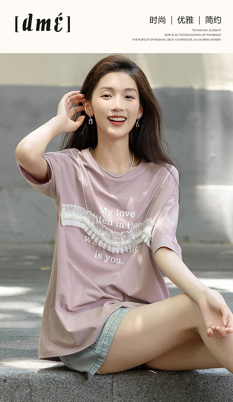 【假两件蕾丝字母t恤】夏减龄时髦休闲宽松显瘦舒适女式t恤 597313
