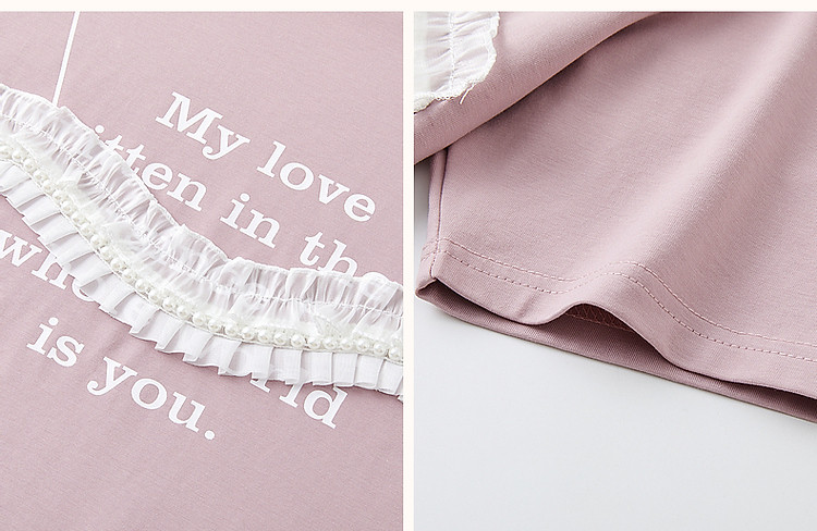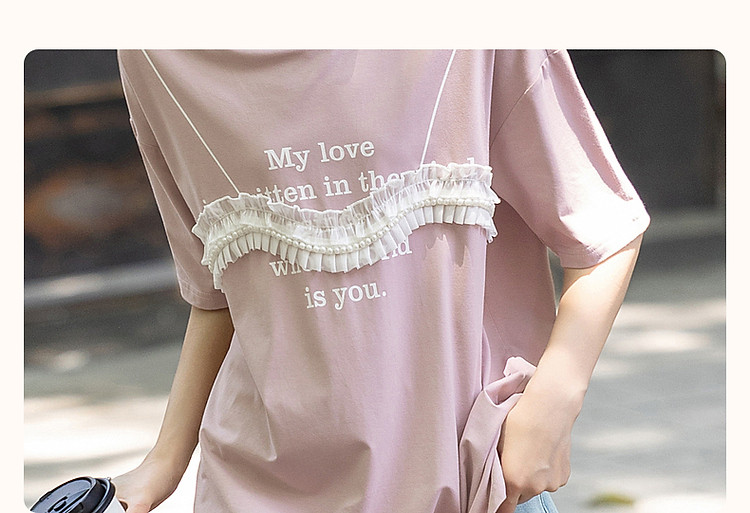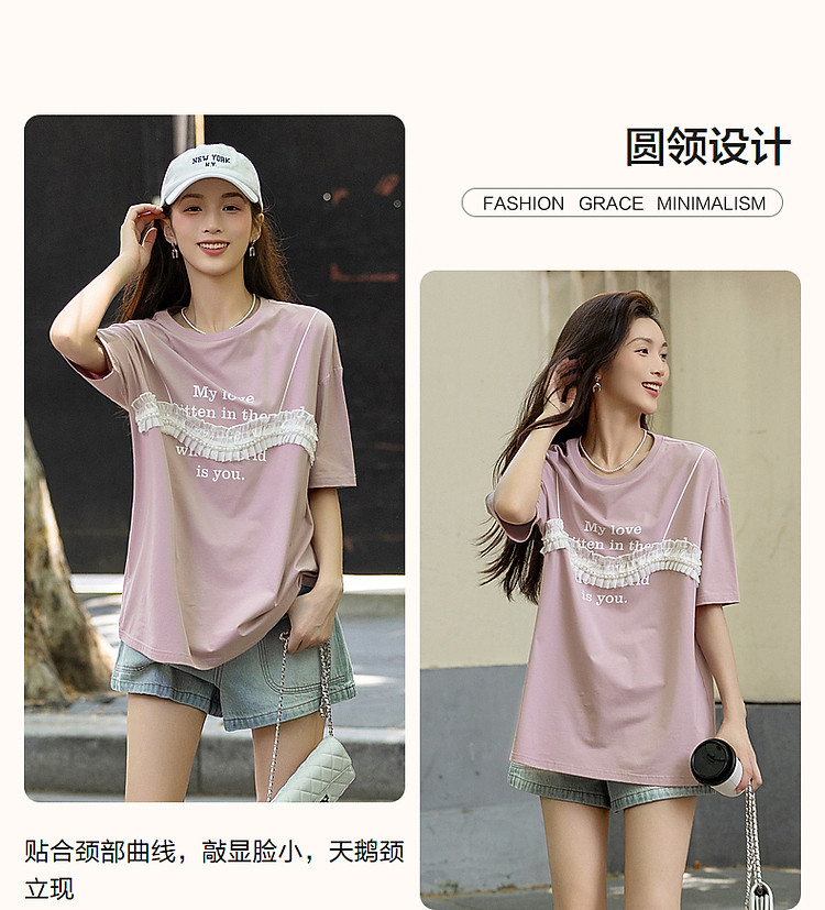 商品名称:【假两件蕾丝字母t恤】夏减龄时髦休闲宽松显瘦舒适女式t恤 597313