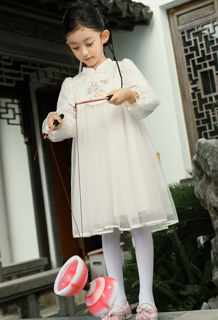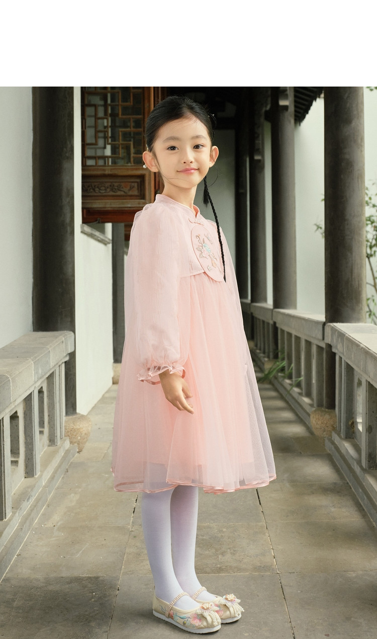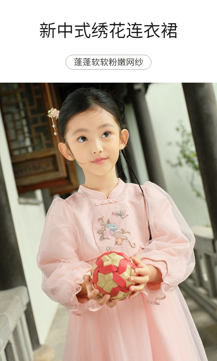 新中式国风连衣裙汉服女童裙子儿童小童立领甜美盘扣宝宝网纱春秋 163205