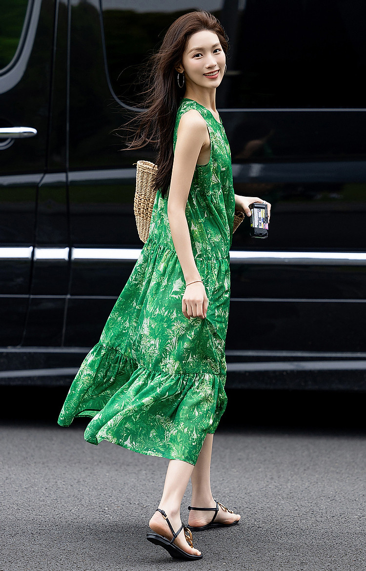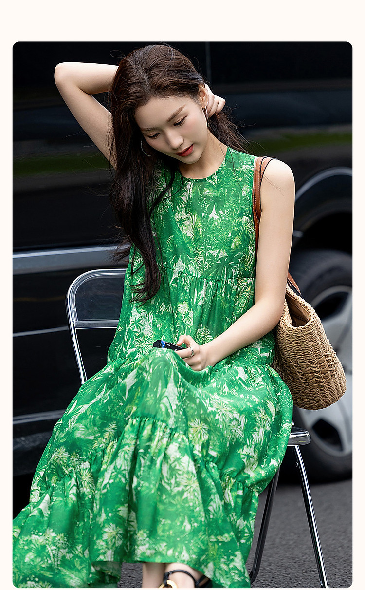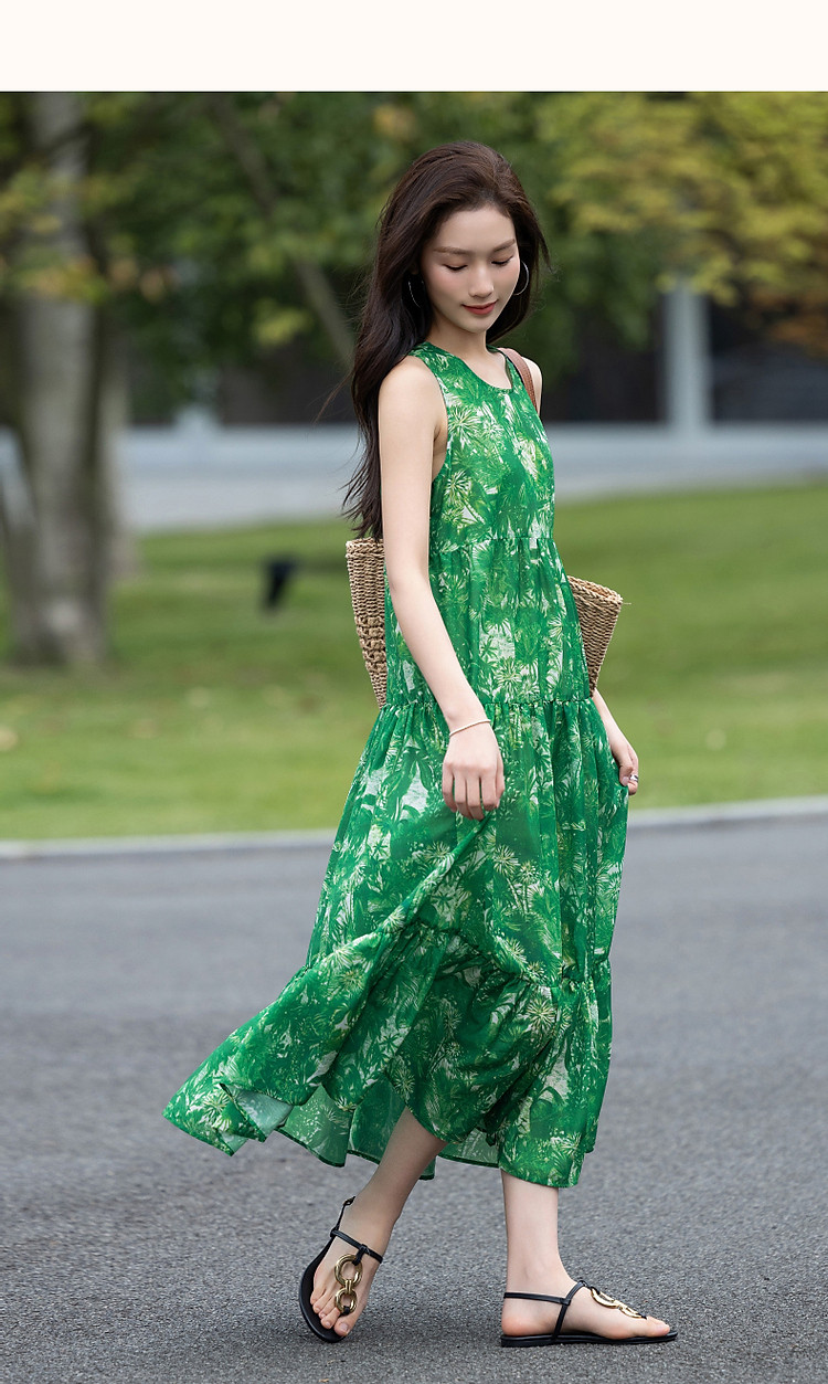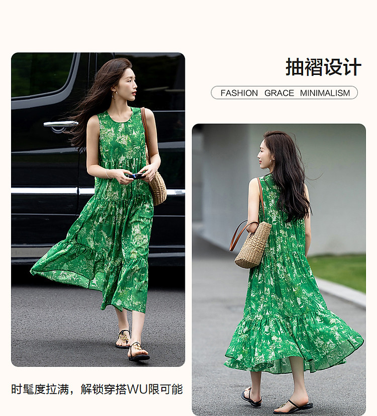 【去度假吧系列】夏法式圆领抽褶a字大摆印花连衣裙女中长款 011969