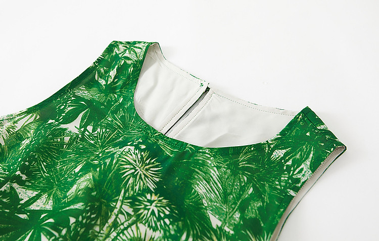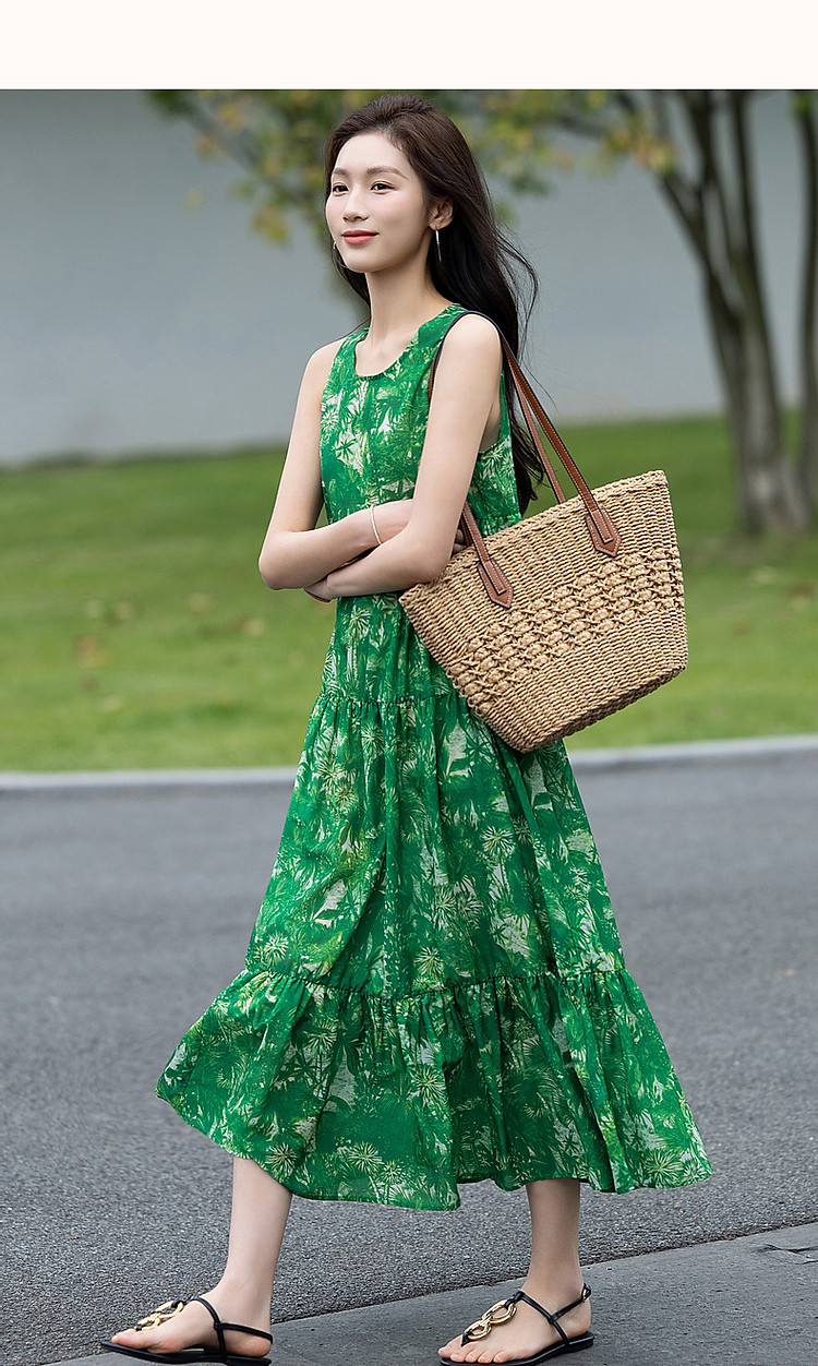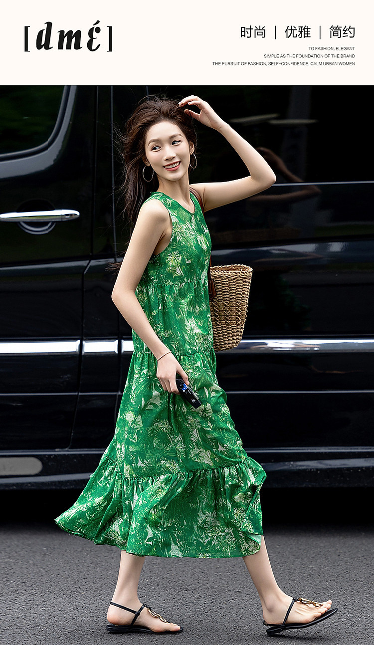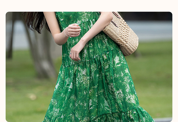 商品名称:【去度假吧系列】夏法式圆领抽褶a字大摆印花连衣裙女中长款 011969