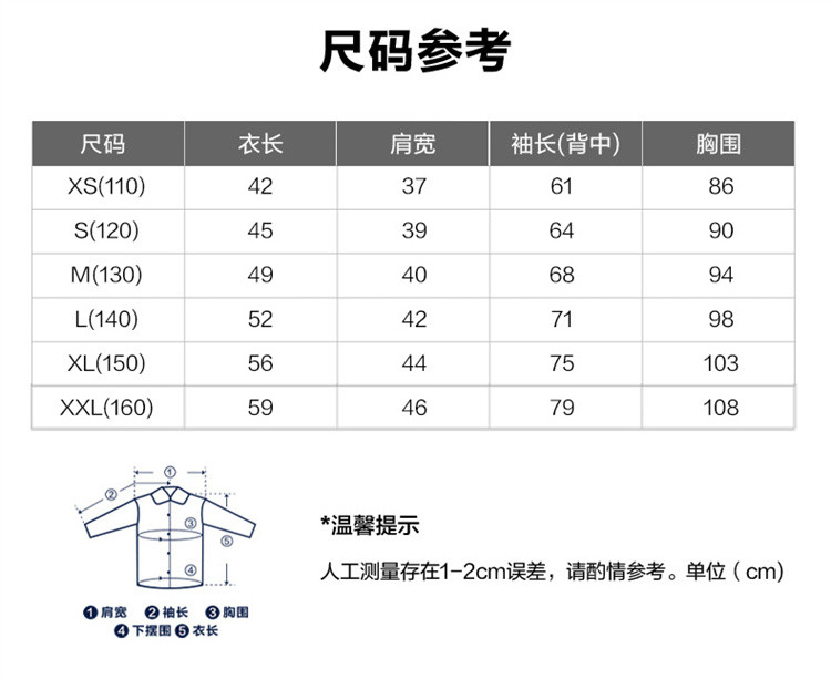 | 110CM(XS) | 42 | 37 | 110CM | 61 | 4-5岁 | 86 | 110/60 |