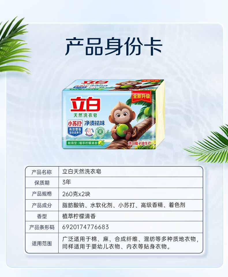商品名称:立白天然小苏打洗衣皂肥皂260g*2块