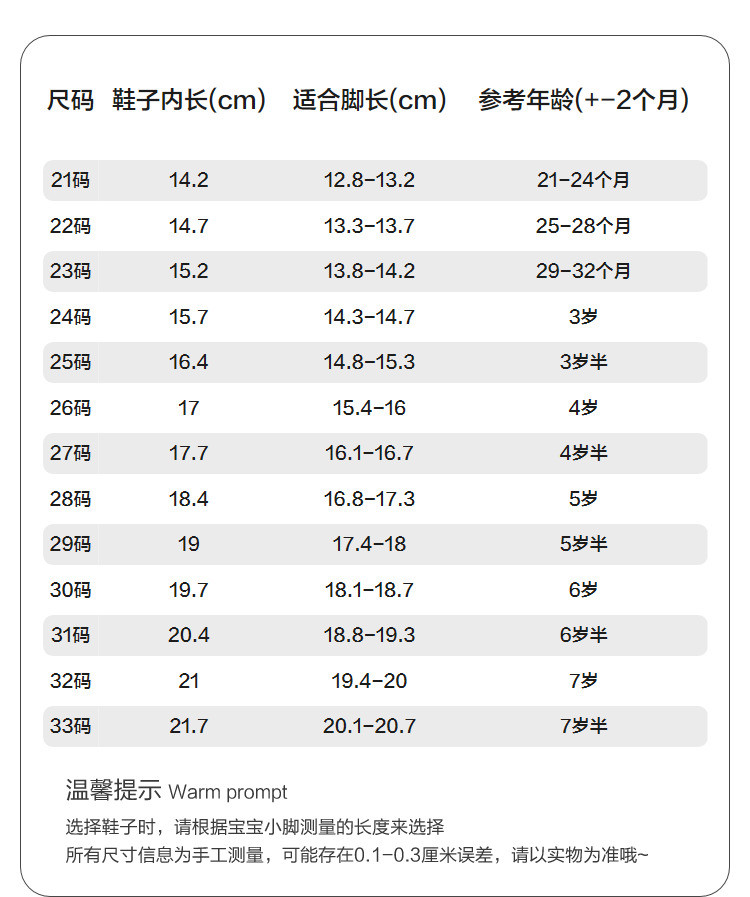 | 21码(脚长13/内长14.2) | 21 | 13 | 14.2 |