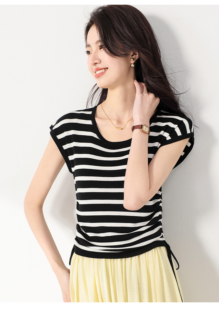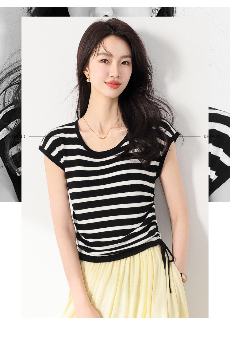 【含桑蚕丝】经典条纹圆领夏季薄款抽绳下摆针织打底衫短袖T恤 153875