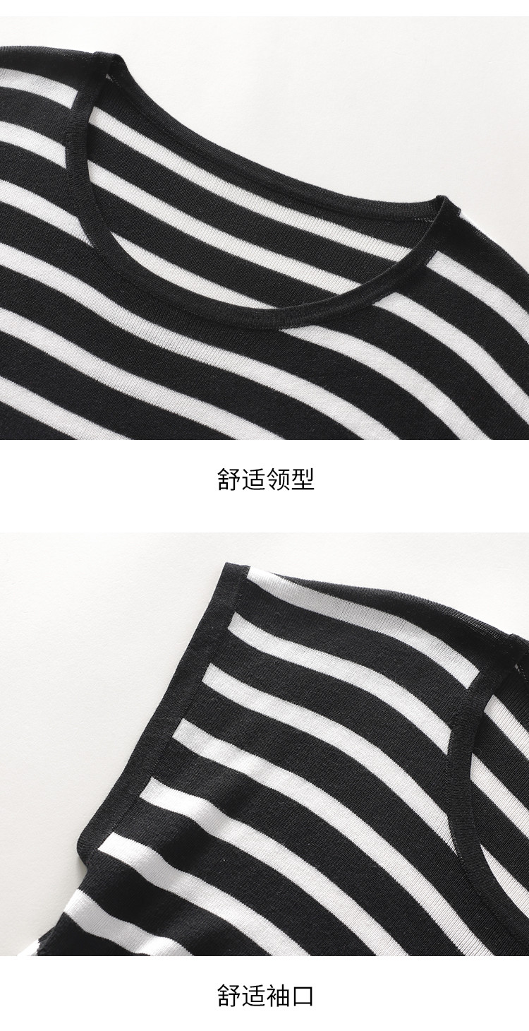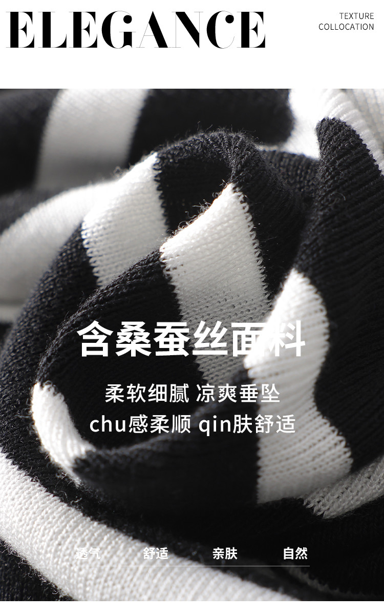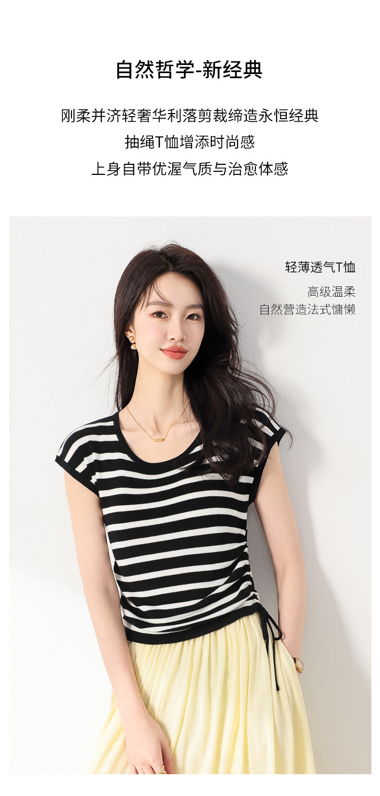 商品名称:【含桑蚕丝】经典条纹圆领夏季薄款抽绳下摆针织打底衫短袖T恤 153875