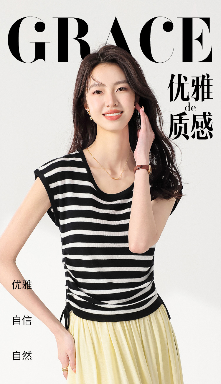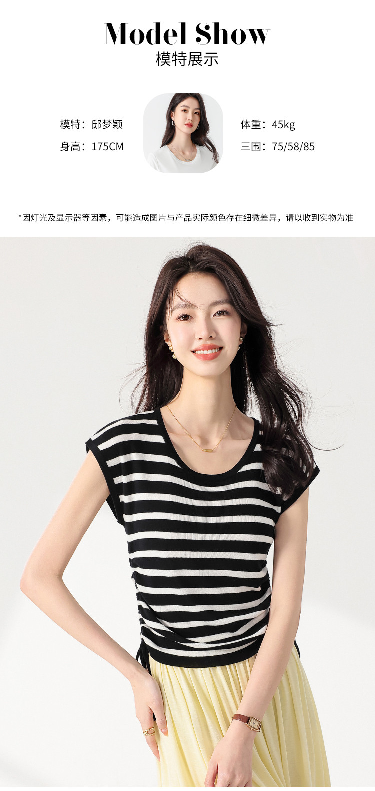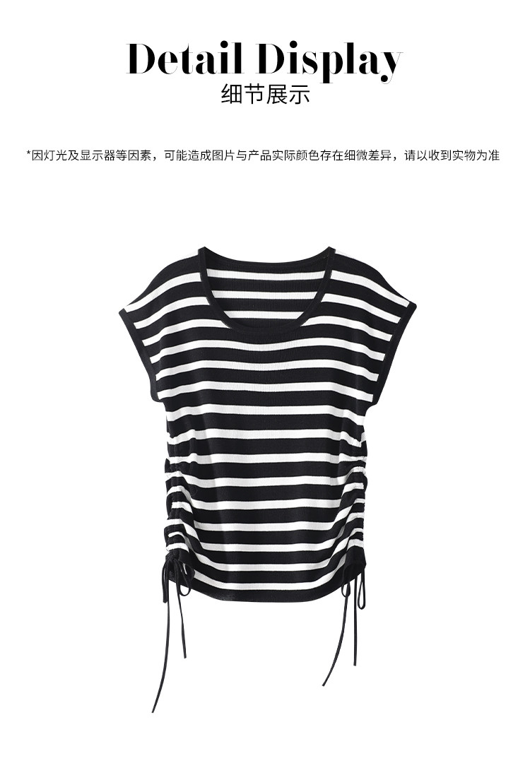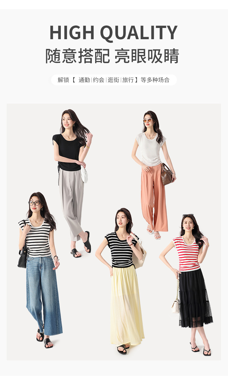 商品名称:【含桑蚕丝】经典条纹圆领夏季薄款抽绳下摆针织打底衫短袖T恤 153875