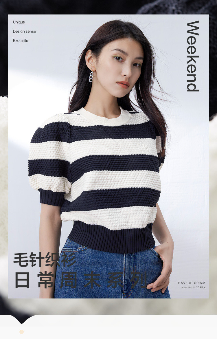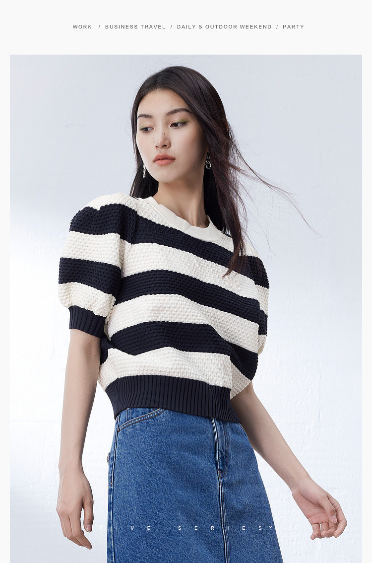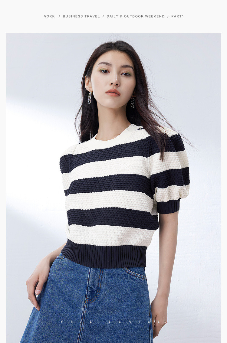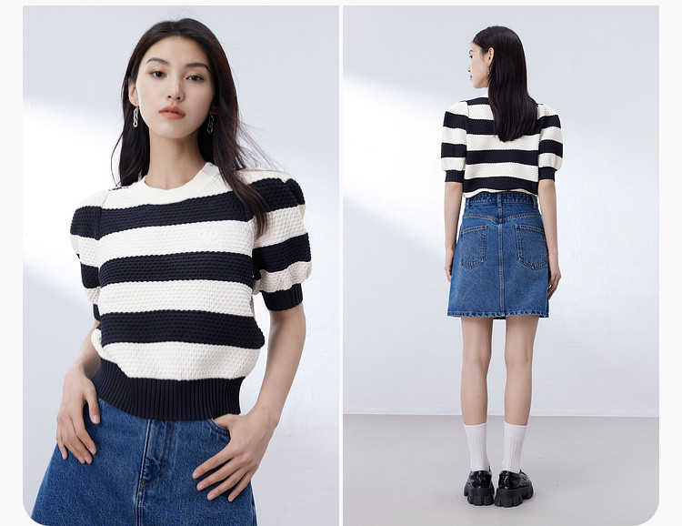 时尚撞色条纹针织上衣女夏季复古泡泡袖显瘦气质圆领短款上衣女 584387
