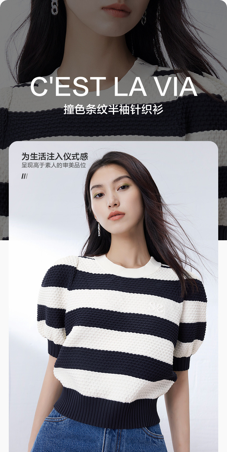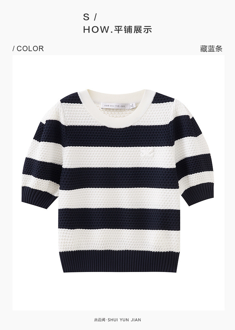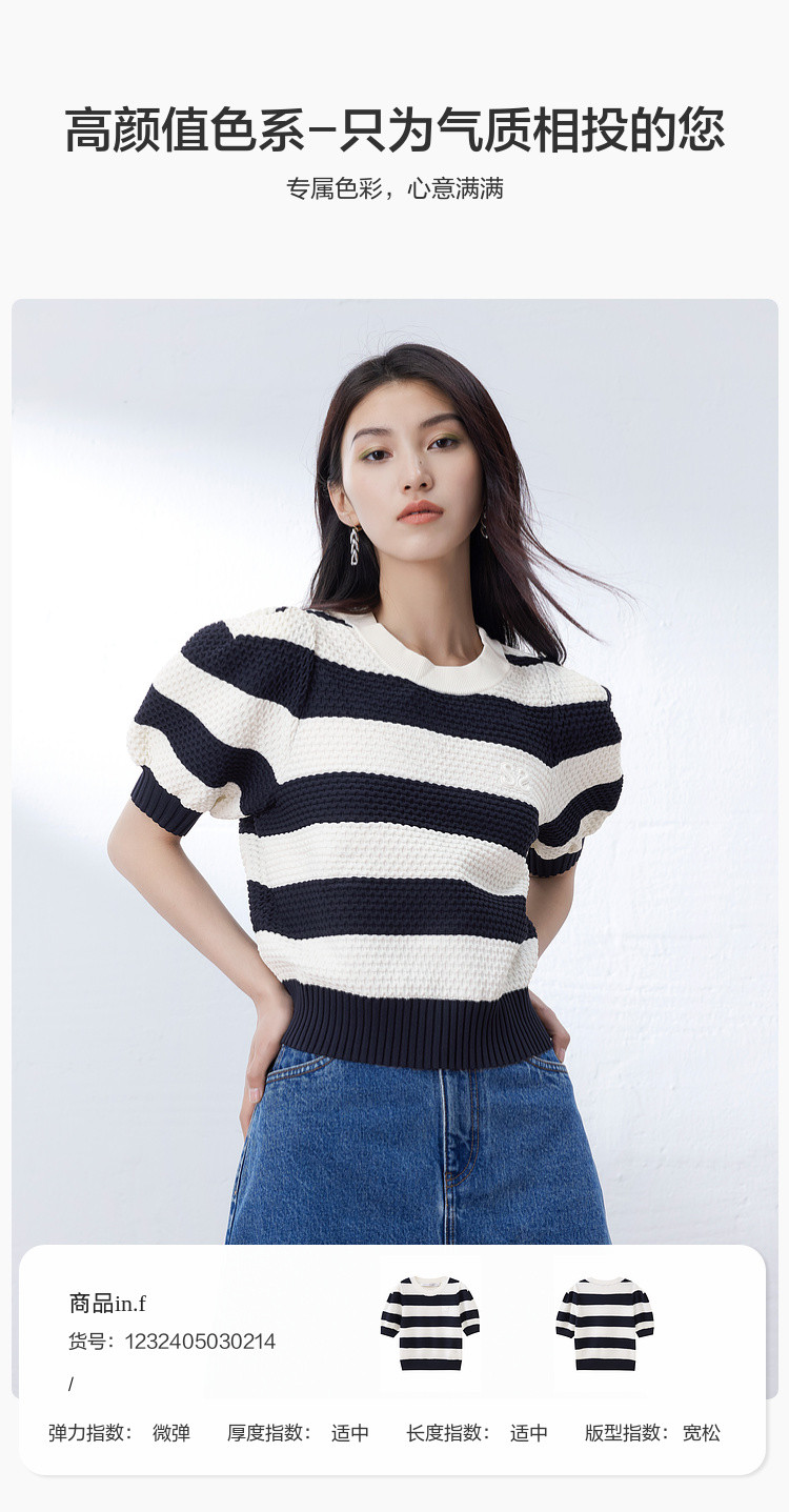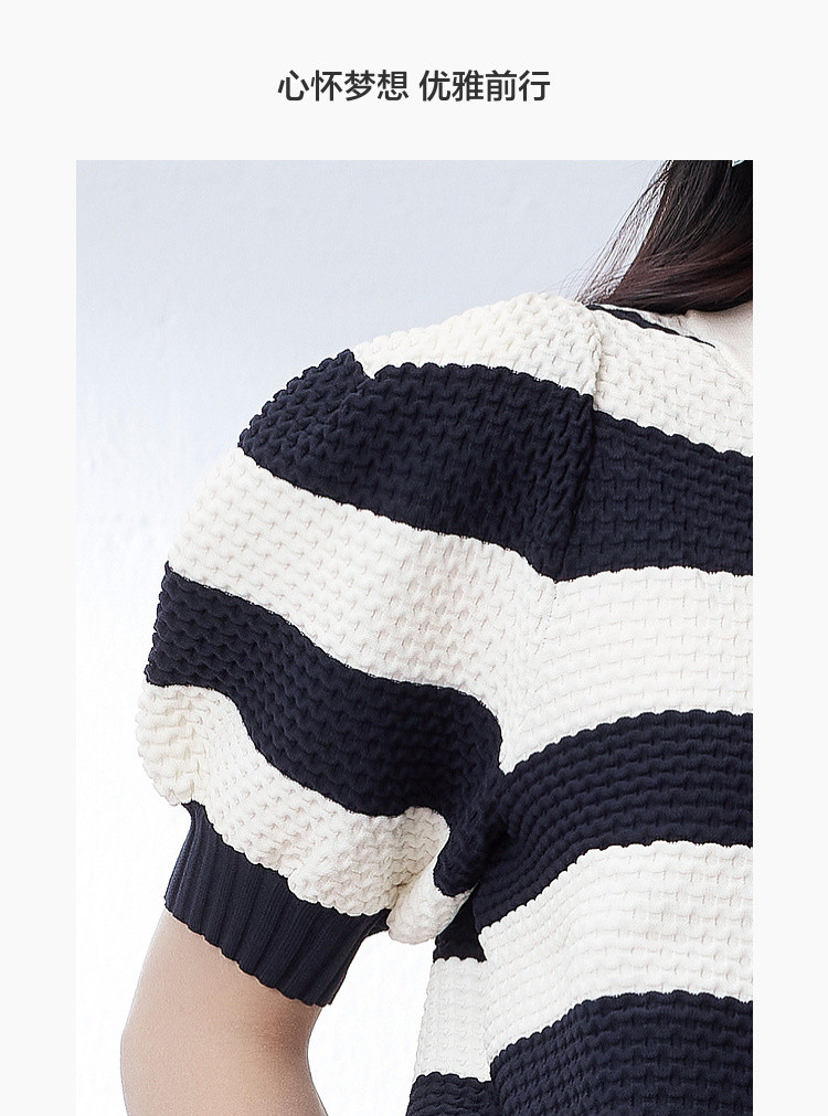 商品名称:时尚撞色条纹针织上衣女夏季复古泡泡袖显瘦气质圆领短款上衣女 584387