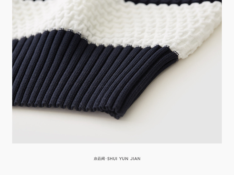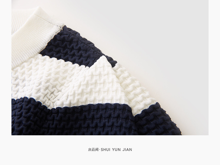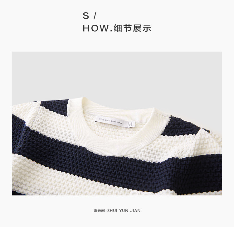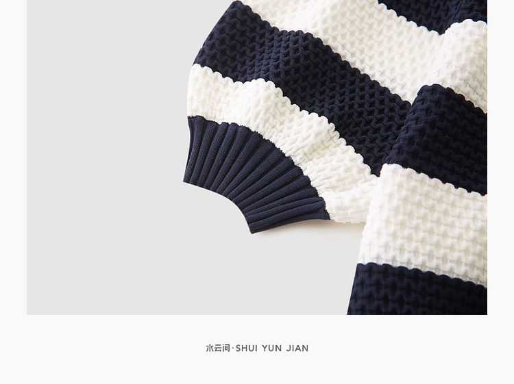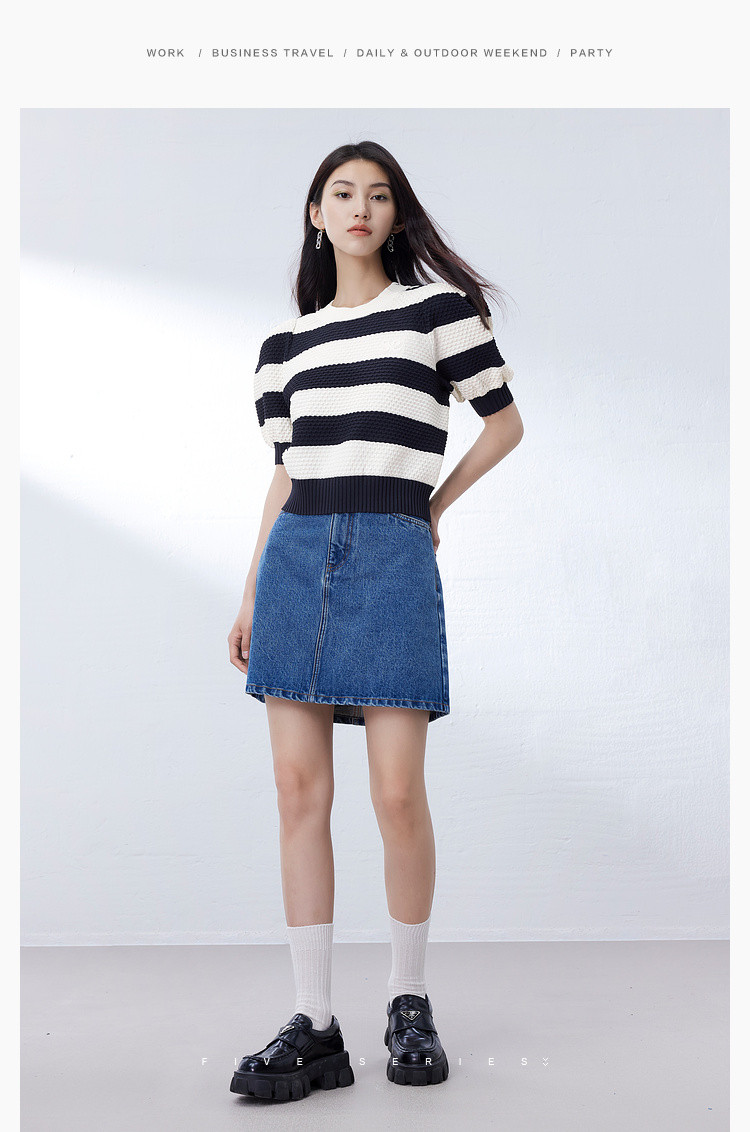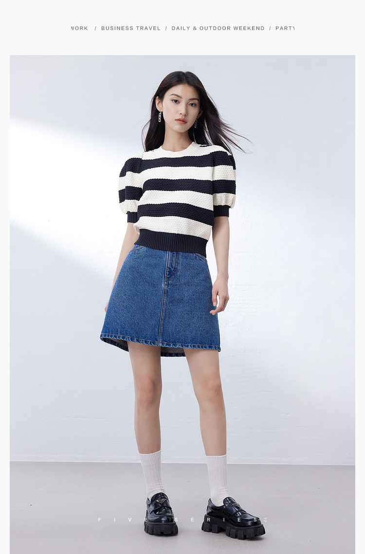 商品名称:时尚撞色条纹针织上衣女夏季复古泡泡袖显瘦气质圆领短款上衣女 584387