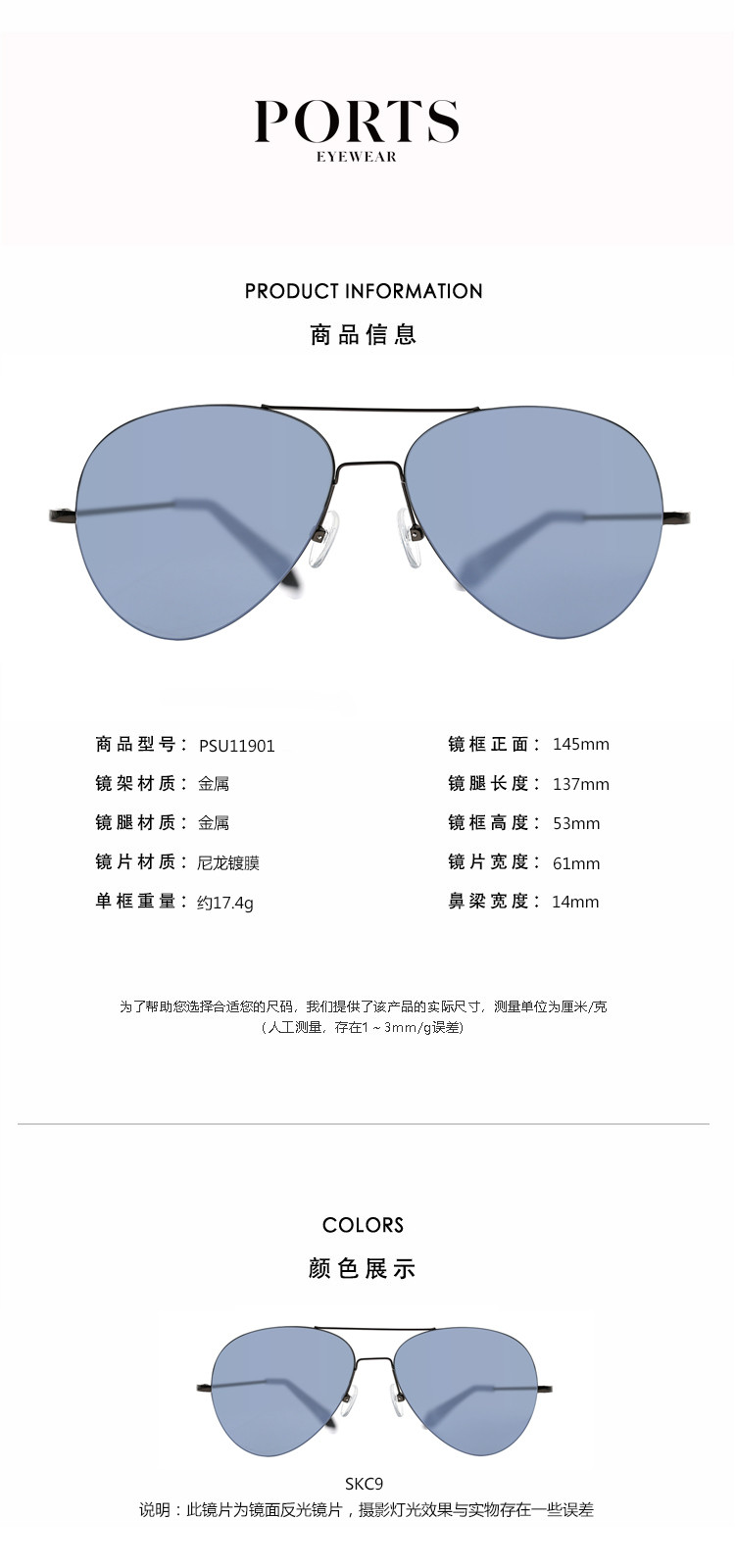 商品名称:PORTS中性款时尚个性纤细飞行员框男女款太阳镜PSU11901 605386